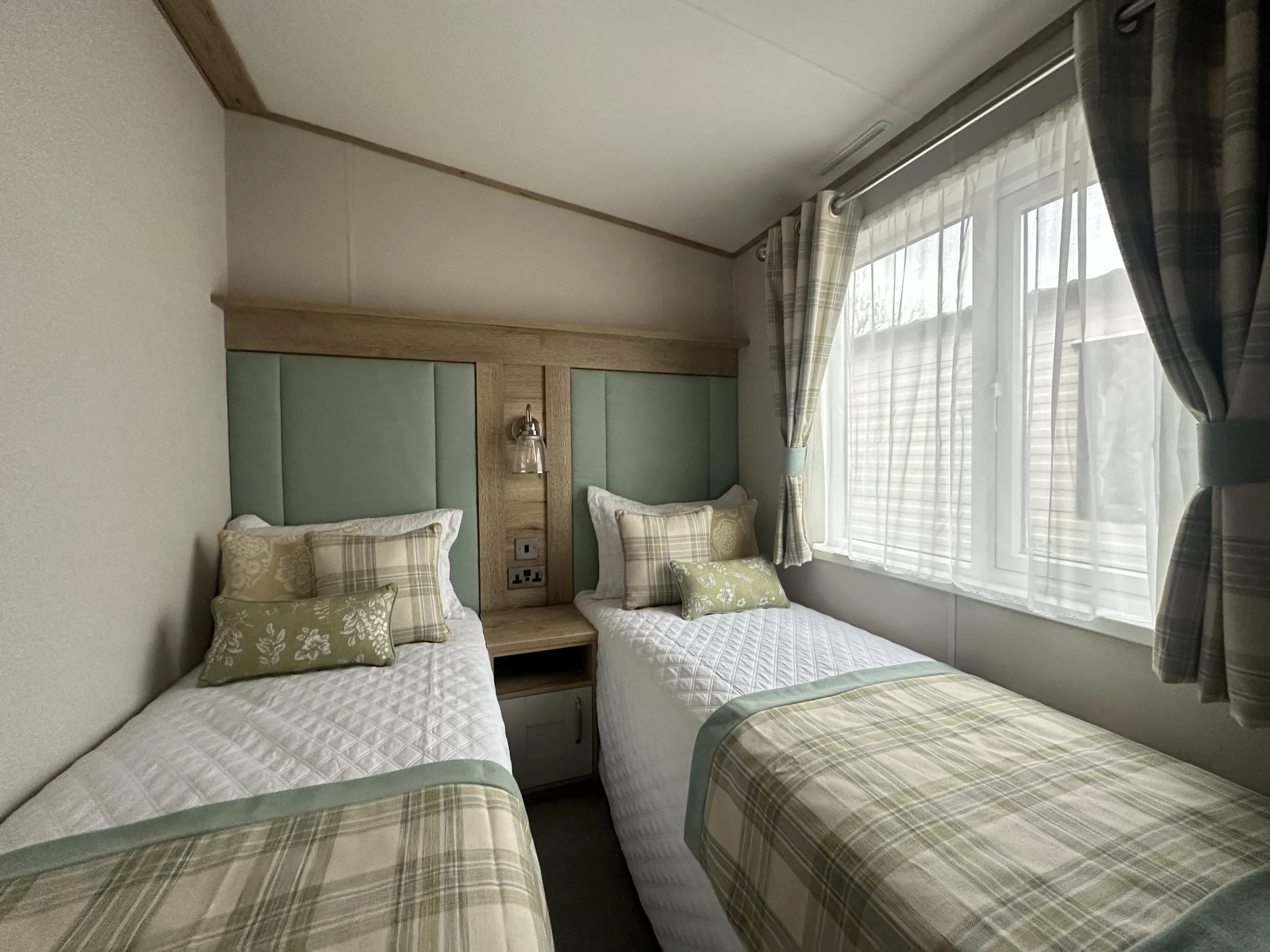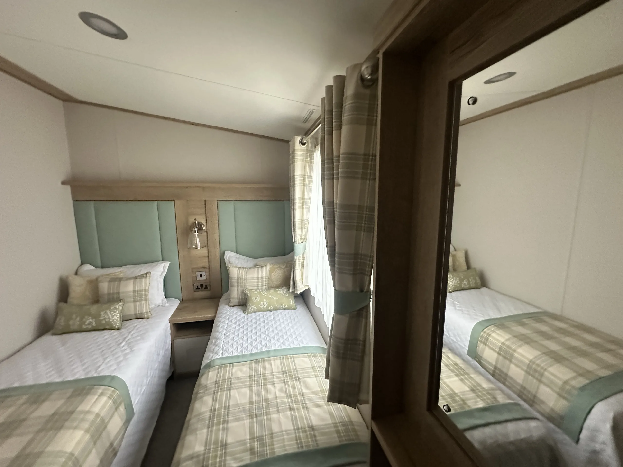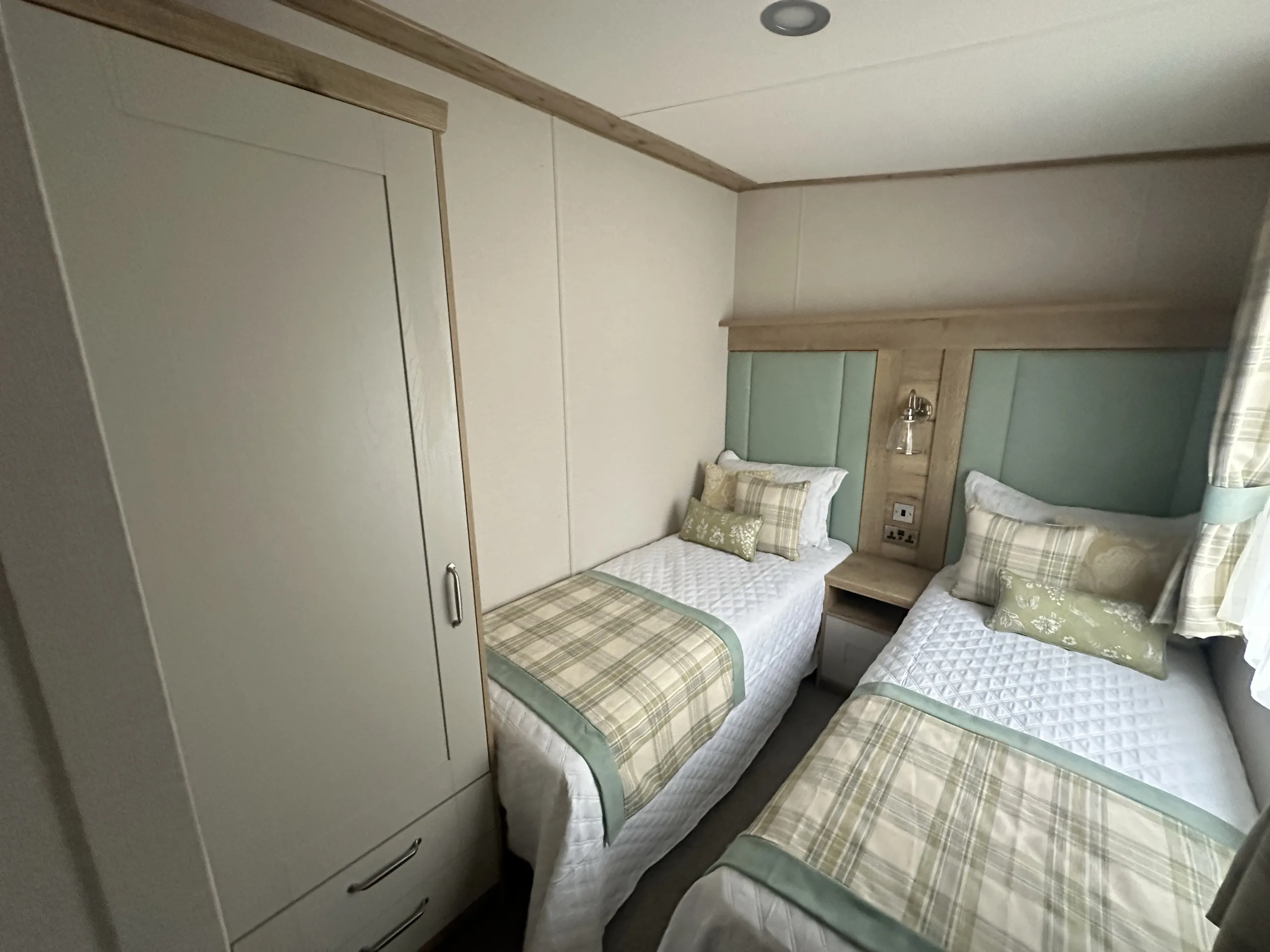 The luxurious master bedroom boasts a lift-up king-size bed, generous storage, and a stylish en-suite with a walk-in shower. The family bathroom is equally impressive, offering a spacious walk-in shower and ample storage, ensuring ultimate comfort for all.