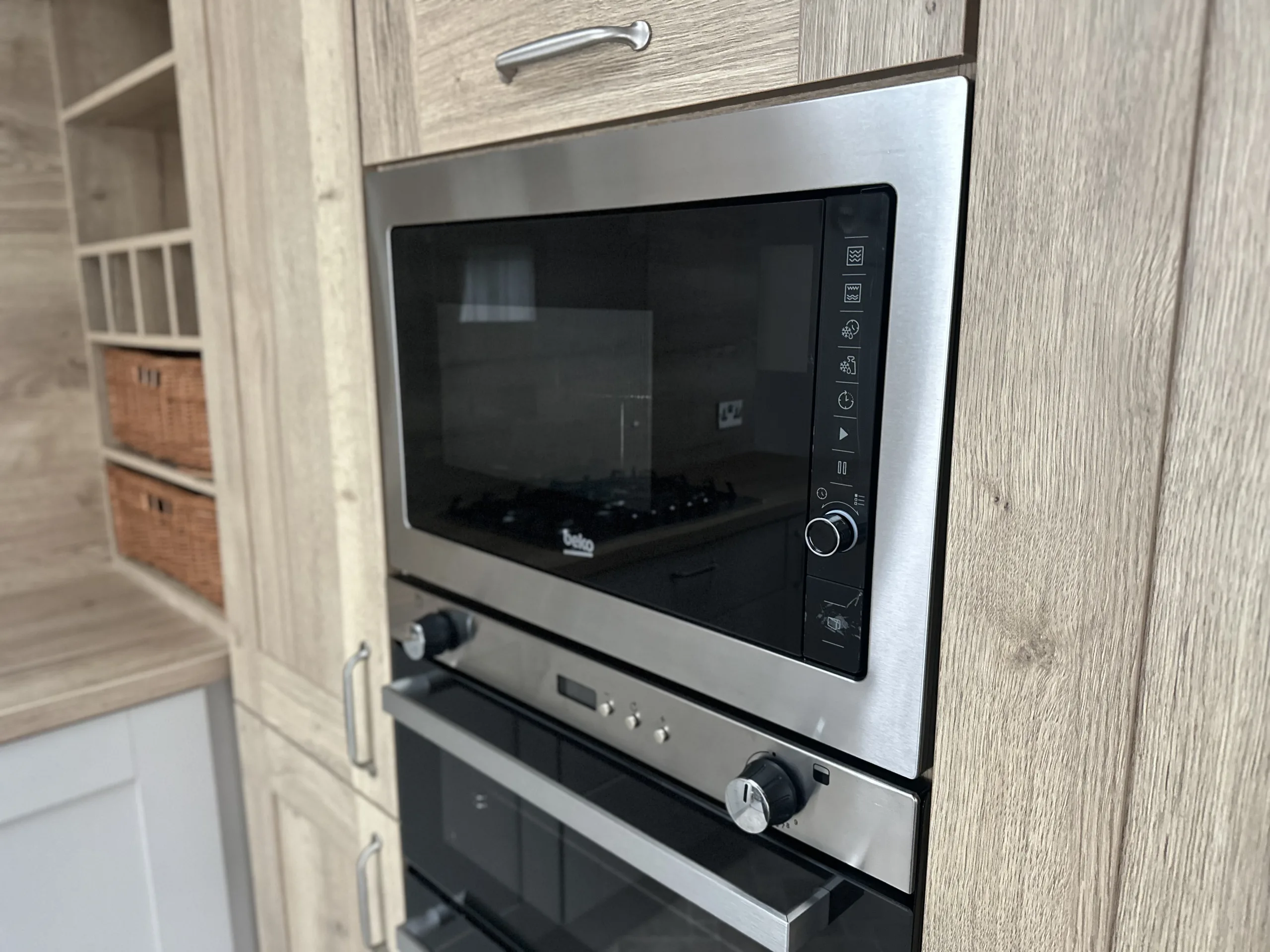 The spacious lounge is a haven of comfort, featuring plush sofas, a cozy electric log-burner style fire, and French doors that flood the space with natural light. The shaker-style kitchen is equipped with high-end appliances, while the elegant dining area creates the perfect setting for memorable meals.