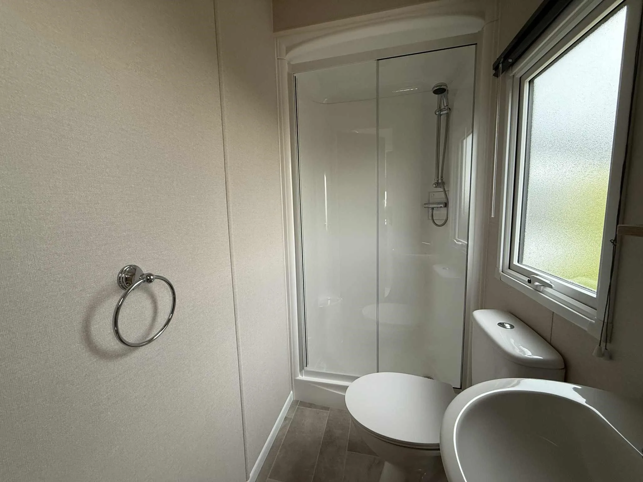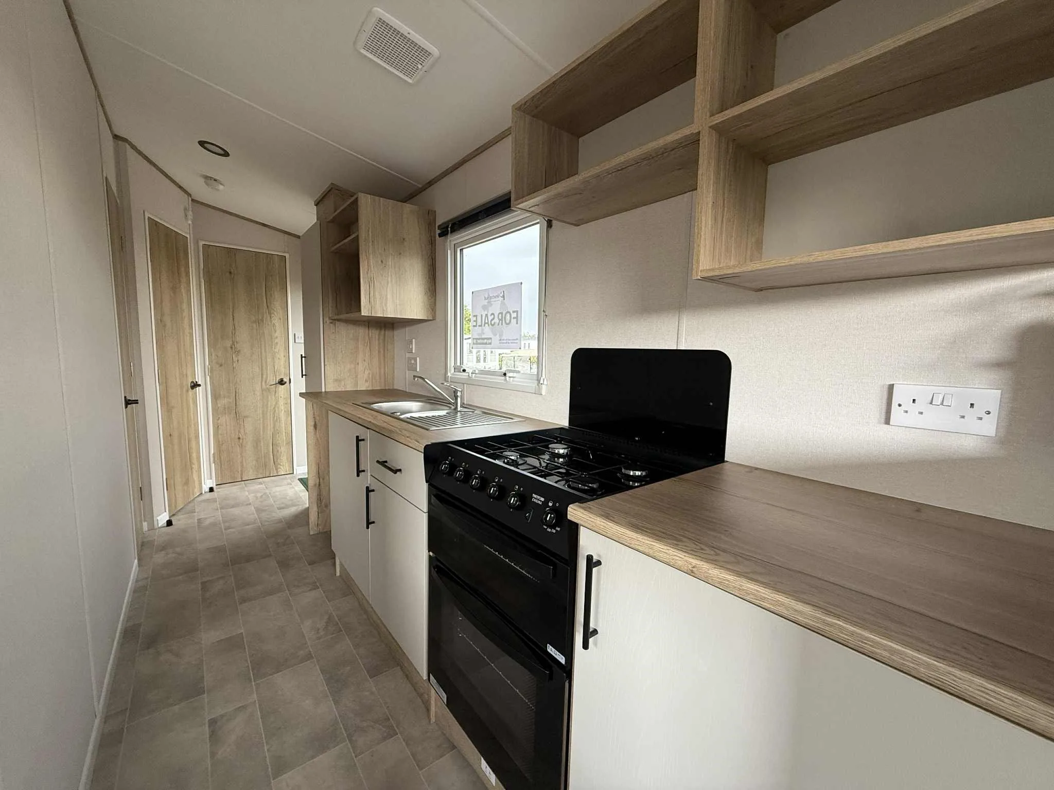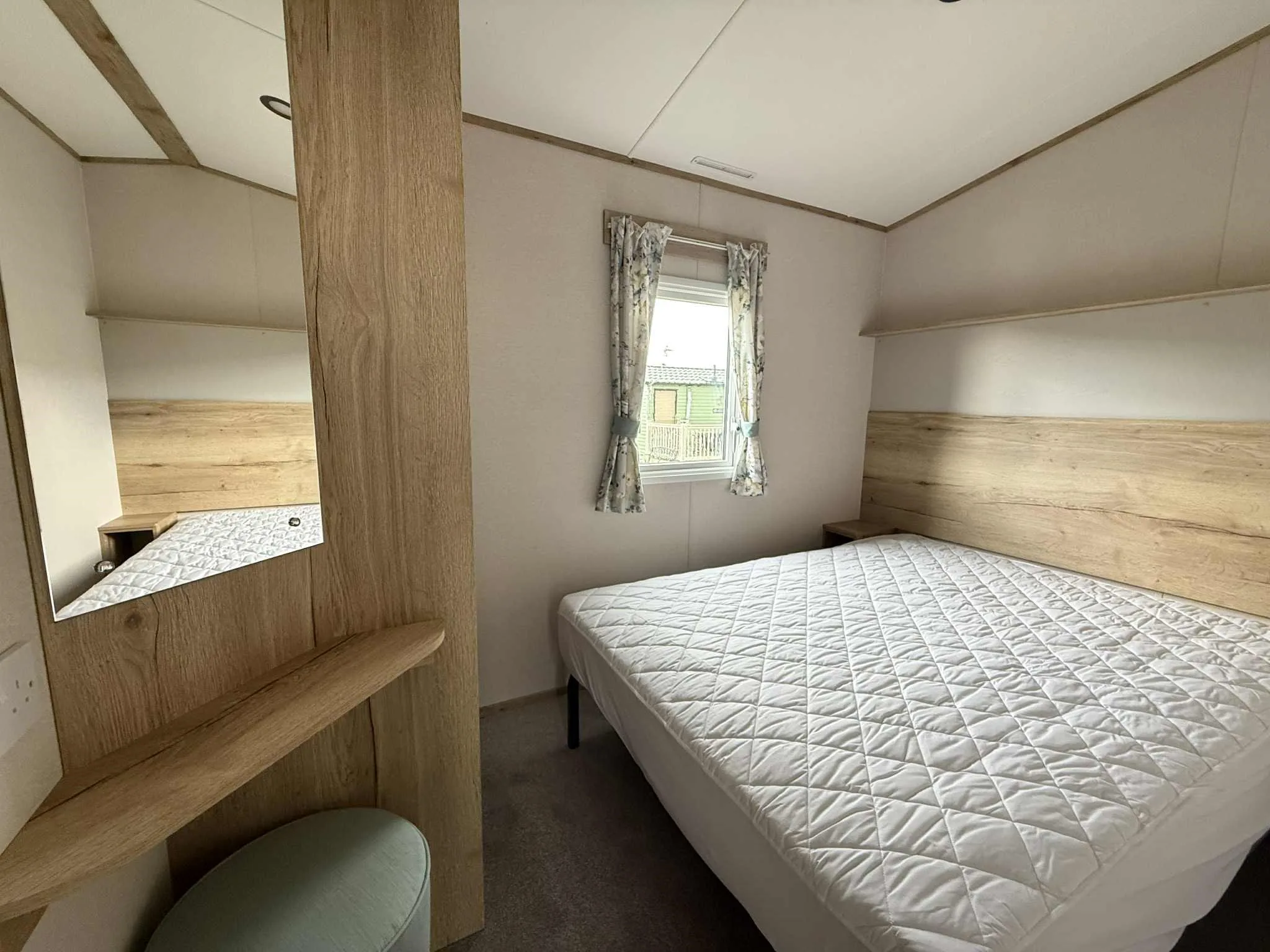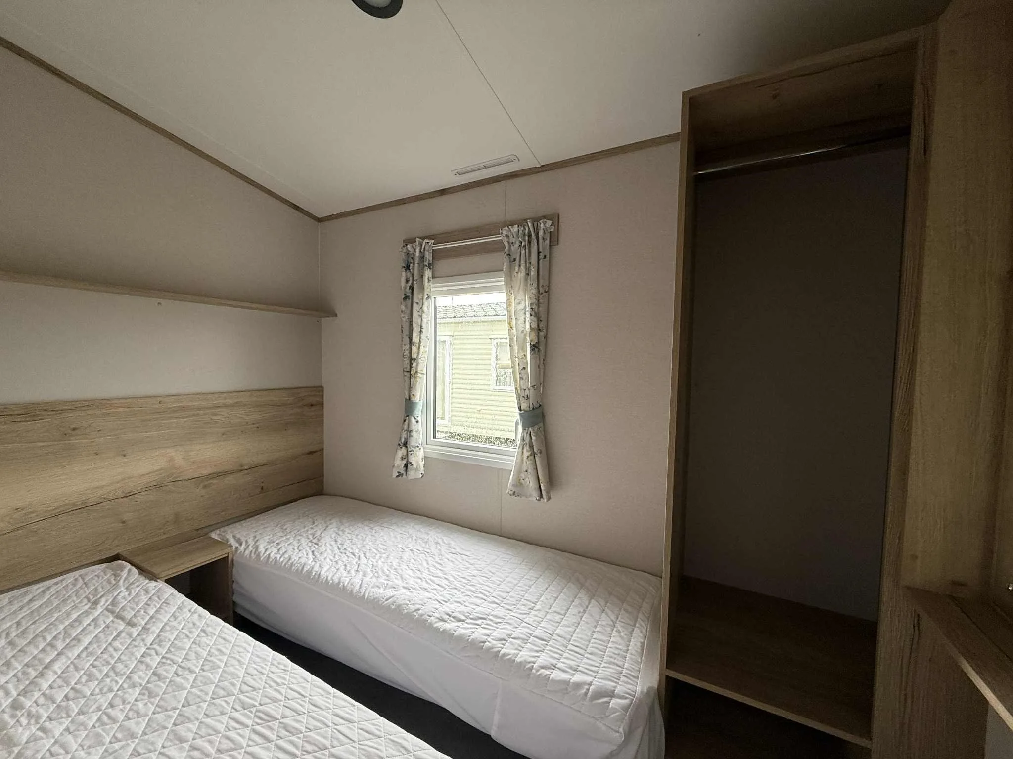 The caravan features a large double bedroom with oak effect finishes, double bedside storage, and a spacious wardrobe. The twin room offers two full-size beds and plenty of storage. A fully fitted 3-piece bathroom including shower unit, wash basin and WC plus shelving for extra storage. Perfect for families or couples, this stylish, compact home is designed for both comfort and functionality.