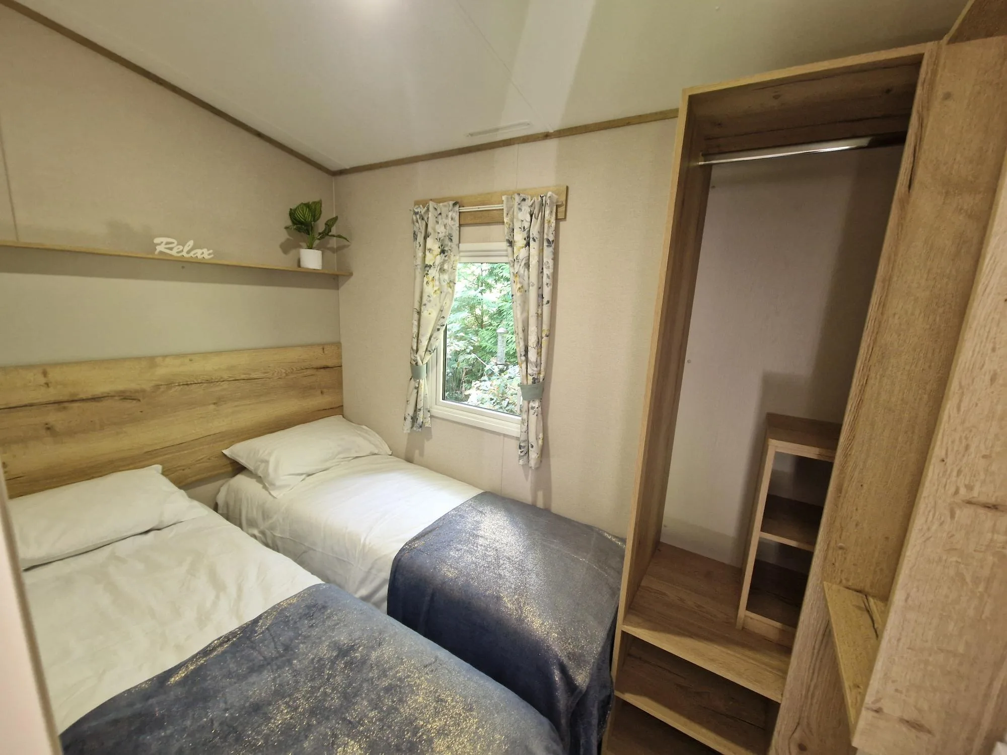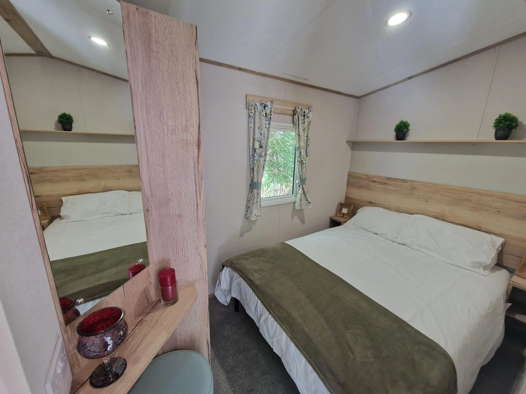 This static caravan features a large master bedroom with solid oak finishes, double bedside storage, and a spacious wardrobe. The twin room offers two full-size beds, a polished wood headboard, and again plenty of storage. A fully fitted 3-piece bathroom with shower unit, WC plus wash basin with shelving for extra storage. Perfect for families or couples, this stylish, compact home is designed for both comfort and functionality. Enquire today before this exceptional caravan is gone!