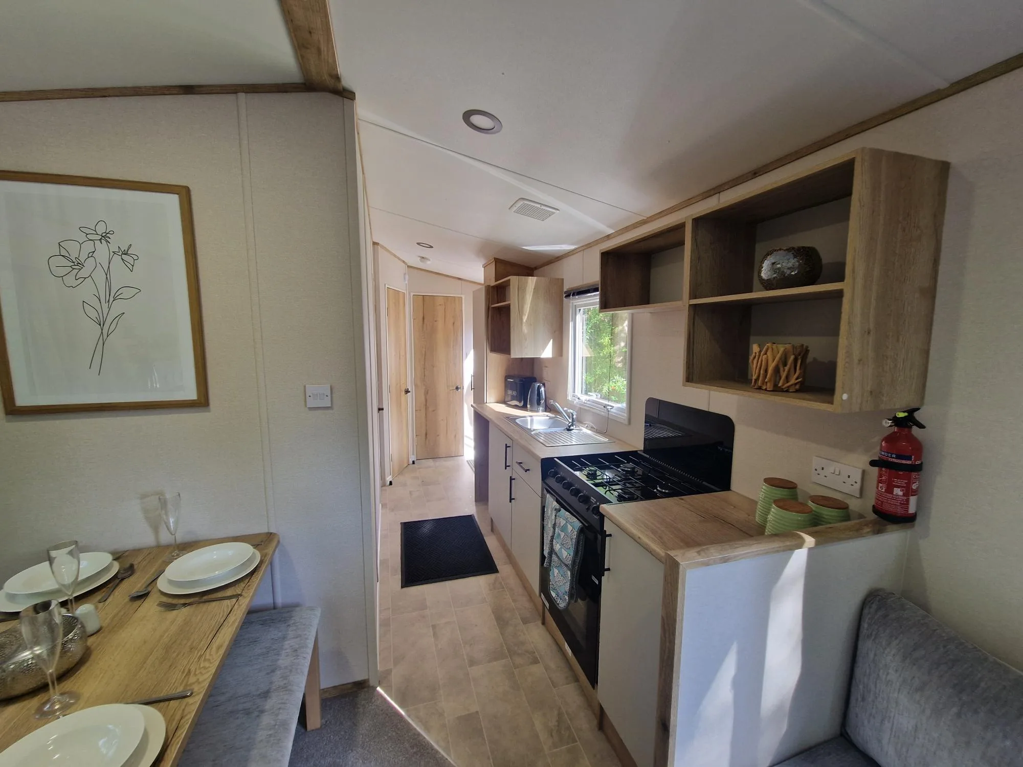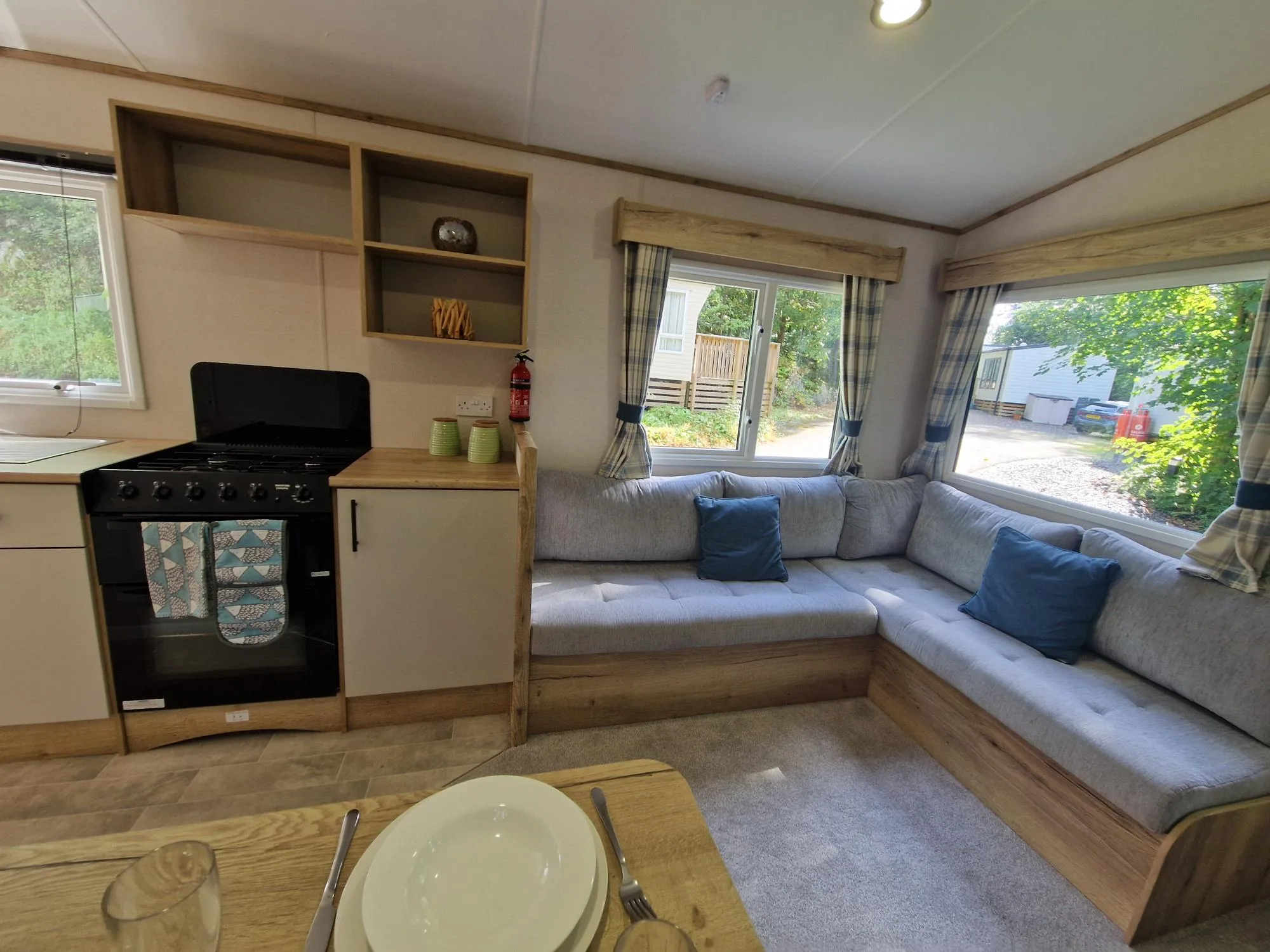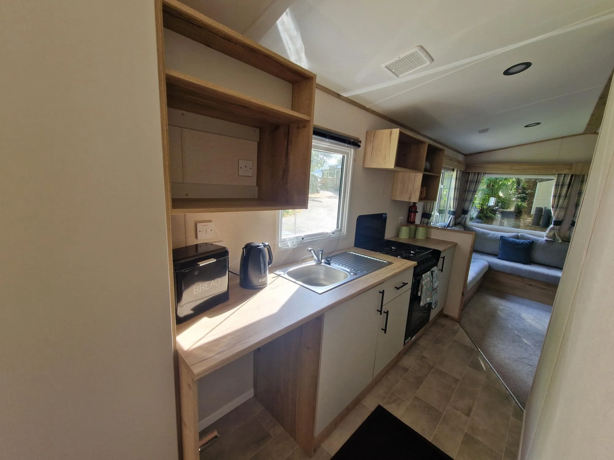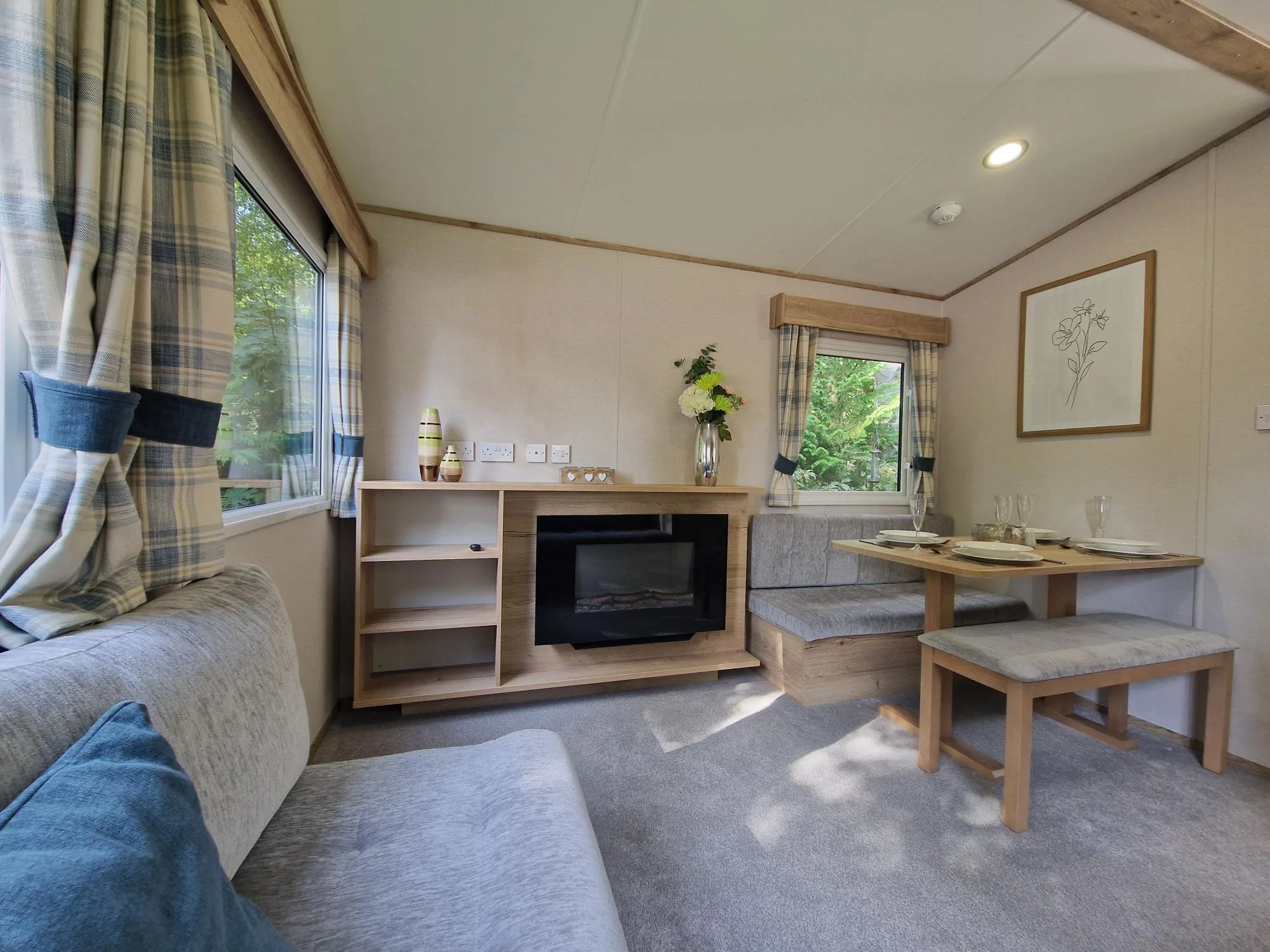 The well presented pre-owned ABI Coworth offers everything you need in a holiday home. With a soft, chunky sofa that converts to a double bed and an electric fire for added cosiness, the spacious living area creates a perfect atmosphere for relaxation. The fully fitted kitchen and dining space are ideal for real living, with a galley kitchen including oven hob, and overhead storage leading into a bright, open-plan living area filled with natural light from three large windows. The comfortable dining area seats four, with room for extra seating if required.