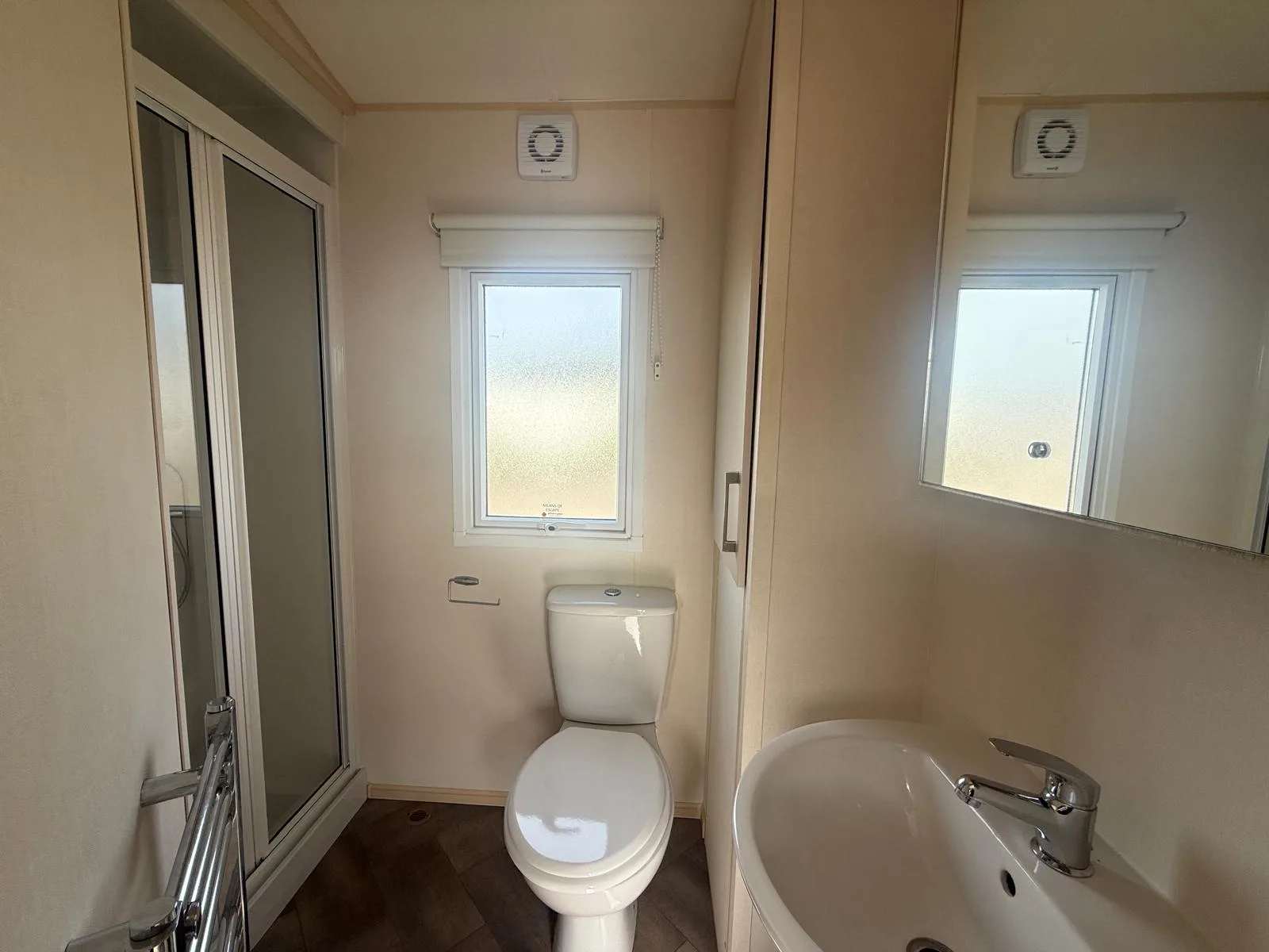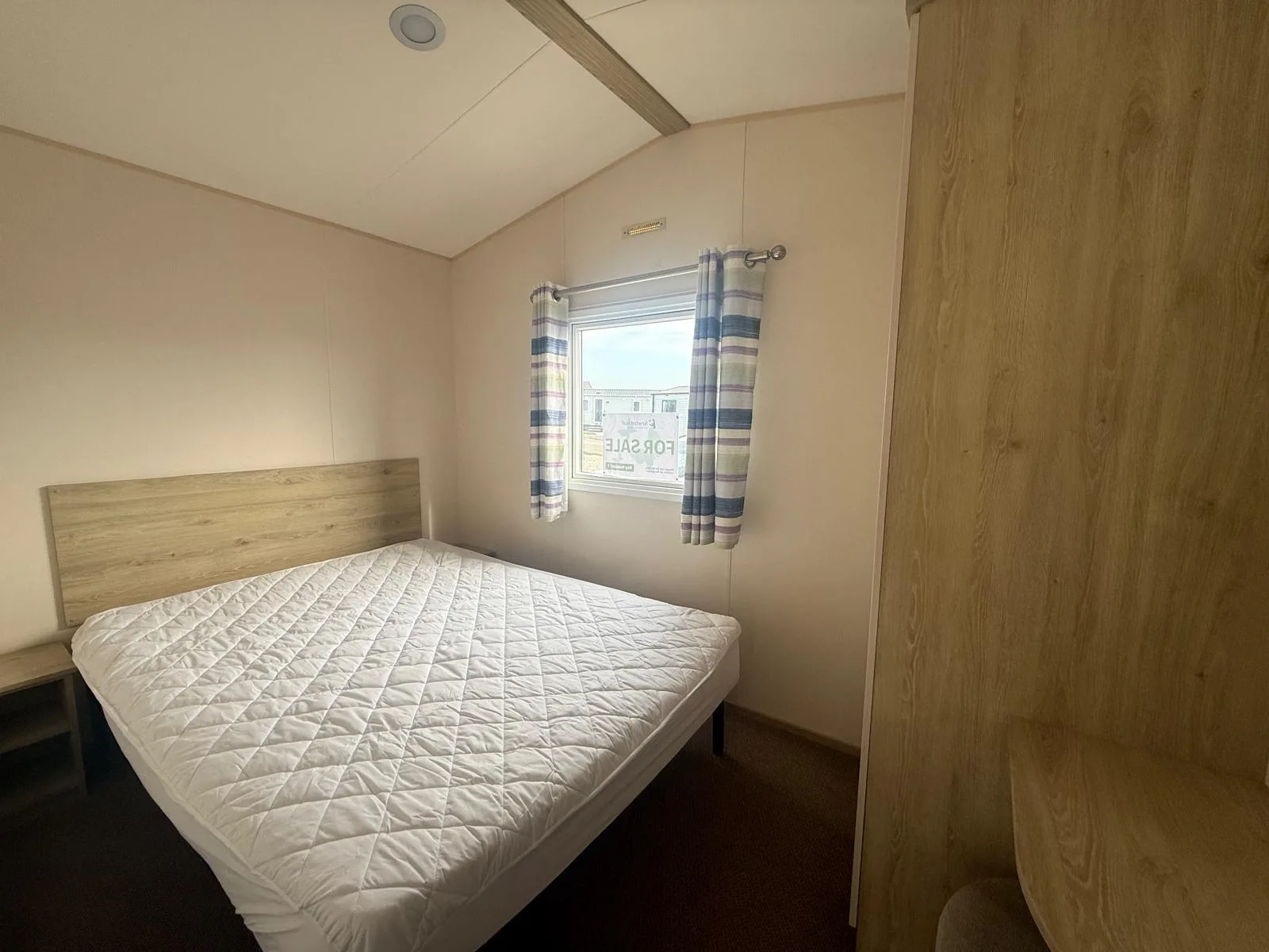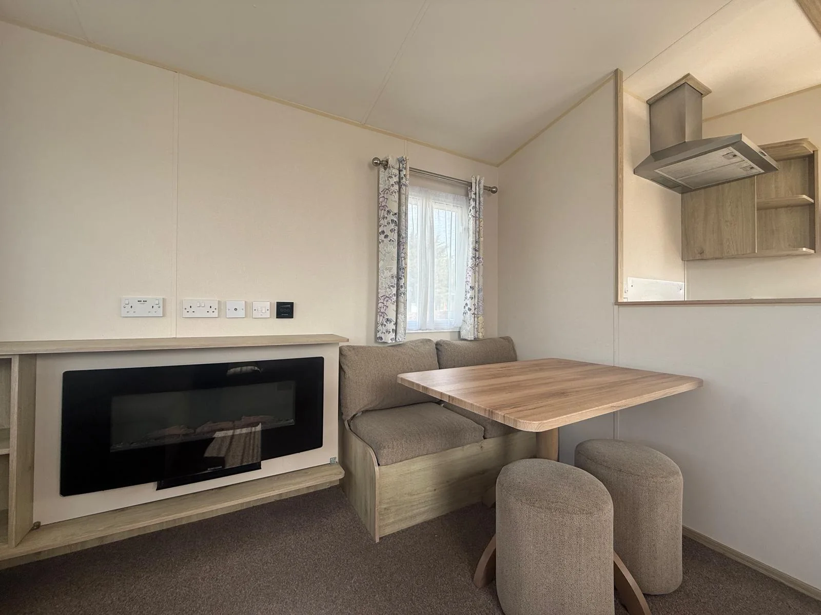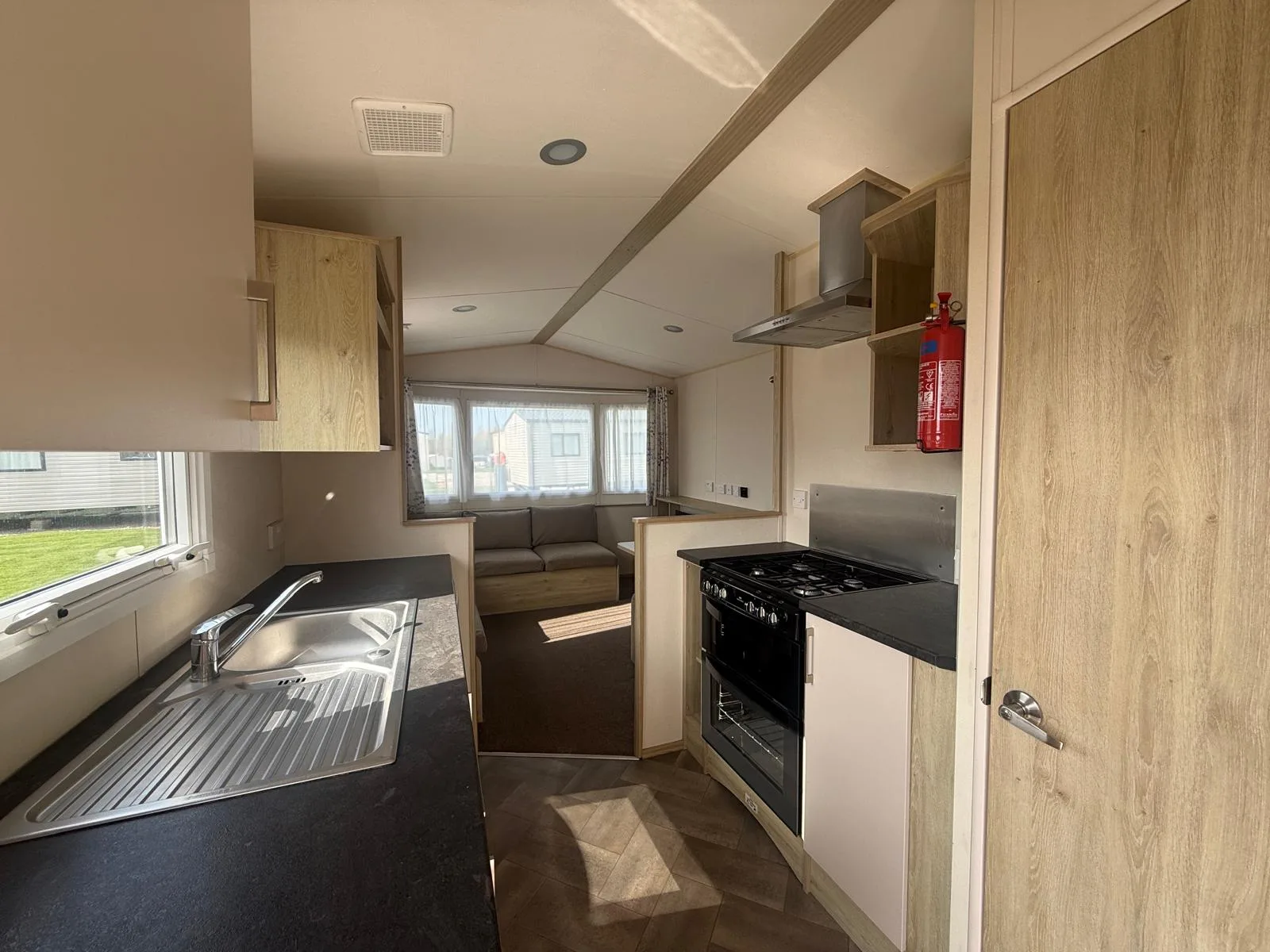 Inside, you’ll find a bright and welcoming open-plan lounge with wraparound seating, offering plenty of space to relax. The modern galley-style kitchen is both practical and well-equipped, making it easy to enjoy meals together. The master bedroom provides a comfortable retreat and features its own vanity area with a stool, giving you a dedicated space to get ready.