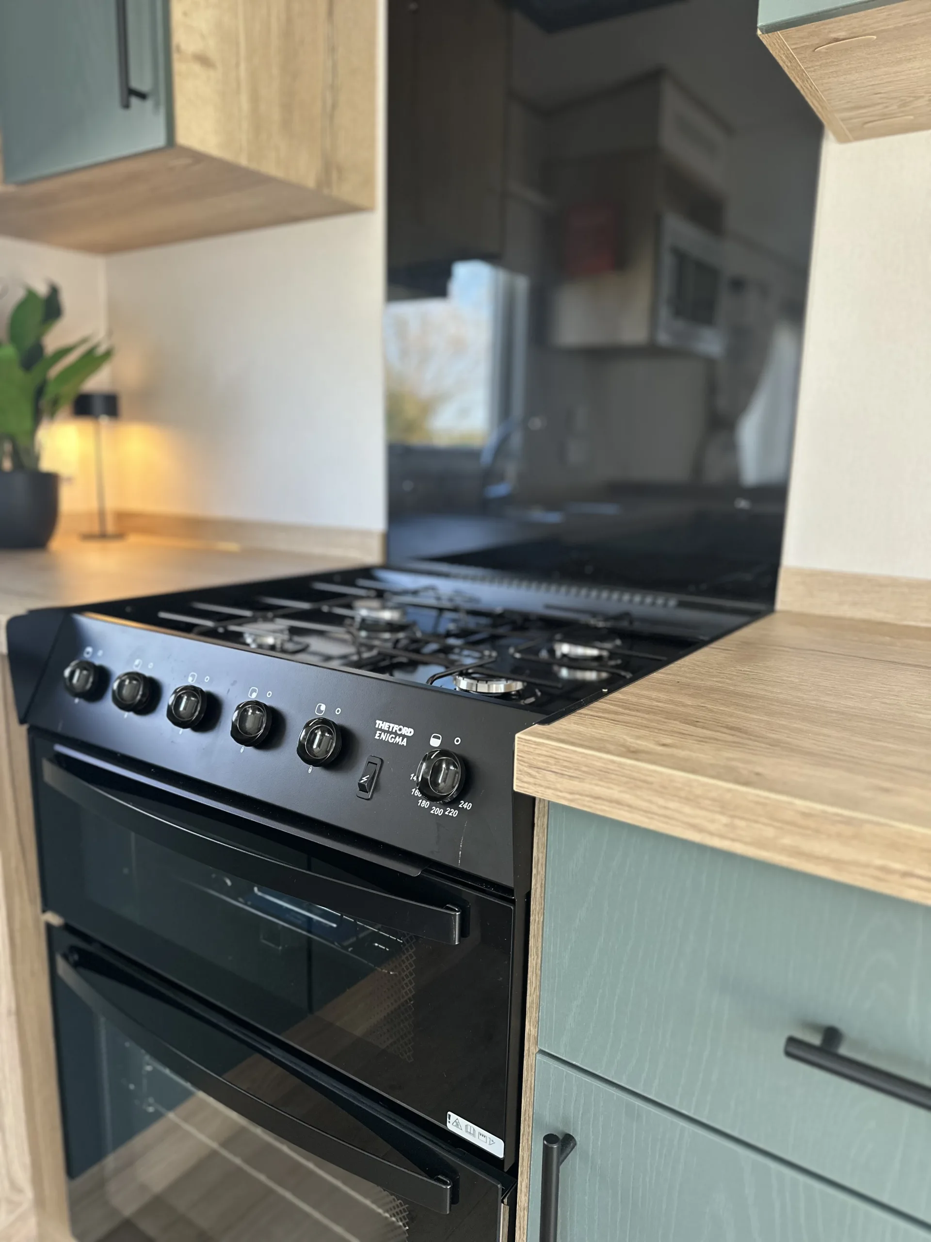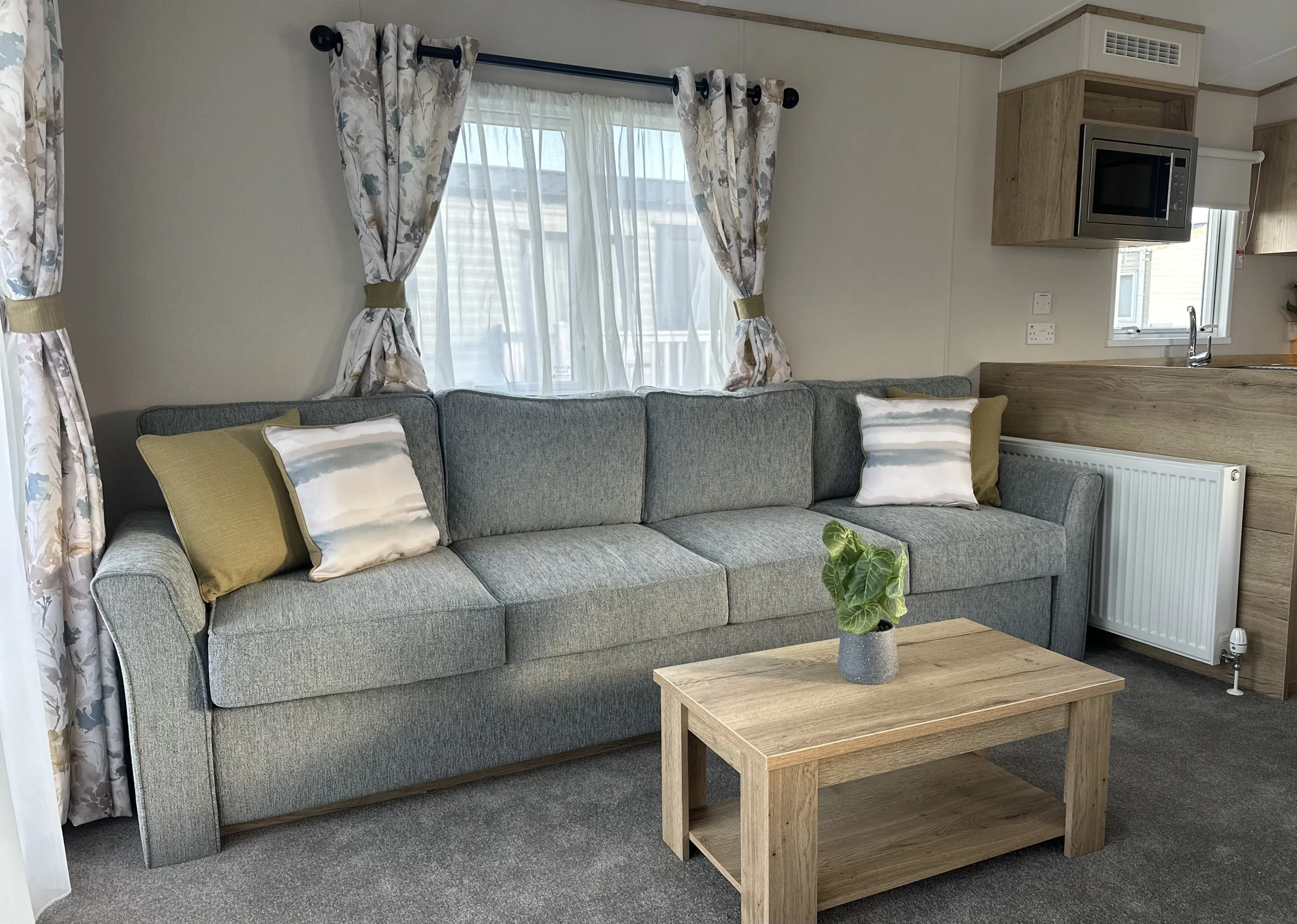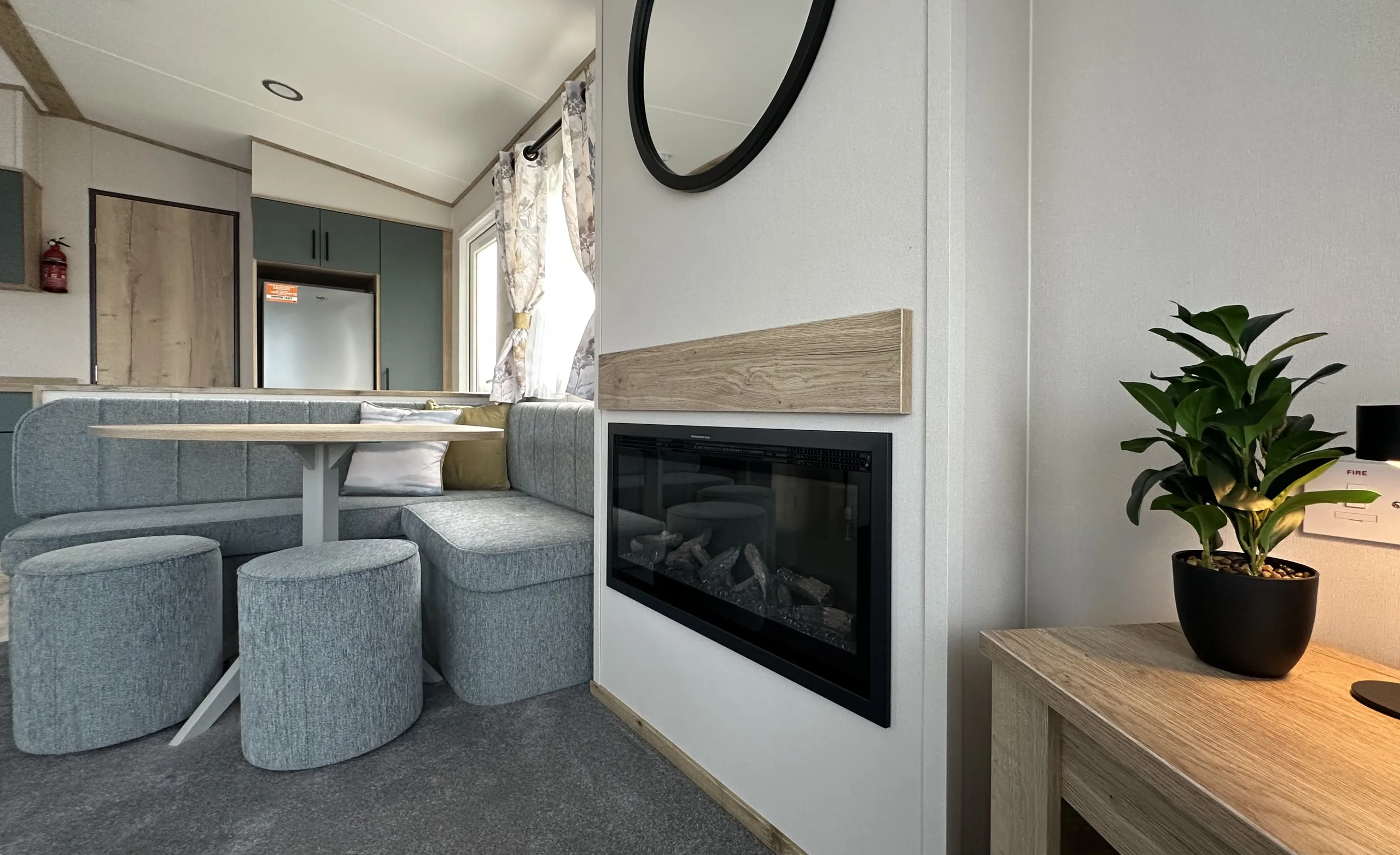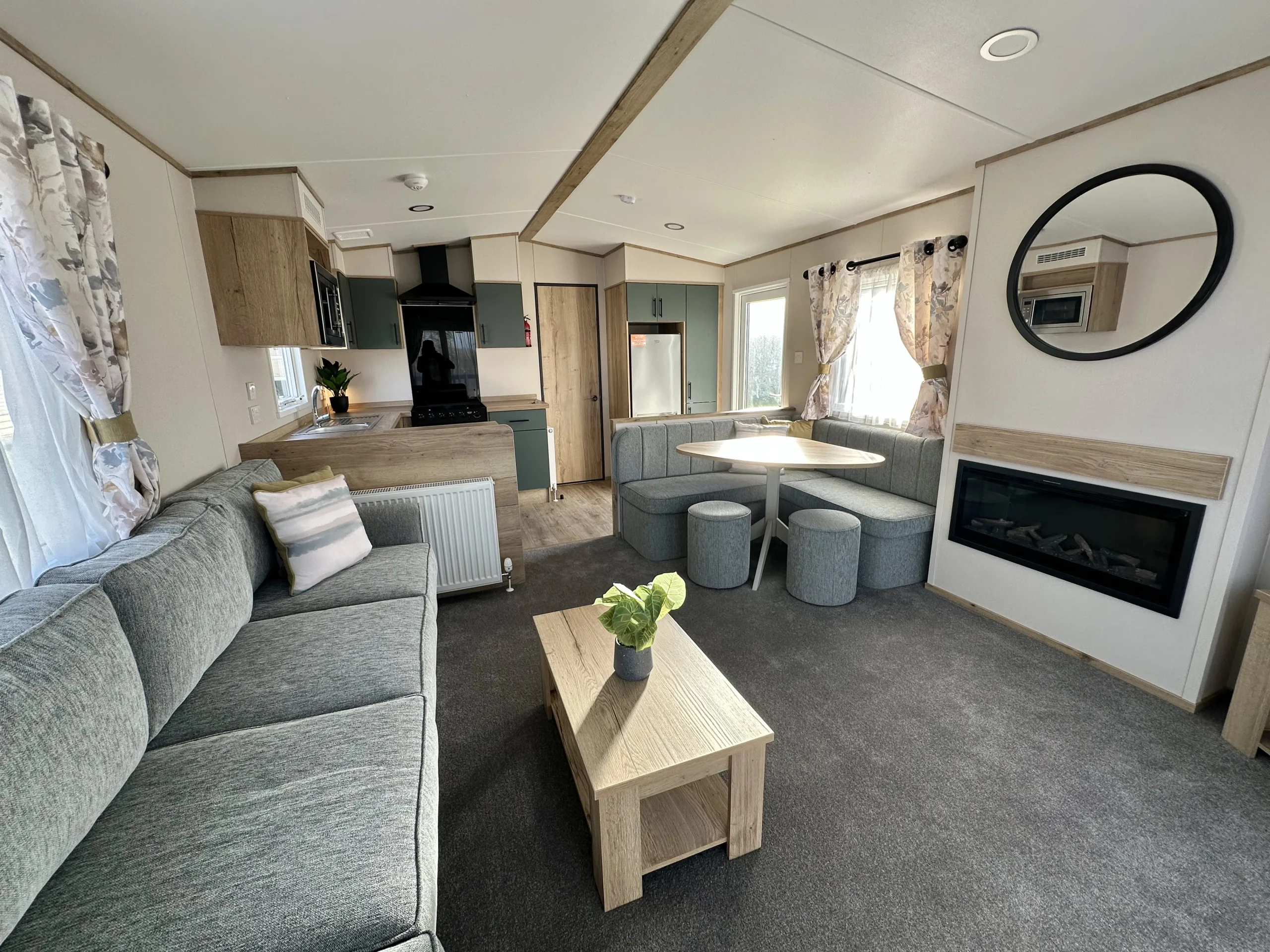 The 2025 ABI Oak caravan offers a wonderful light open-plan living space with a bright airy feel. New for 2025, this contemporary caravan has had an updated colour scheme of warm terracotta and sage tones. The spacious living area offers an electric fireplace and a comfortable L shaped sofa, perfect for relaxing and socialising. Carpet underlay is featured throughout the Oak static caravan adding comfort and a homely feel.