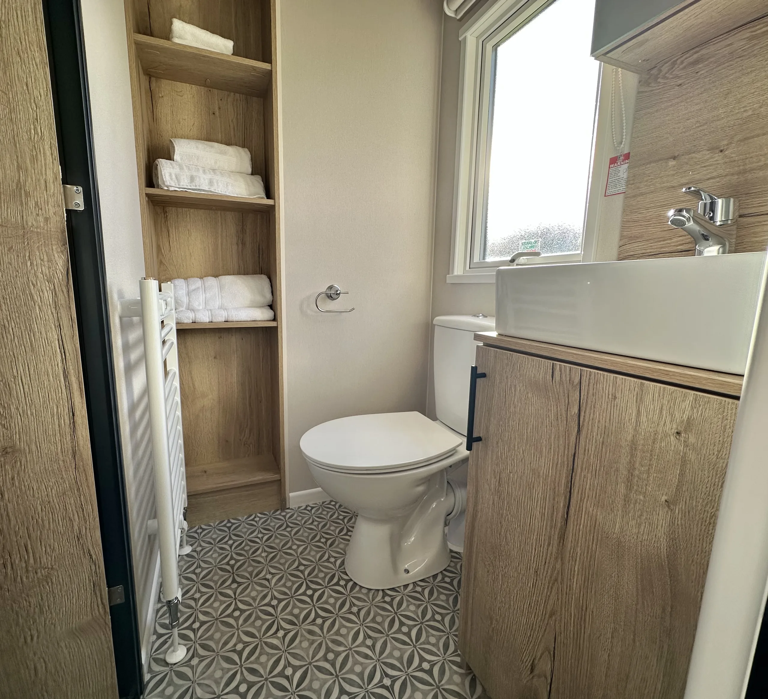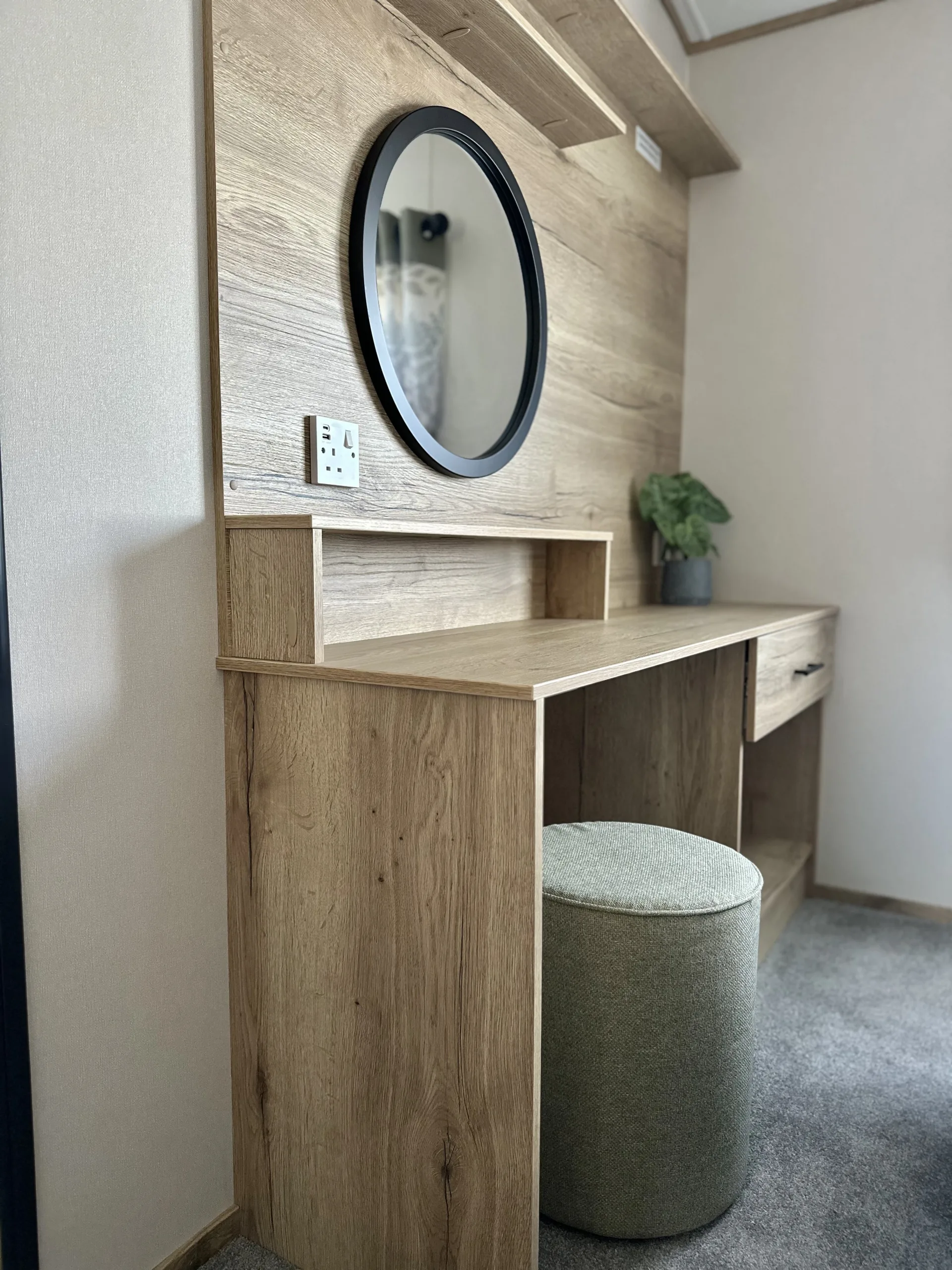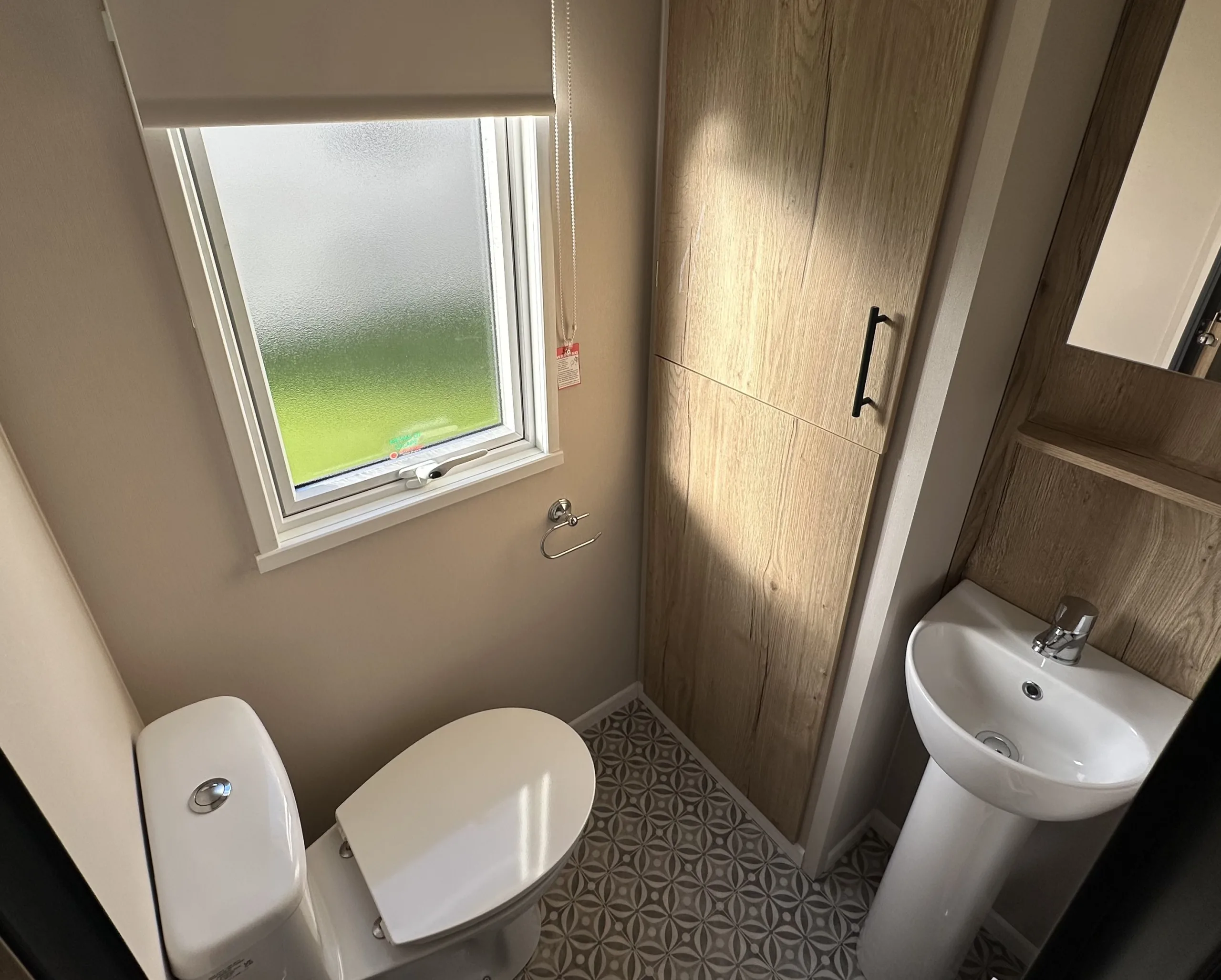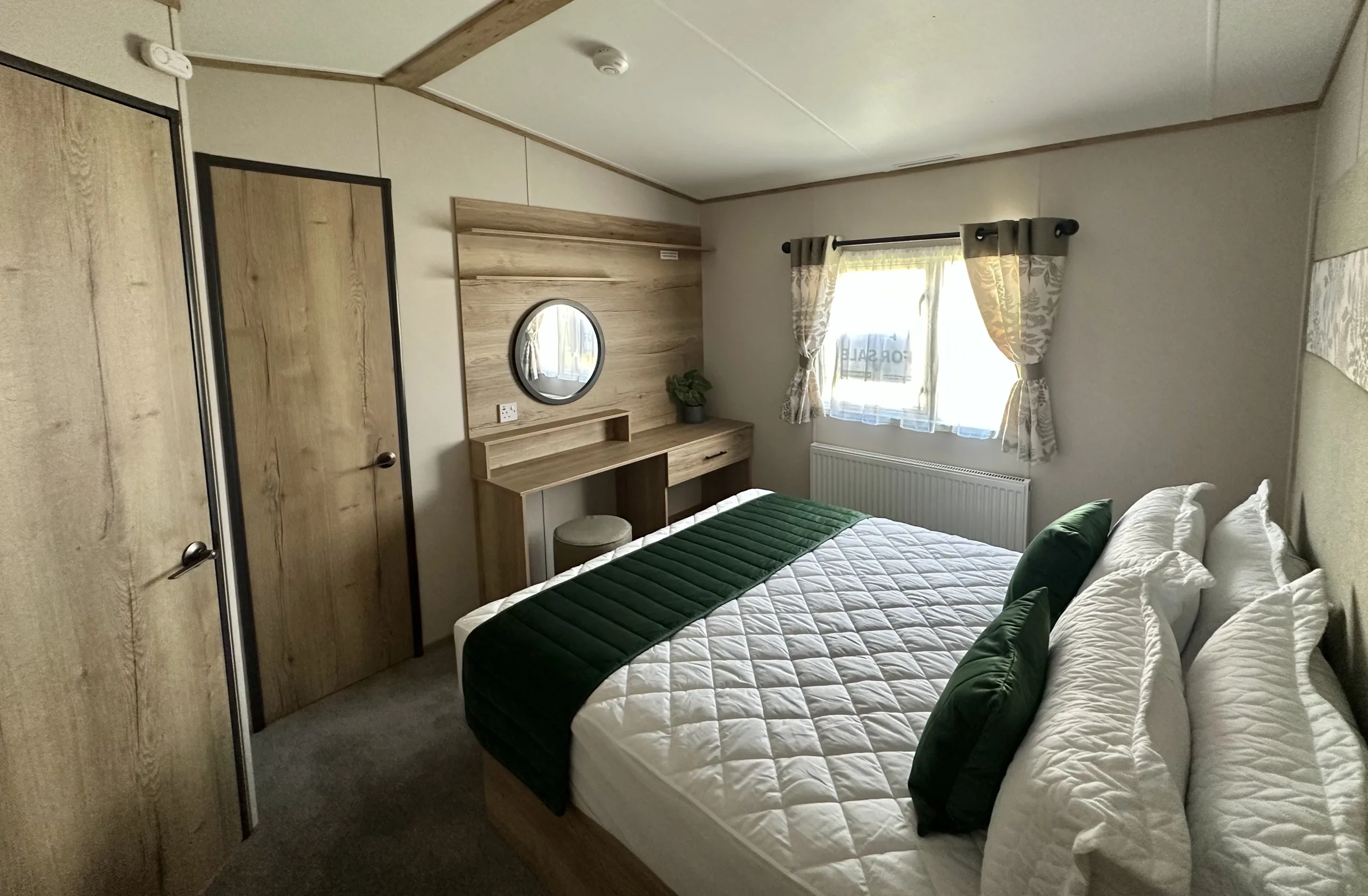 The 2025 ABI Oak caravan offers a wonderful light open-plan living space with a bright airy feel. New for 2025, this contemporary caravan has had an updated colour scheme of warm terracotta and sage tones. The spacious living area offers an electric fireplace and a comfortable L shaped sofa, perfect for relaxing and socialising. Carpet underlay is featured throughout the Oak static caravan adding comfort and a homely feel.