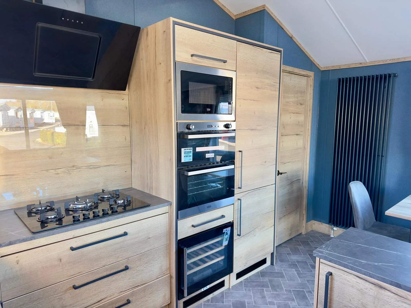 Opulent blues and striking wood tones make this a sophisticated and inviting living space. Open plan with stylish wall lighting, statement mirrors and a sommelier-worthy wine cooler, designed for entertaining. From striking wood feature walls to statement radiators, its design details break the mould with its must-have features.