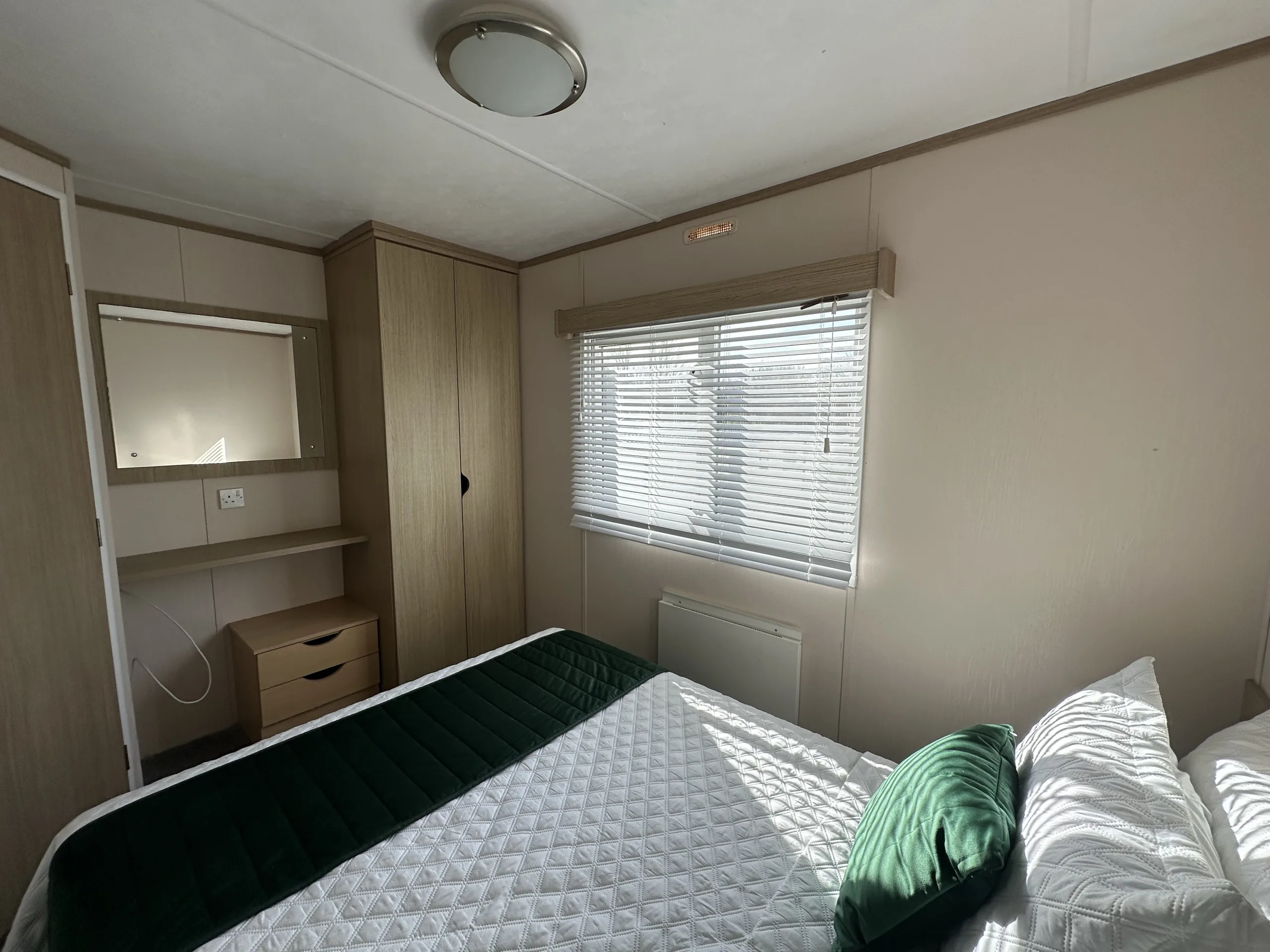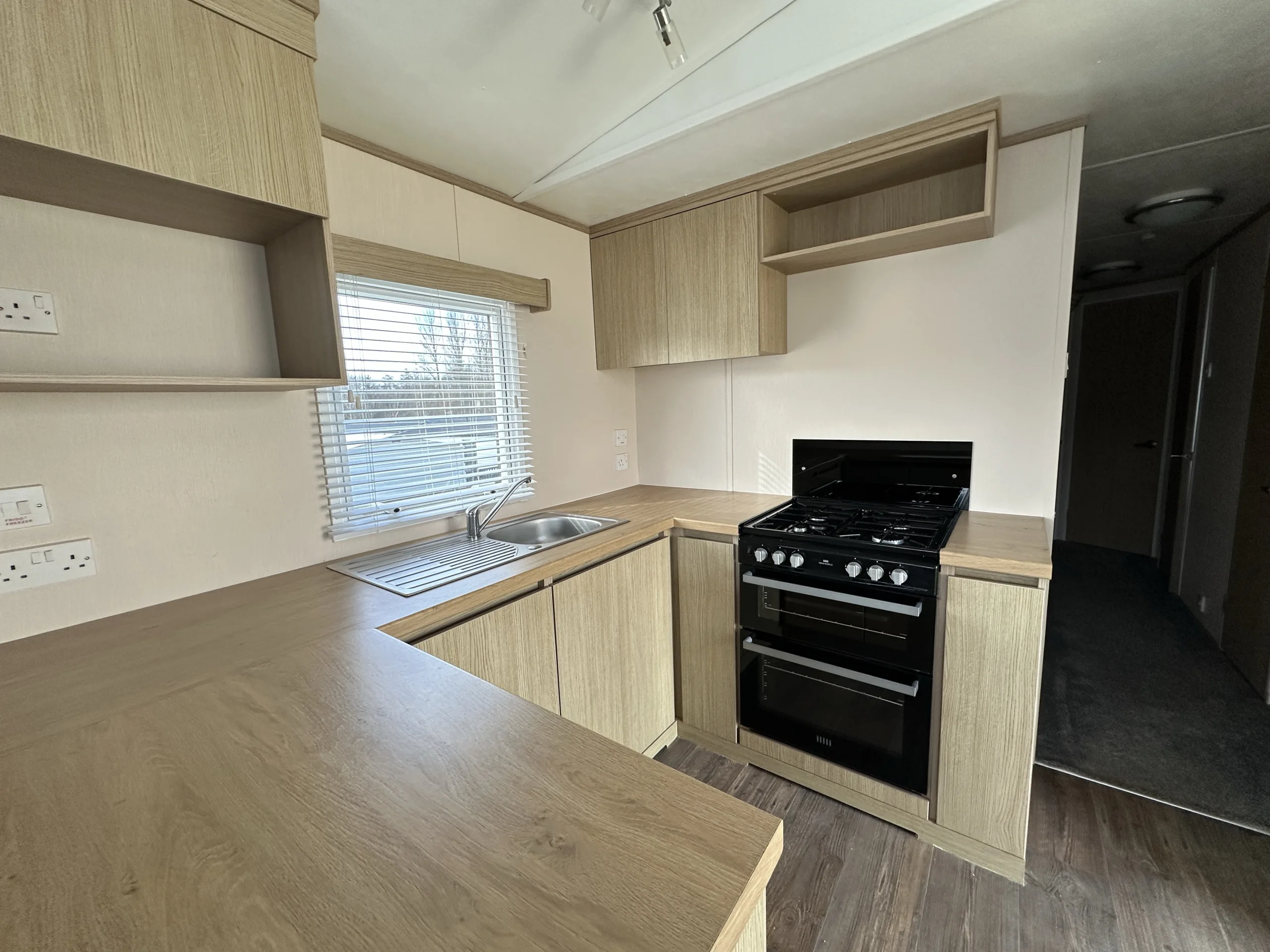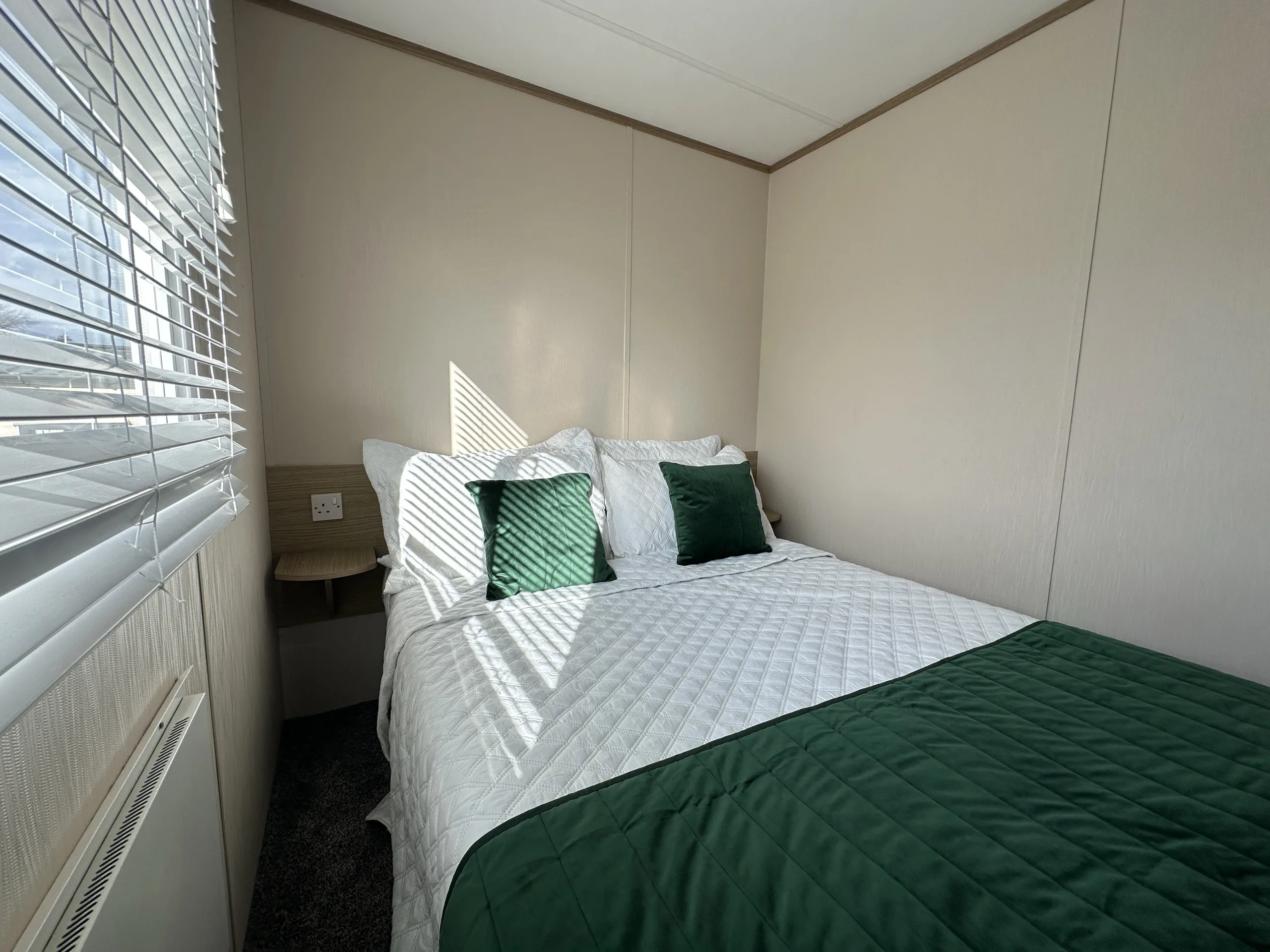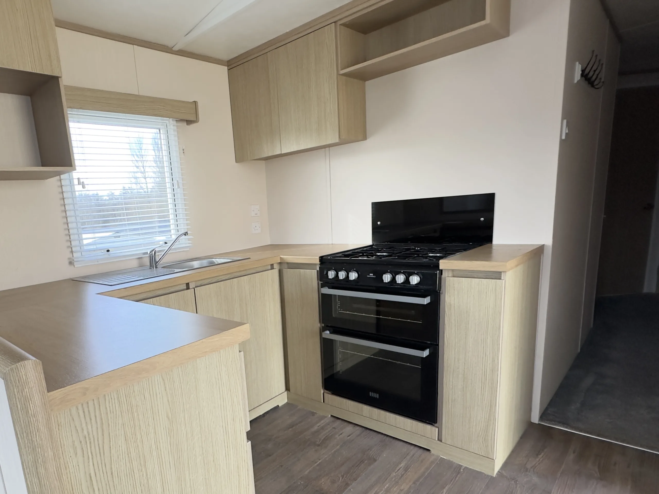 This bright and spacious 3-bedroom static caravan is the perfect family retreat. The open-plan living area is designed for both relaxation and entertaining, with a modern U-shaped kitchen, generous storage, and stylish oak wood-effect units throughout. The master bedroom is a relaxing haven, featuring a full-length wardrobe, a free-standing shelf and mirror, and a large picture window that floods the room with natural light. Two well-sized twin rooms with plenty of storage complete the layout.