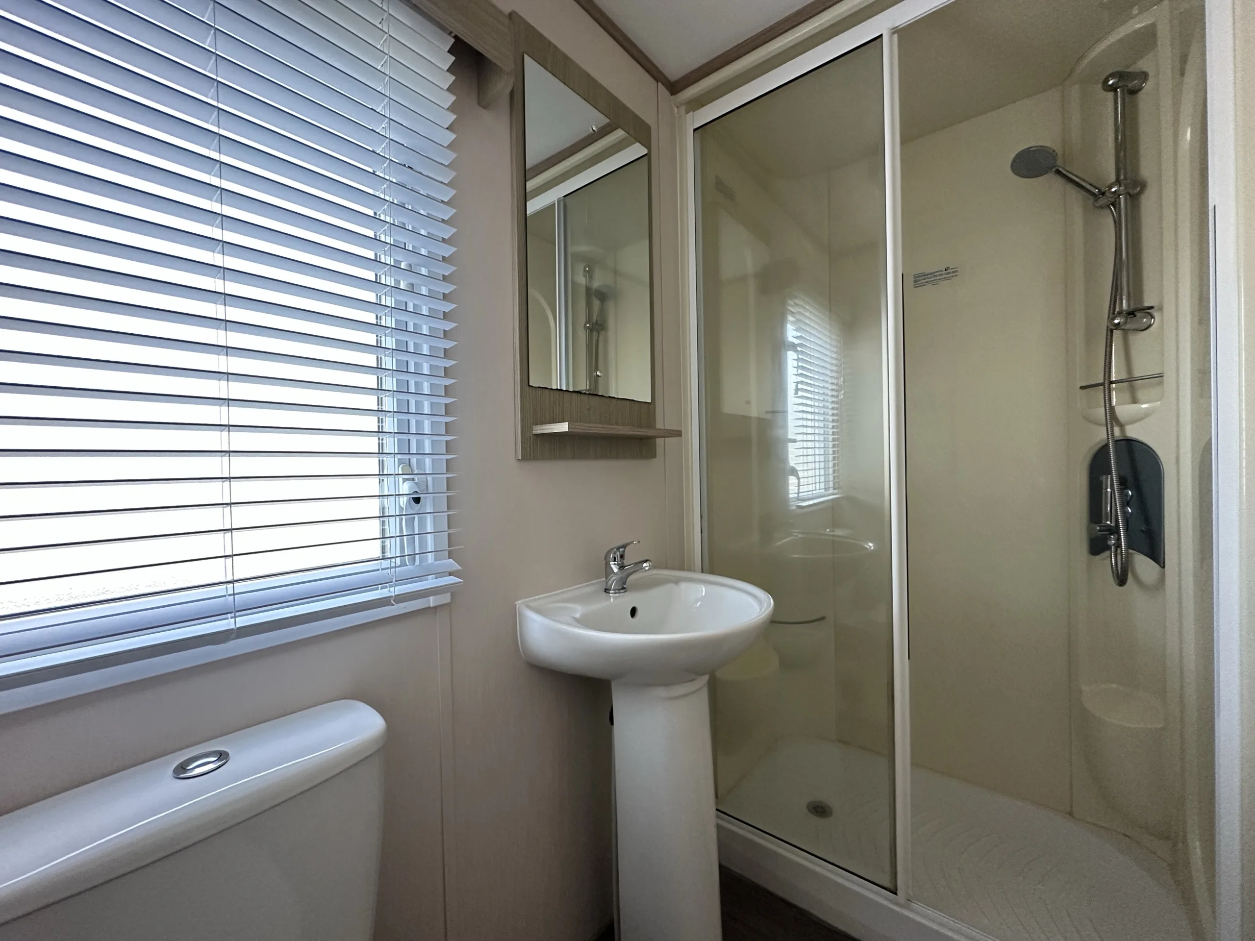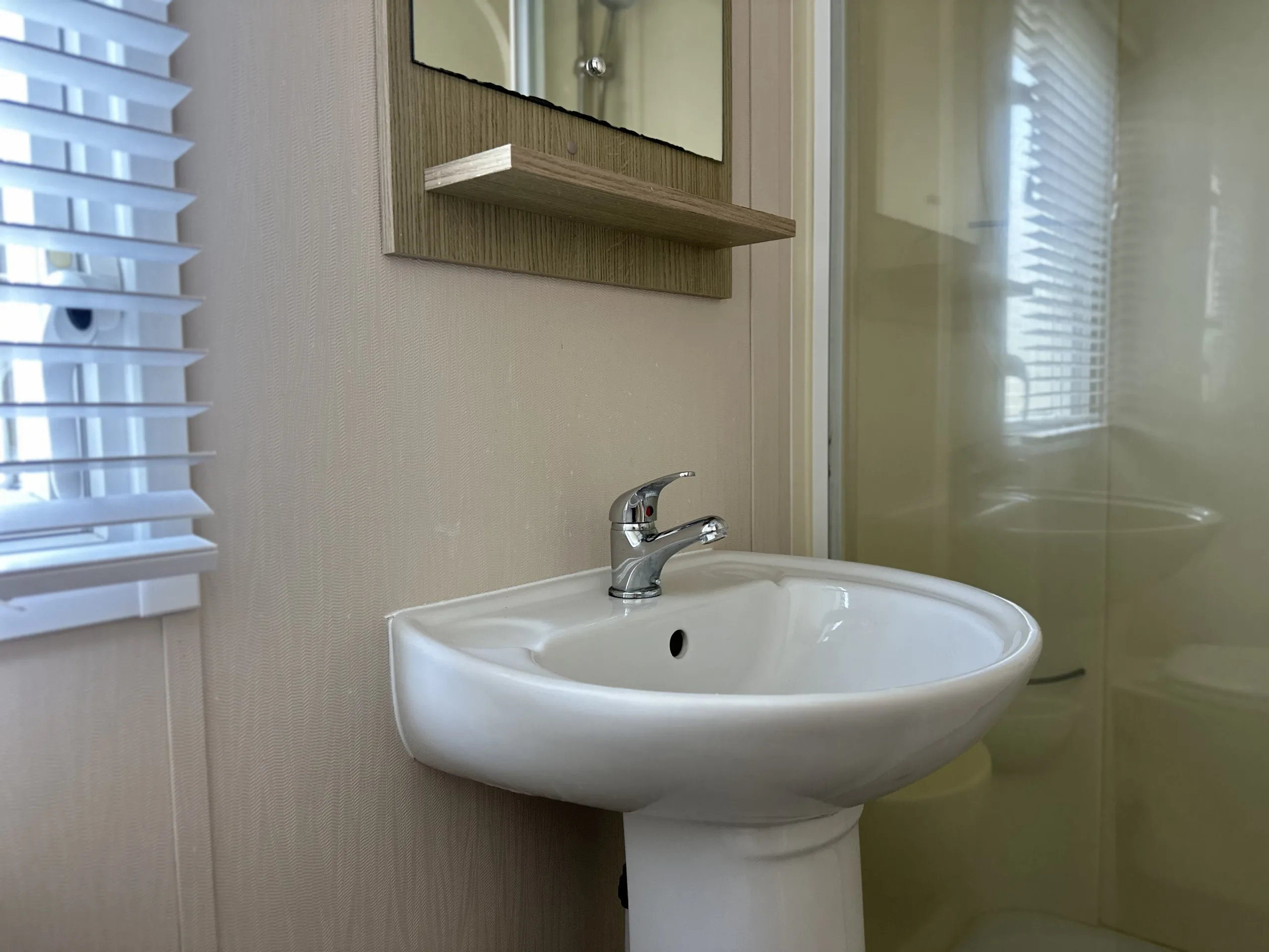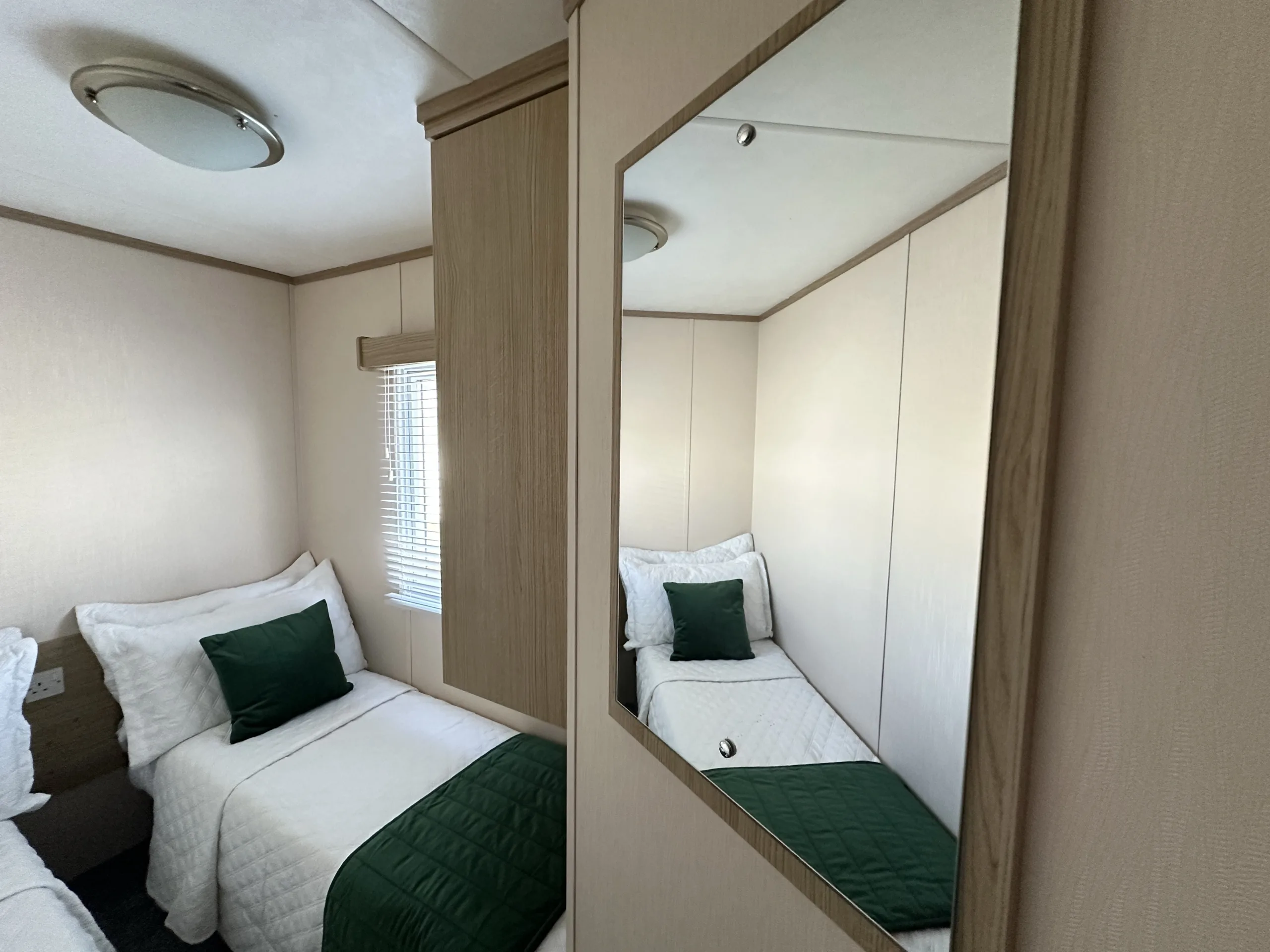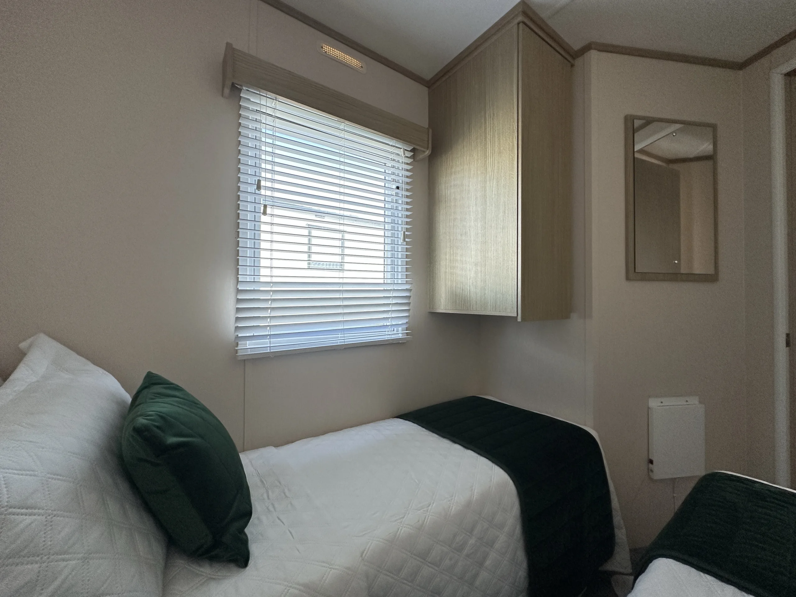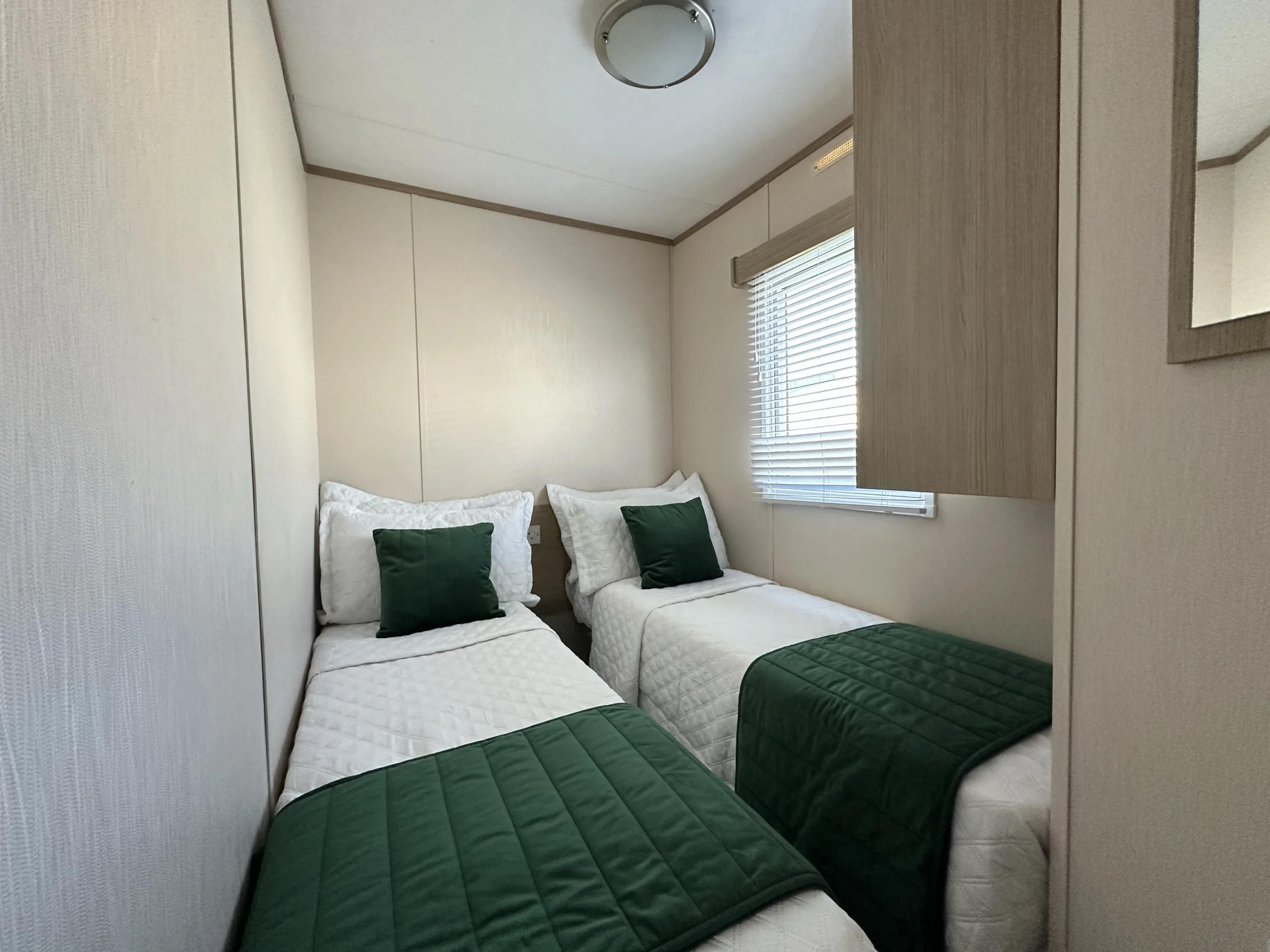 This bright and spacious 3-bedroom static caravan is the perfect family retreat. The open-plan living area is designed for both relaxation and entertaining, with a modern U-shaped kitchen, generous storage, and stylish oak wood-effect units throughout. The master bedroom is a relaxing haven, featuring a full-length wardrobe, a free-standing shelf and mirror, and a large picture window that floods the room with natural light. Two well-sized twin rooms with plenty of storage complete the layout.