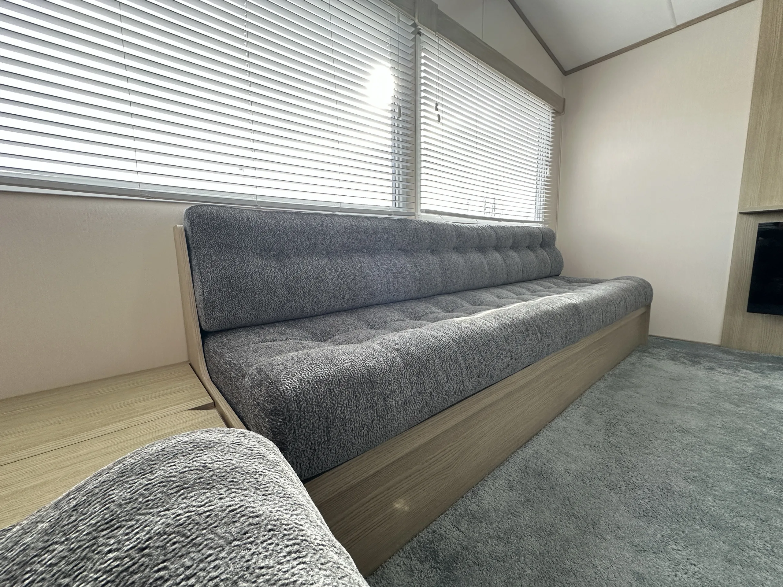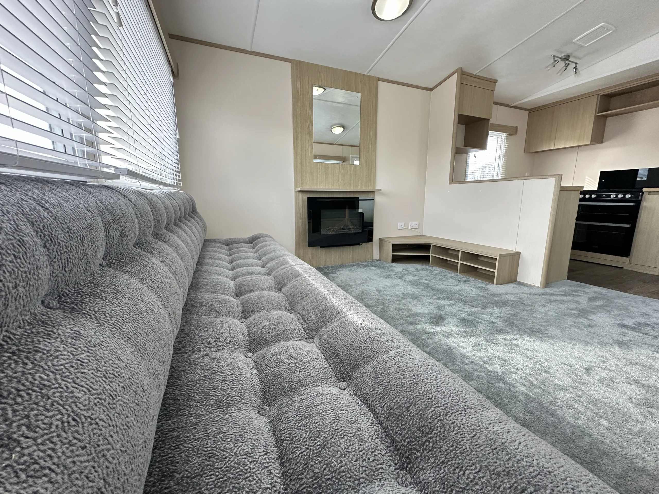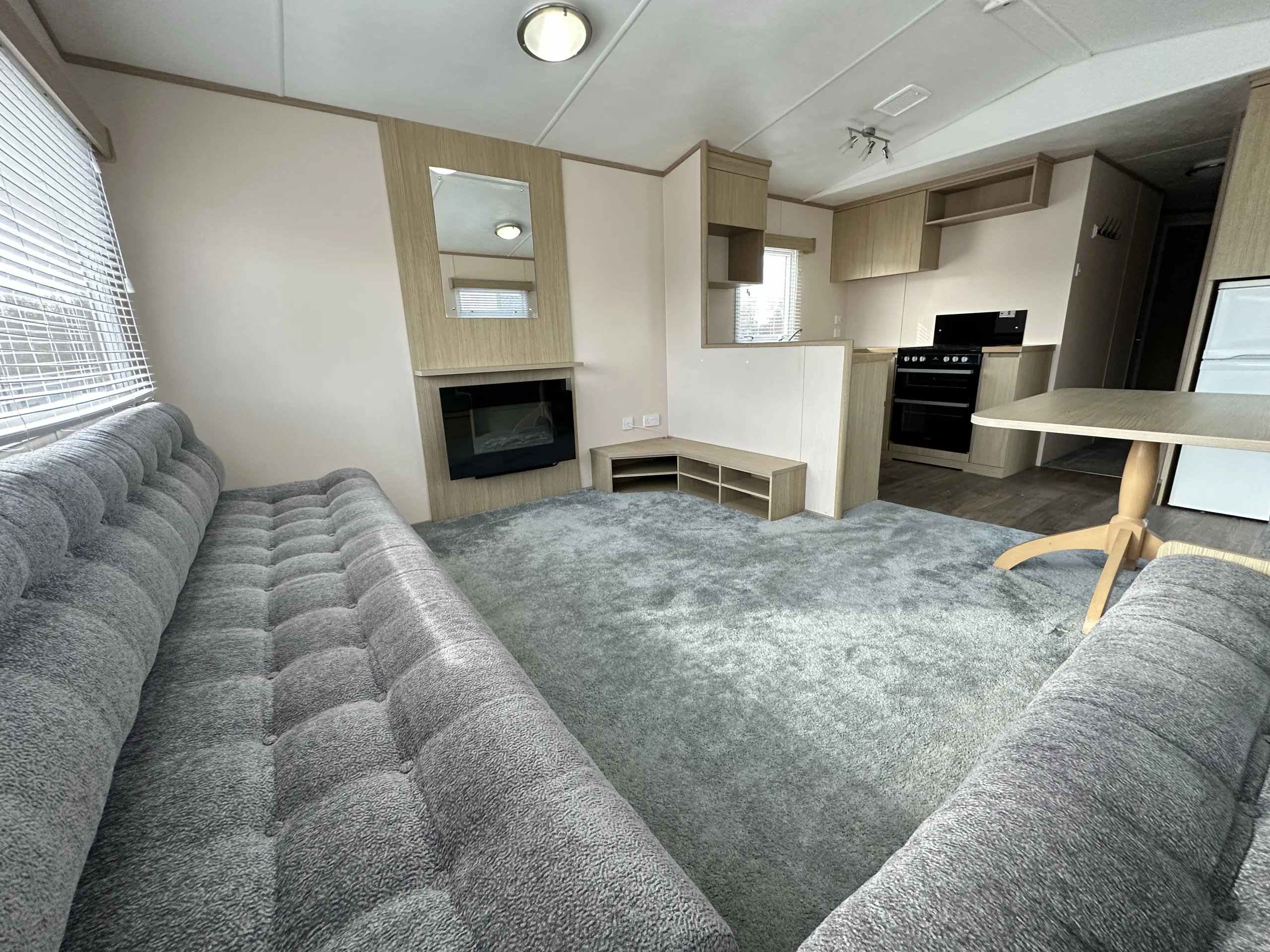 With comfy sprung seating, deluxe mattresses, and a family bathroom with a free-standing shower, wash basin, and WC, plus an additional WC down the hall, this holiday home offers everything you need for comfort and convenience. The L-shaped partition wall keeps the kitchen and dining areas open while providing a sense of separation from the lounge.