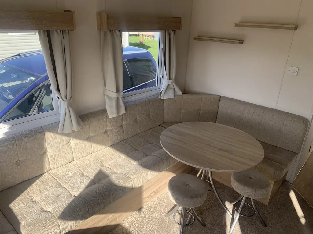 The fully fitted kitchen and adjacent dinette area make meal times easy, while the family bathroom includes a large shower unit, wash basin, and WC. With its bright, modern fabrics and thoughtful design, the Delta Santana provides all the space and features needed for a perfect family getaway. Practical, stylish, and packed with everything you need, this holiday home is ready for you to make it your own.