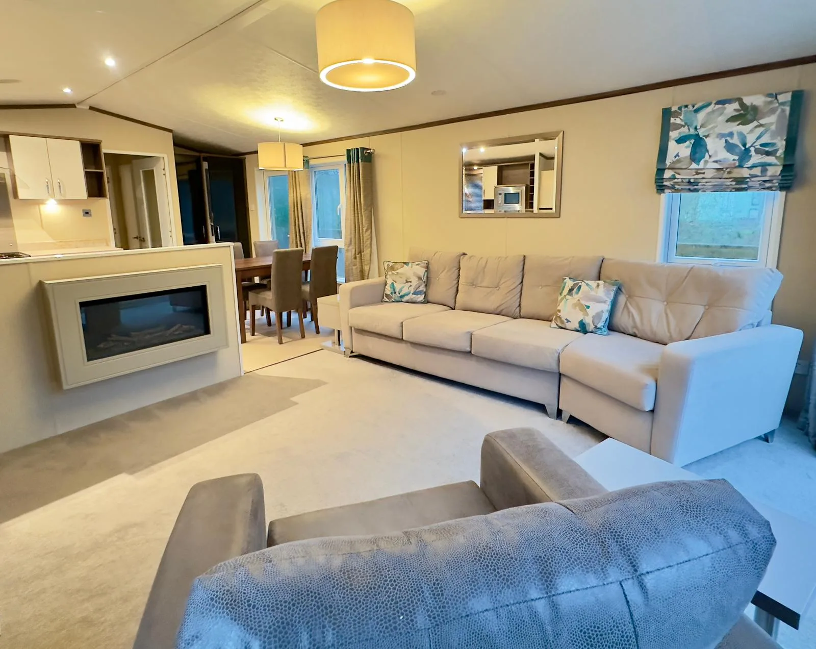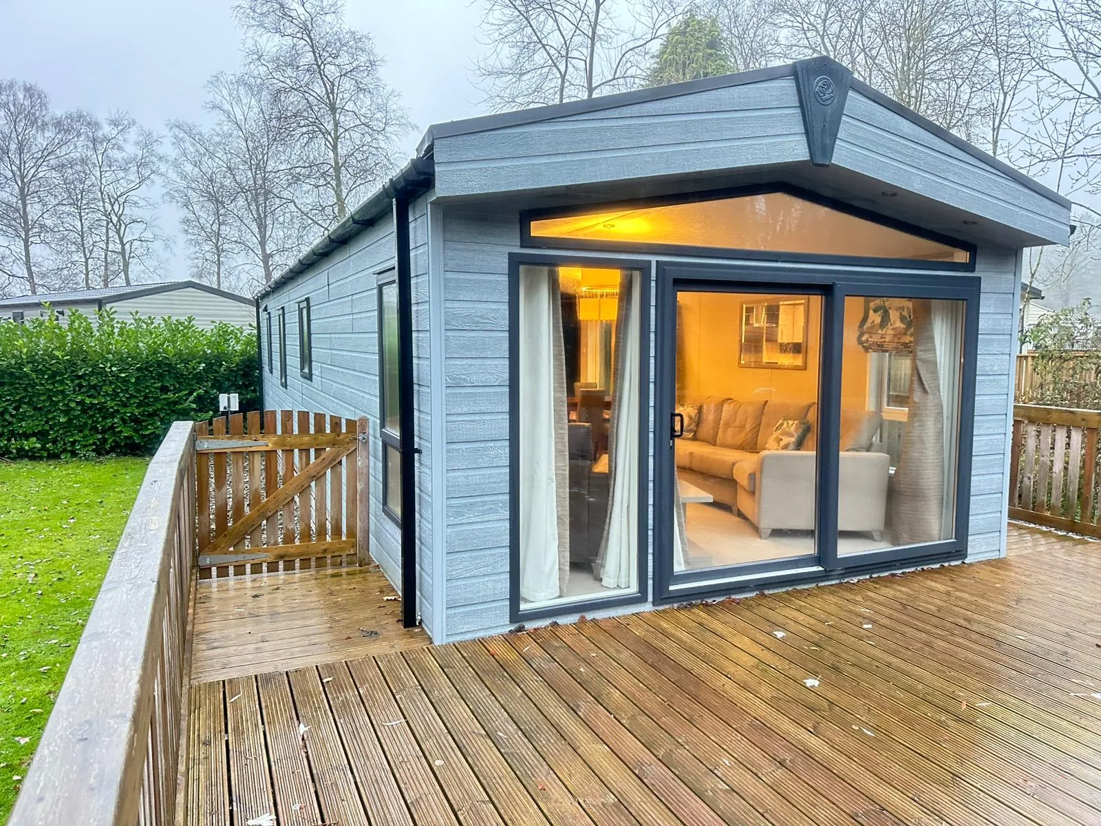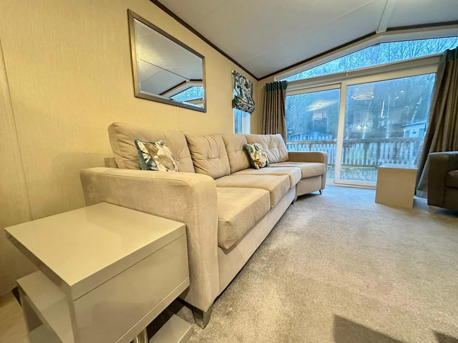 The generously sized lounge offers ample storage and a contemporary fireplace, making it an inviting place to relax and unwind. Large patio doors flood the room with natural light and open out onto an exceptionally large decking area, overlooking a secluded lodge setting here at Black Beck Holiday Park in the South Lakes, ideal for enjoying the outdoors all year round.
