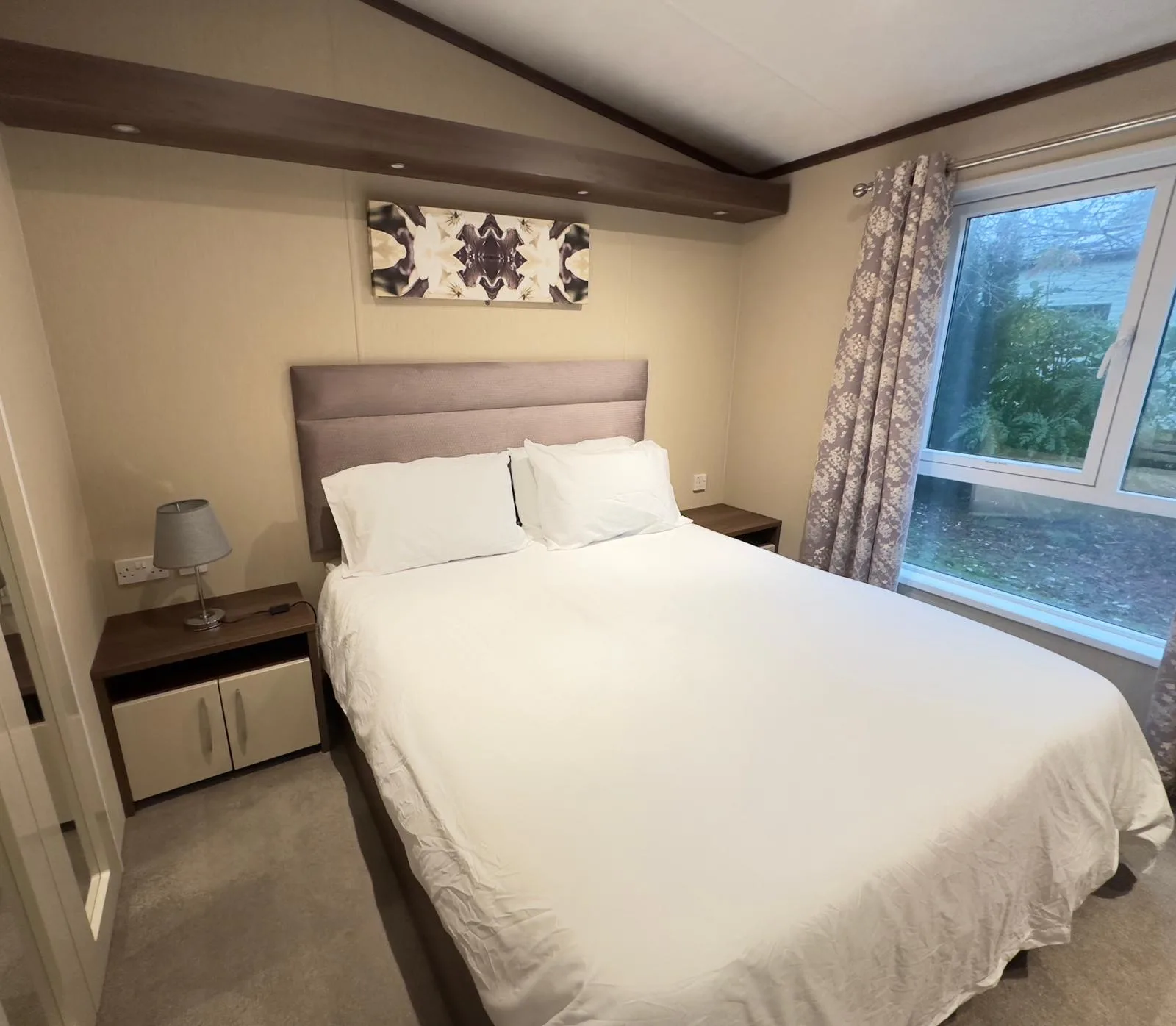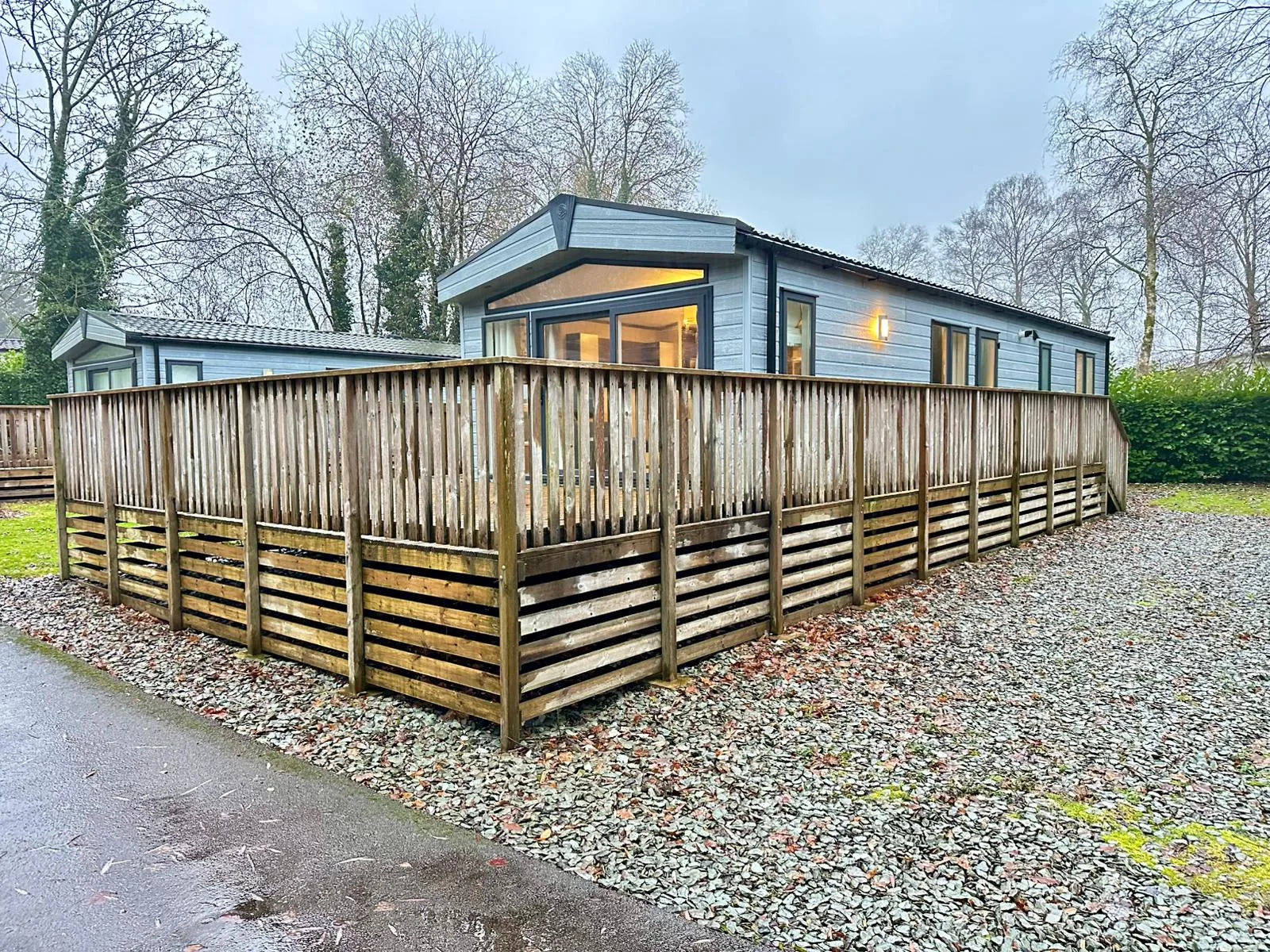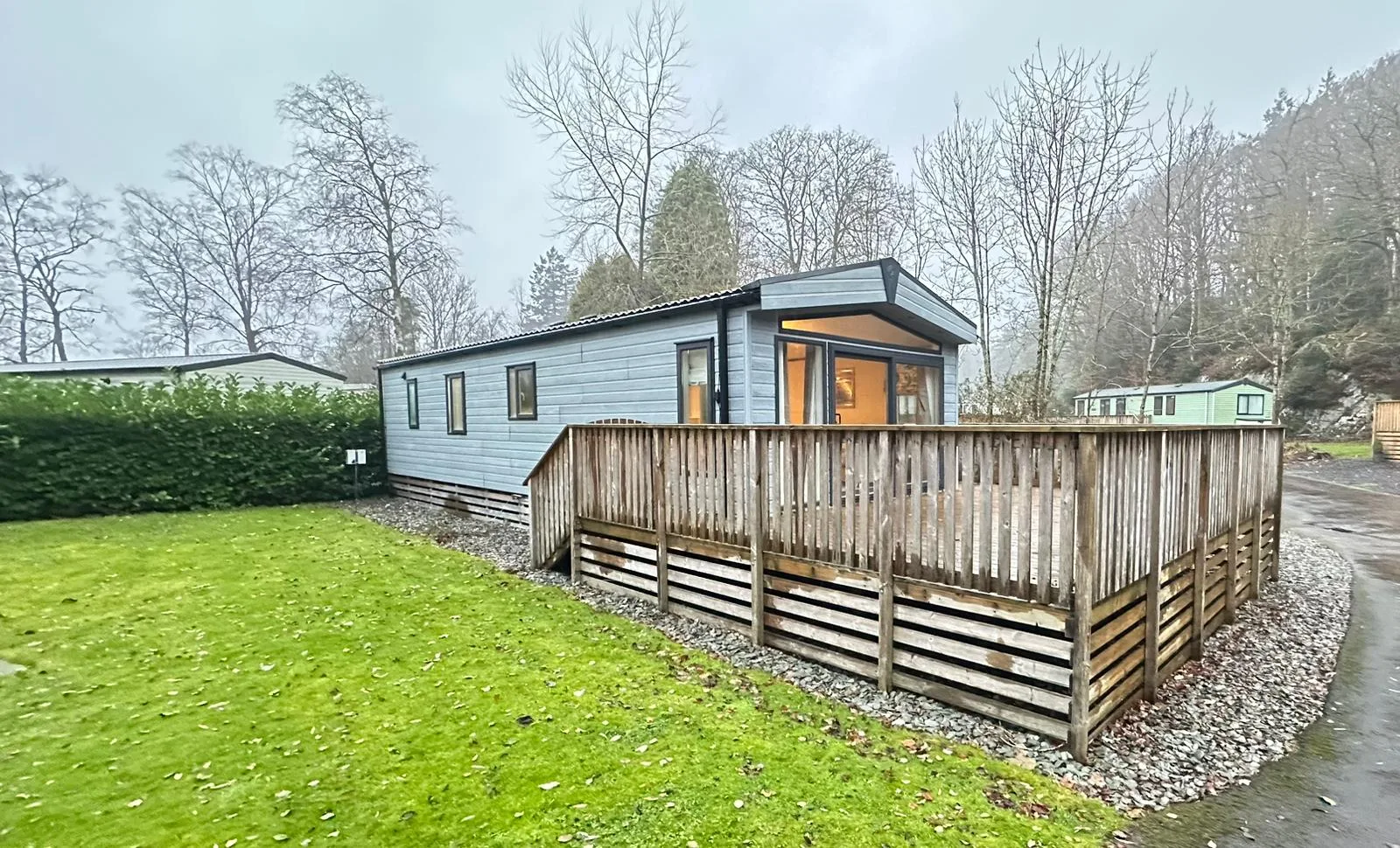 The generously sized lounge offers ample storage and a contemporary fireplace, making it an inviting place to relax and unwind. Large patio doors flood the room with natural light and open out onto an exceptionally large decking area, overlooking a secluded lodge setting here at Black Beck Holiday Park in the South Lakes, ideal for enjoying the outdoors all year round.