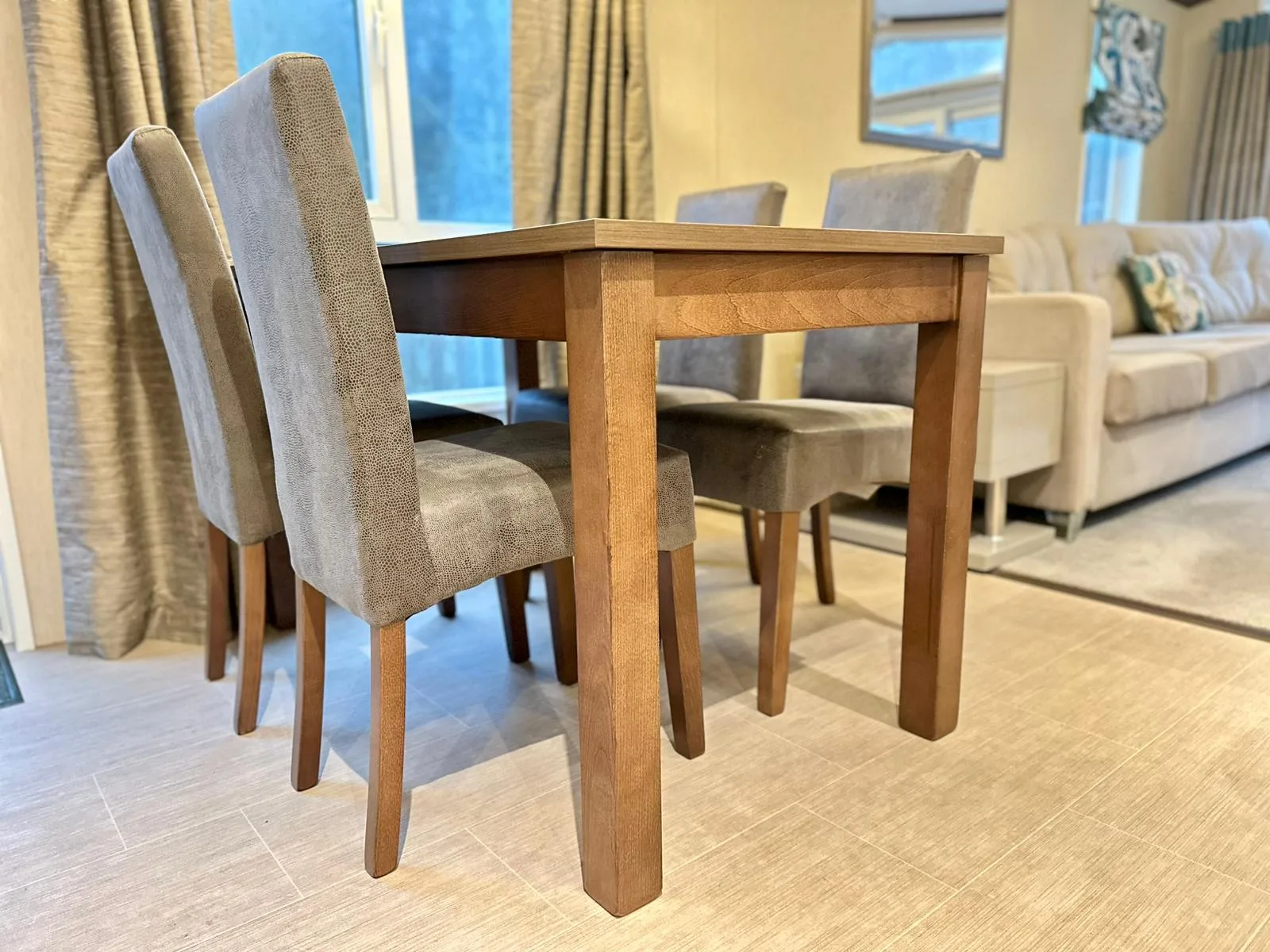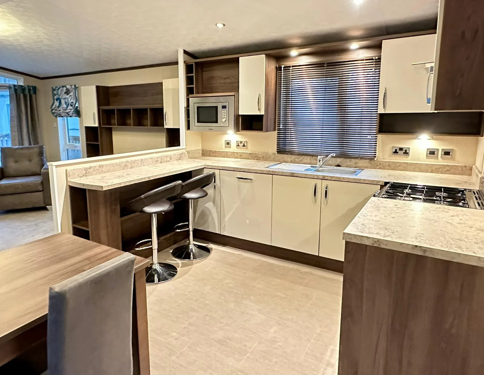 Perfectly blending practical open-plan living with stylish, homely touches. Step into the spacious living and dining area, where a fully equipped kitchen awaits, complete with a freestanding dining table and the added convenience of a breakfast bar. Rich dark oak finishes run throughout the home, creating a sophisticated, high-end atmosphere that enhances every space.