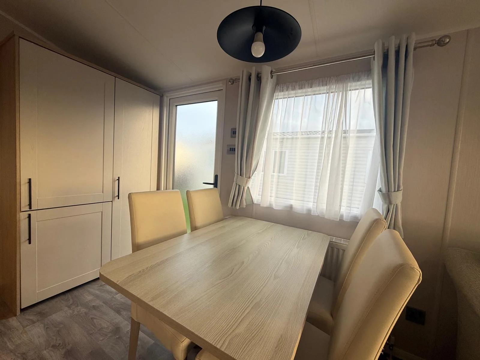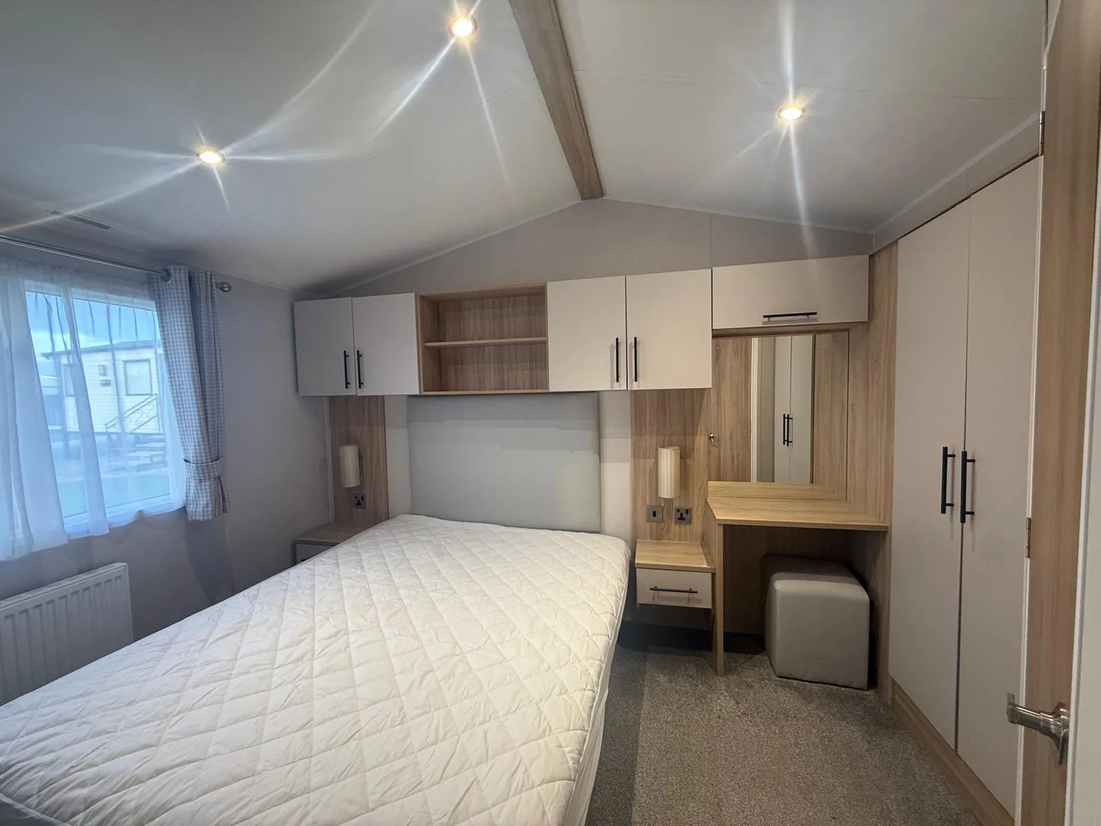 The master bedroom offers a boutique hotel feel with luxurious fabrics, a mirrored dressing area, and a king-size bed (in the two-bedroom model), plus an en-suite for added comfort. The cosy living area is perfect for unwinding after a day of exploring, while the fully fitted kitchen provides plenty of workspace, a gas oven, and a full-size fridge-freezer.