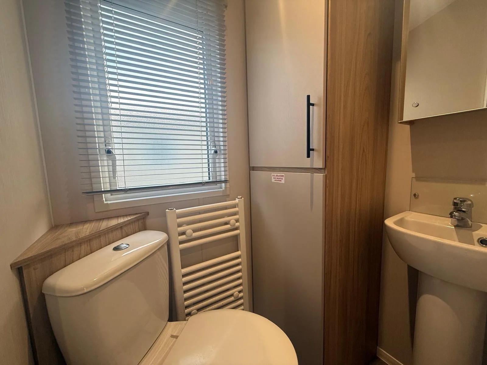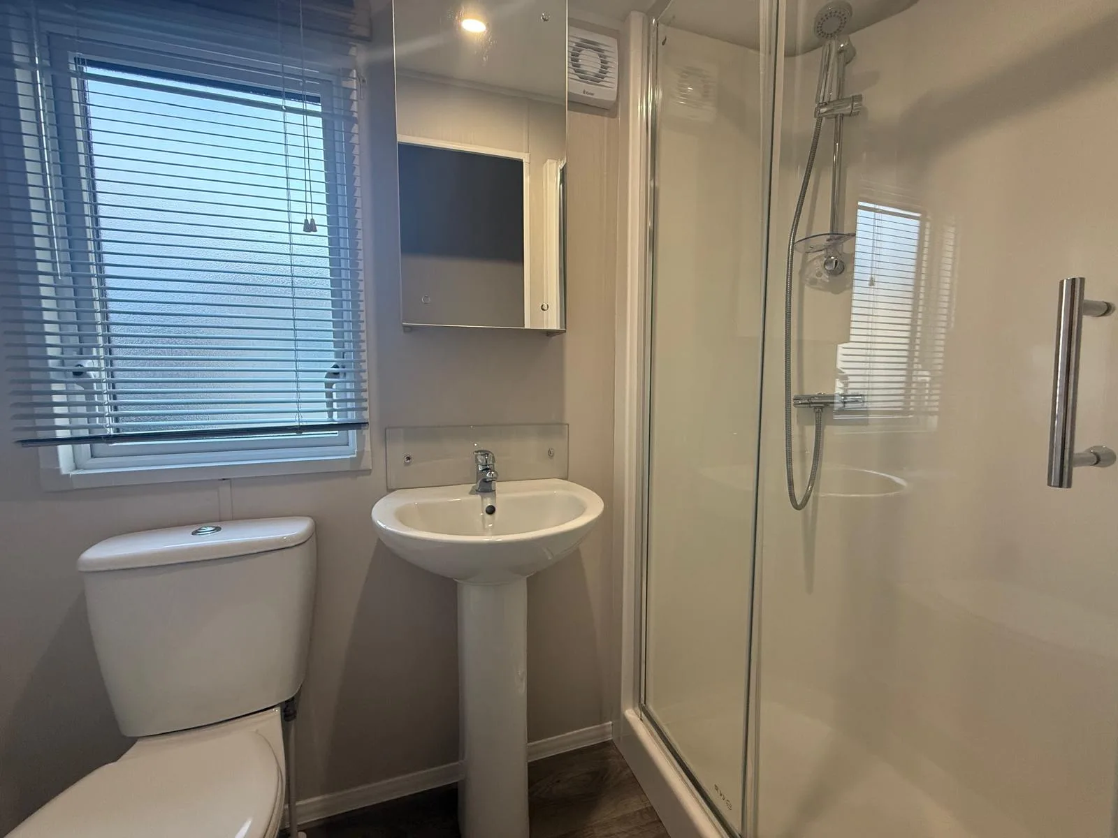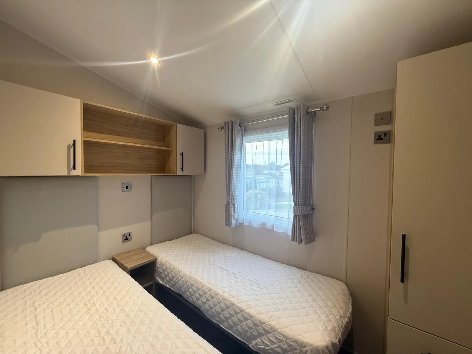 A spacious twin bedroom with ample storage, along with a family bathroom featuring a shower unit, wash basin, and WC, makes this holiday home ideal for relaxation and comfort.