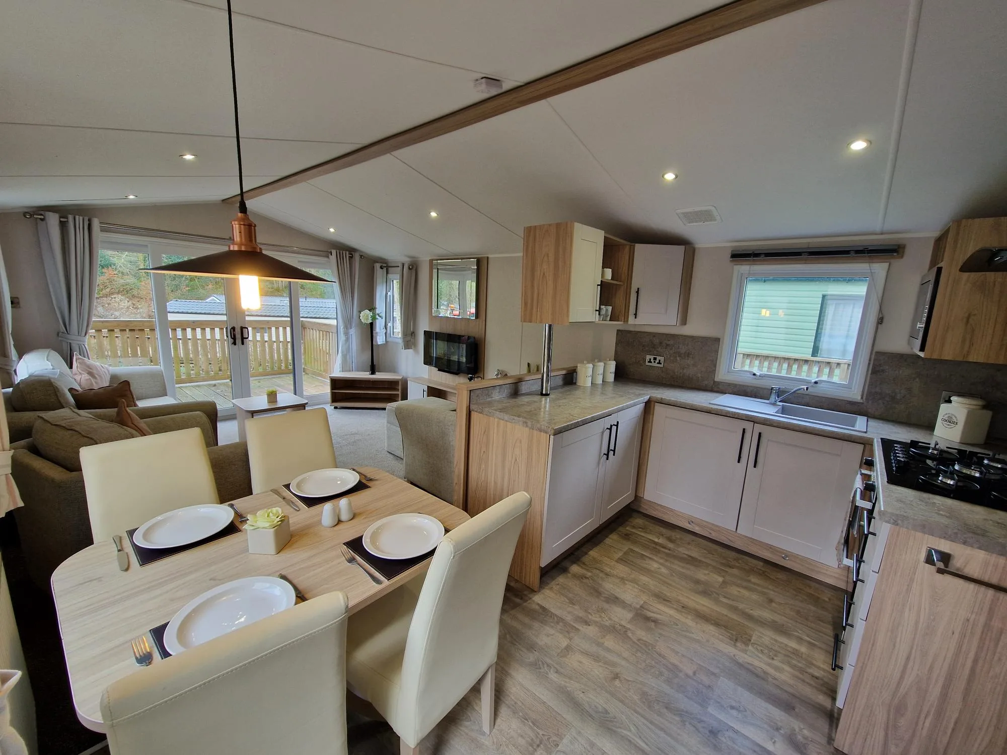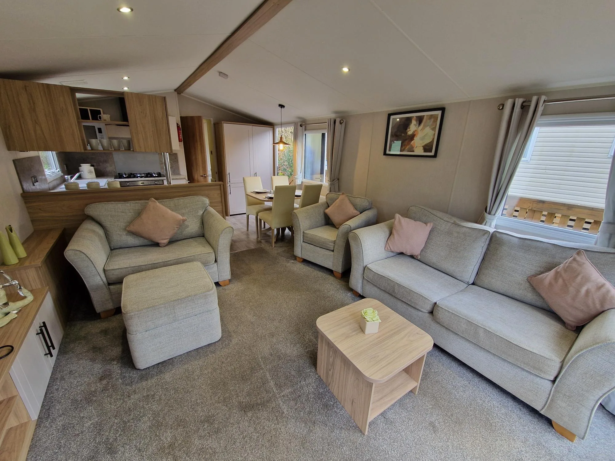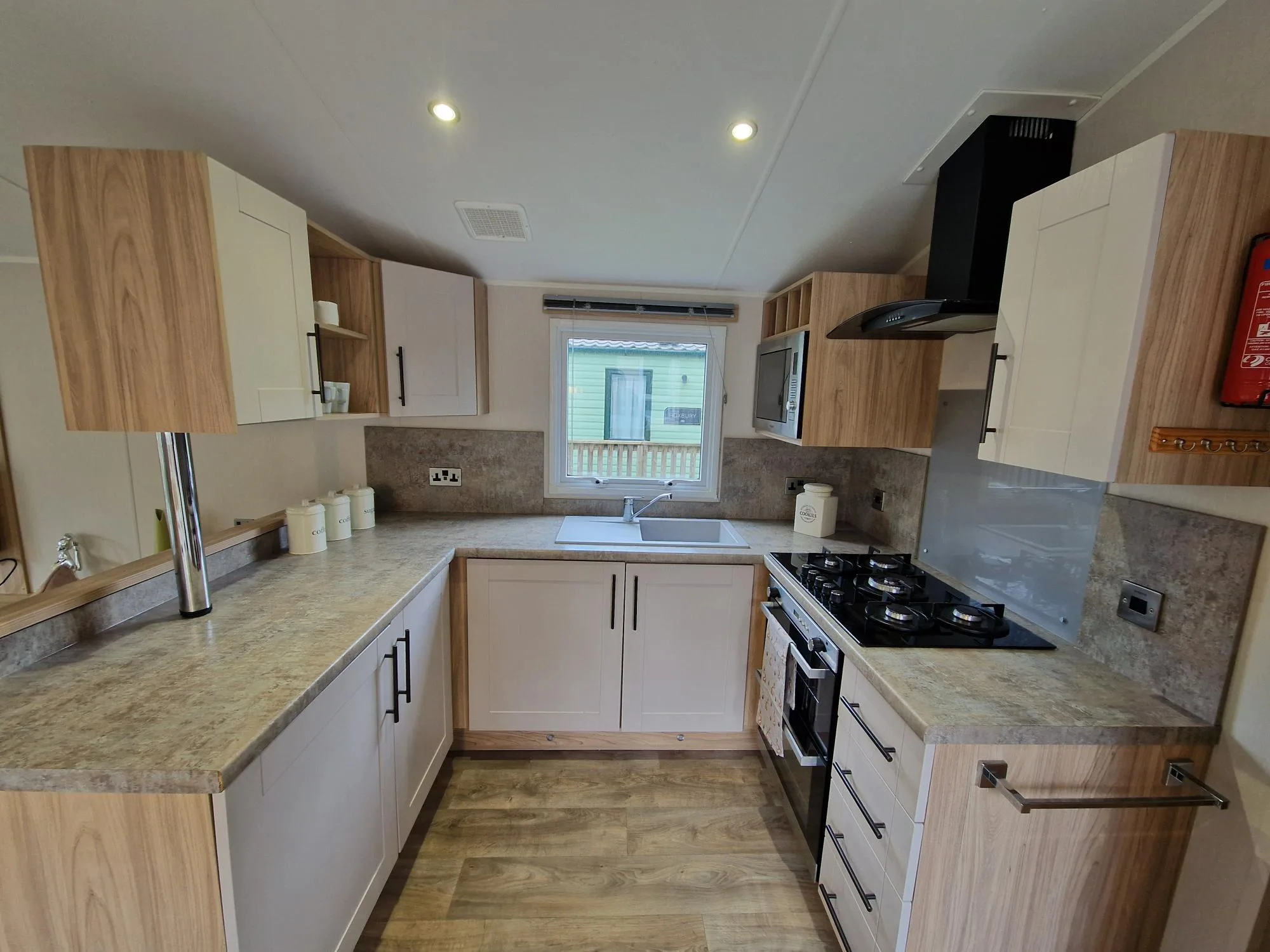 The Manor combines modern elegance with practicality. The bright living area features a 3-seater pull-out sofa bed, cuddle chair and oak-style furniture, creating a cozy space for relaxation. The shaker-style kitchen is fully equipped with a 70/30 fridge-freezer, microwave, 5-ring gas hob, electric oven, and extractor, perfect for family meals.