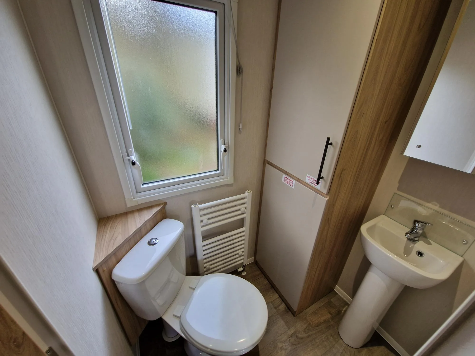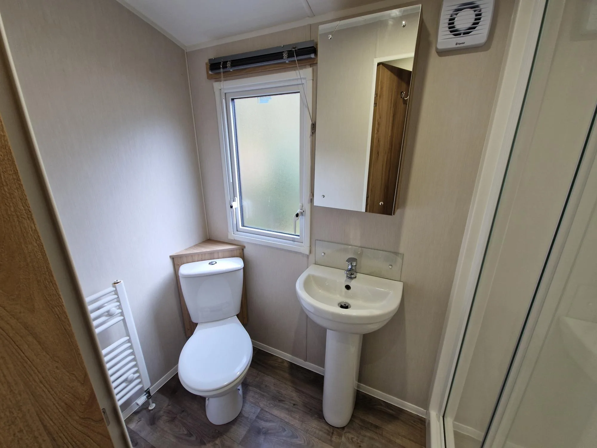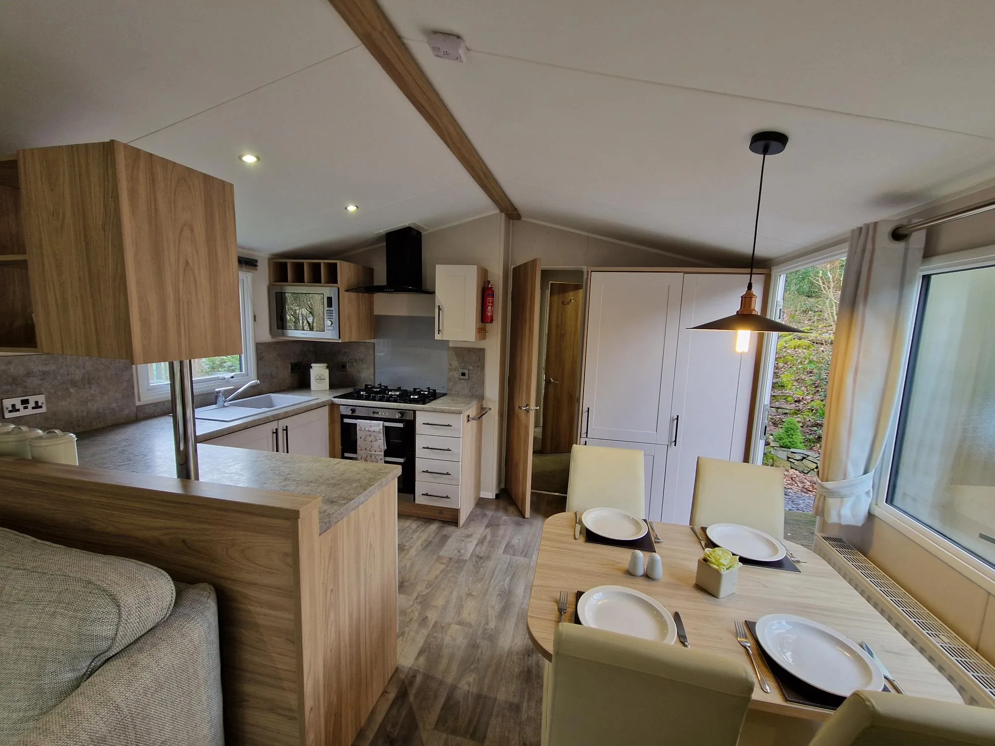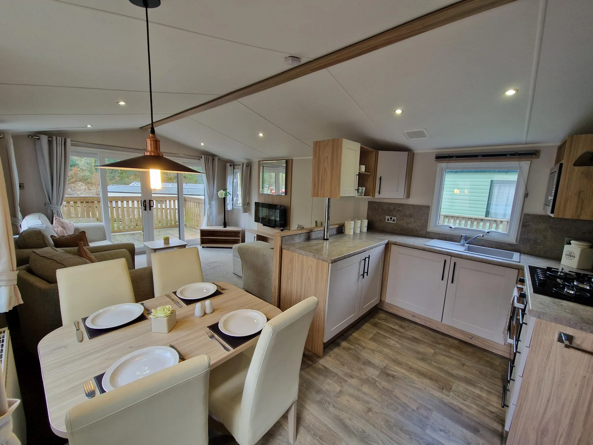 The Manor combines modern elegance with practicality. The bright living area features a 3-seater pull-out sofa bed, cuddle chair and oak-style furniture, creating a cozy space for relaxation. The shaker-style kitchen is fully equipped with a 70/30 fridge-freezer, microwave, 5-ring gas hob, electric oven, and extractor, perfect for family meals.