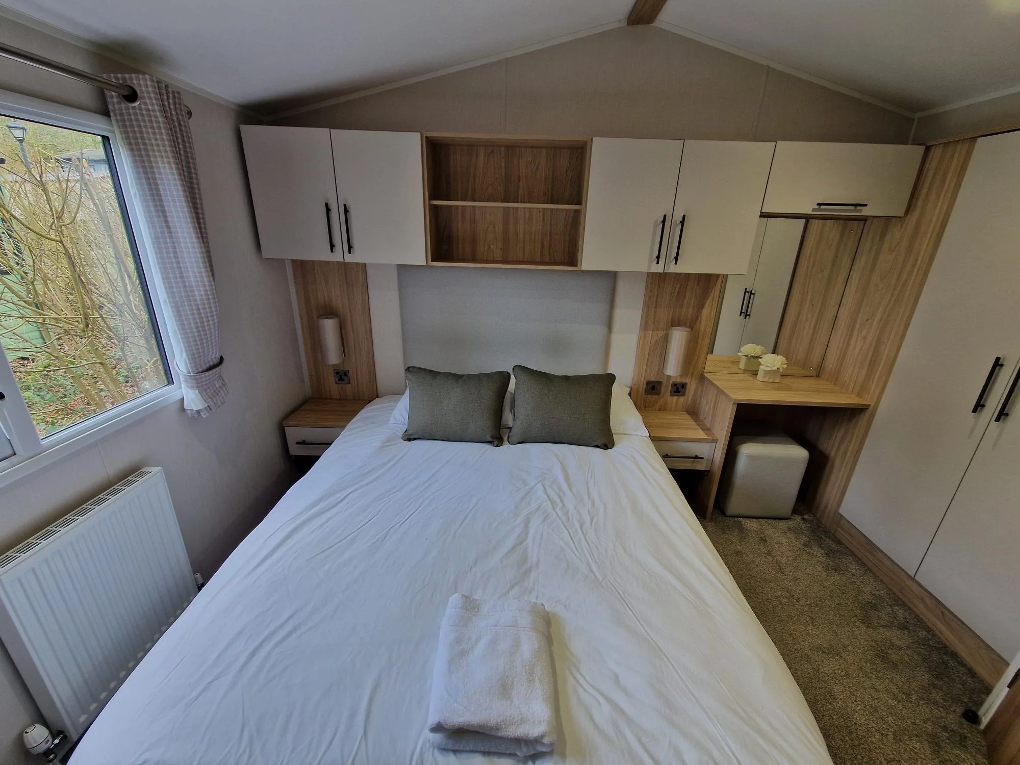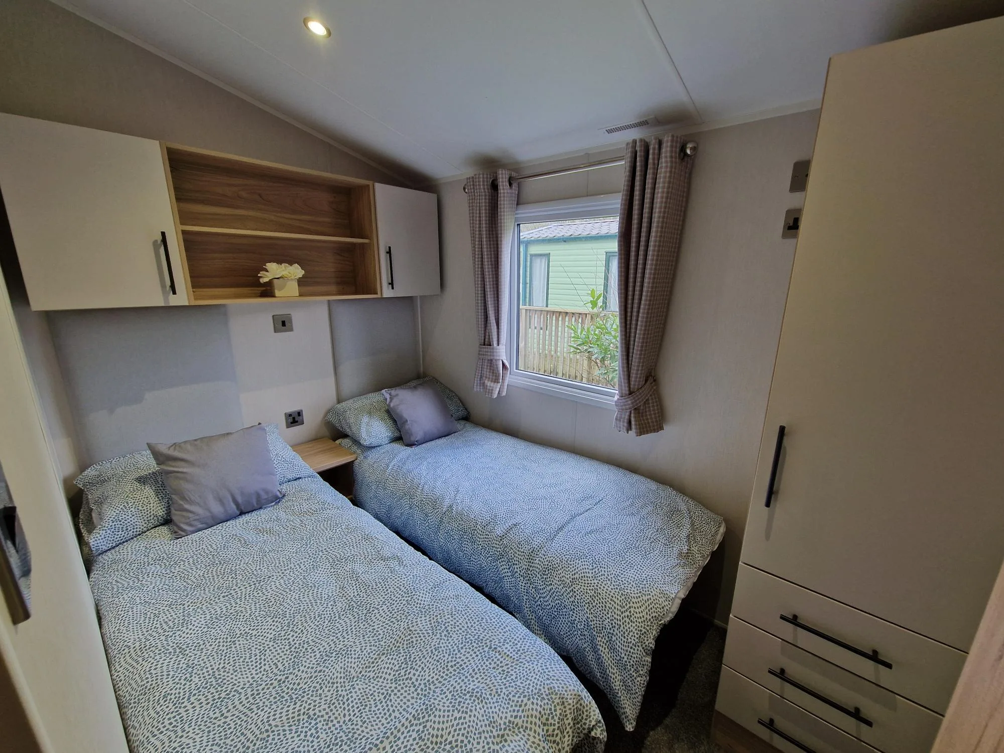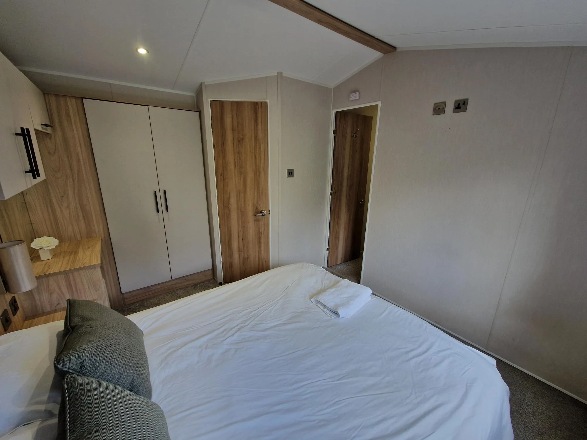 The master bedroom boasts a king-size bed, mirrored dressing area, built-in wardrobe, and an en-suite WC for added comfort. The twin bedroom is well-designed with twin beds, overhead storage, and integrated drawers. The family bathroom is spacious, with a double walk-in shower, WC, mirrored cupboard, and heated towel rail.