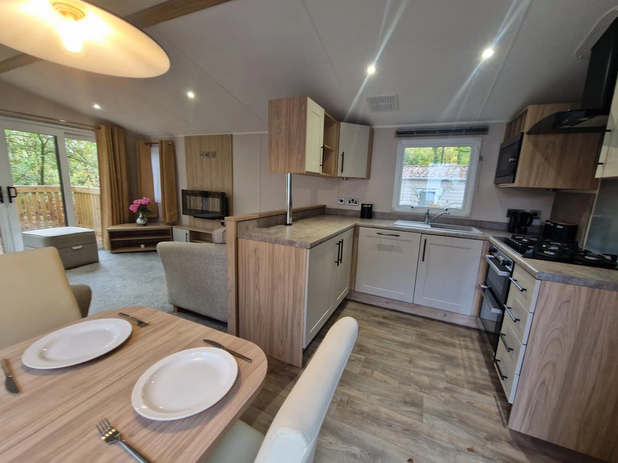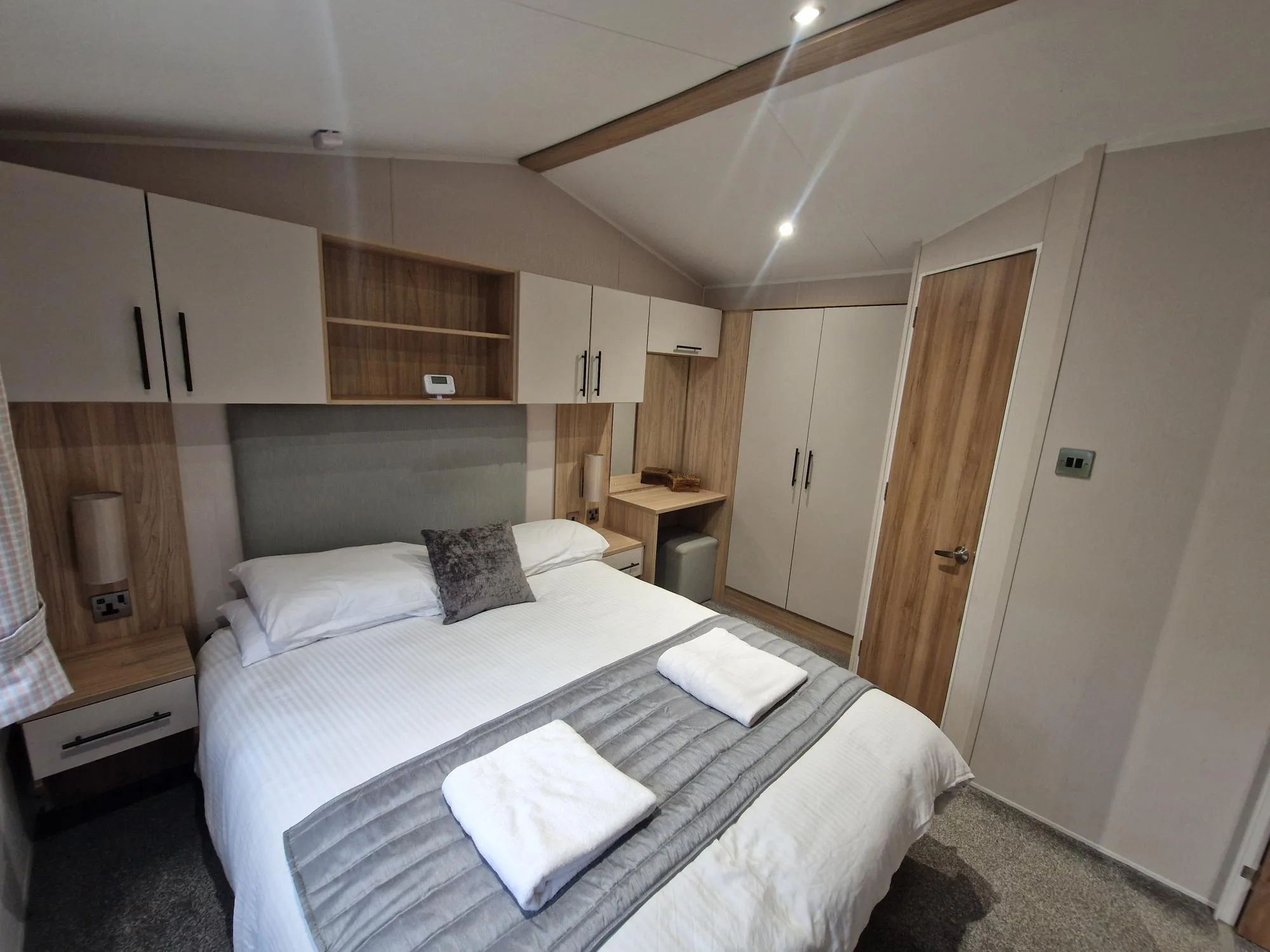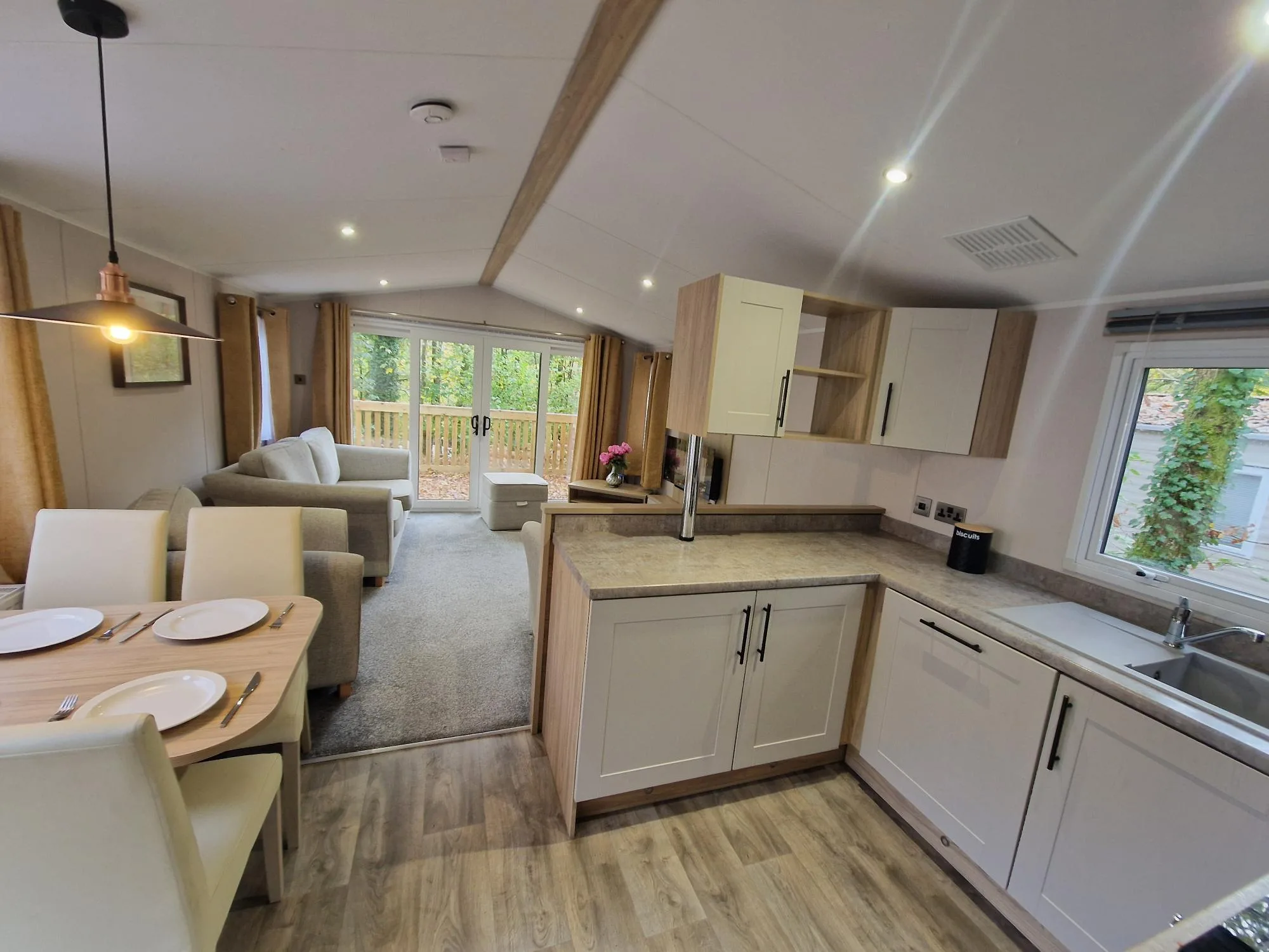 The spacious interior includes an integrated fridge-freezer, a rear projection fire, and freestanding furniture that adds to its contemporary charm. The master bedroom is a true retreat, complete with an en-suite for added convenience and comfort. The highlight of this Manor is its beautiful wraparound decking, offering the perfect space to relax and take in your surroundings.