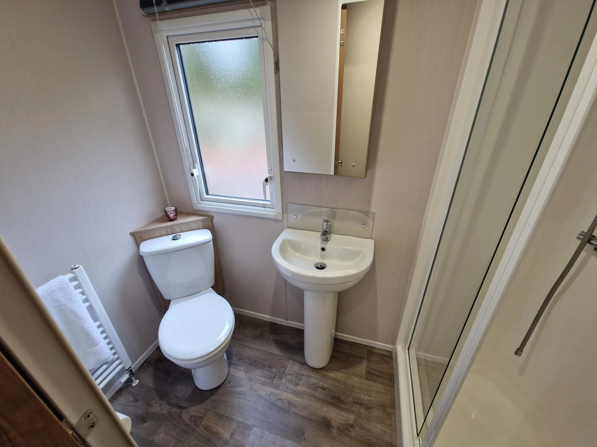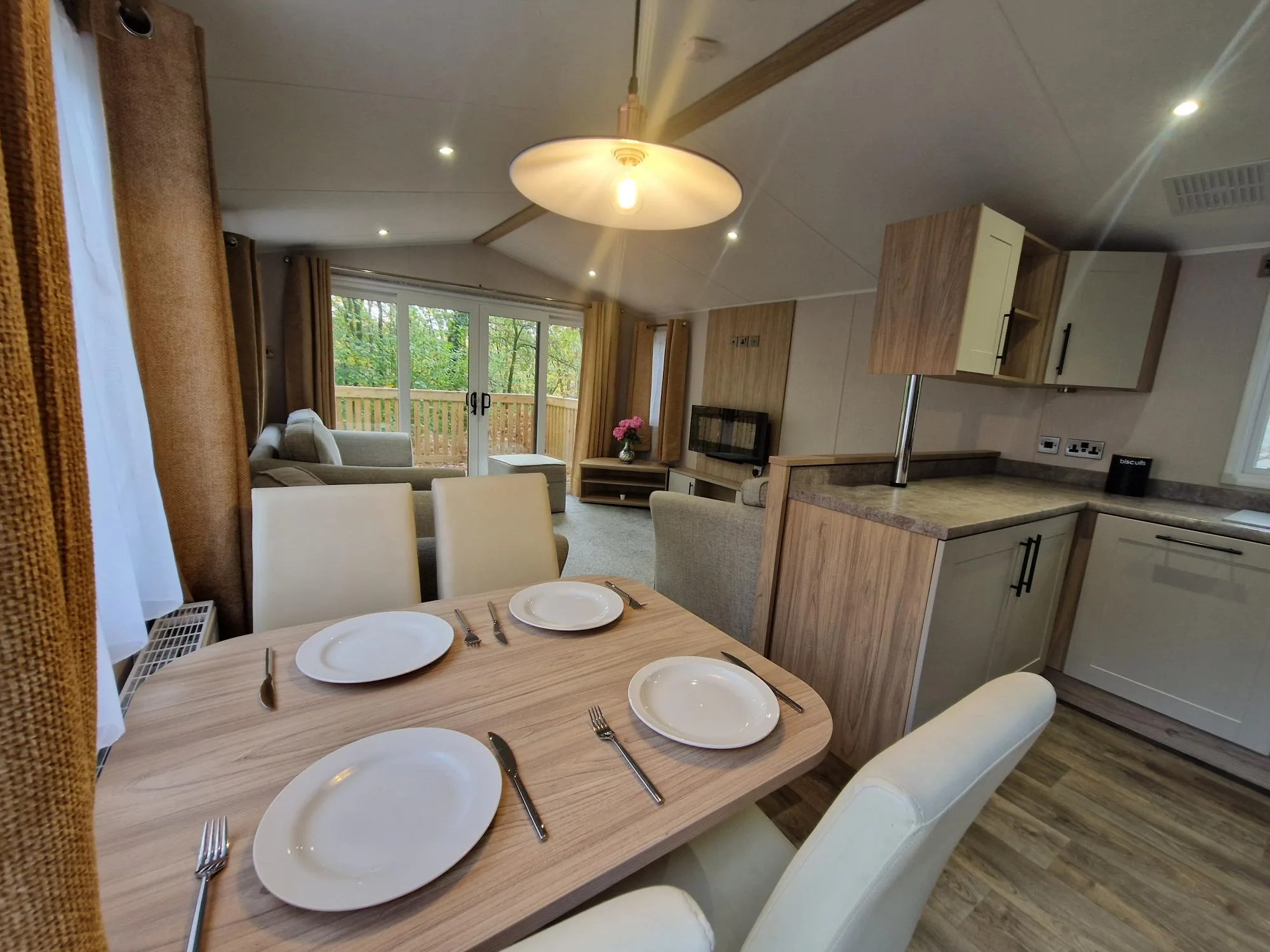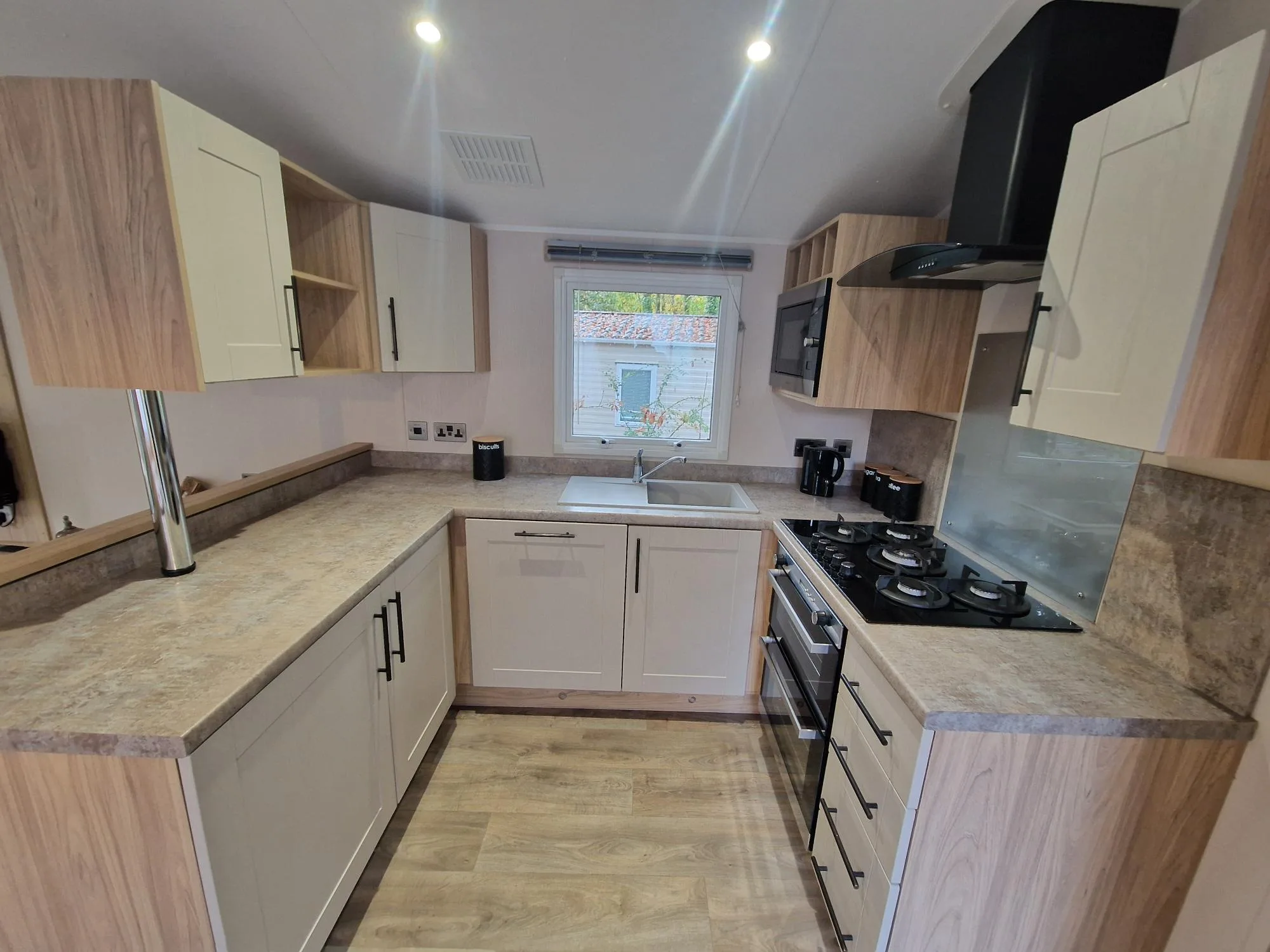 The spacious interior includes an integrated fridge-freezer, a rear projection fire, and freestanding furniture that adds to its contemporary charm. The master bedroom is a true retreat, complete with an en-suite for added convenience and comfort. The highlight of this Manor is its beautiful wraparound decking, offering the perfect space to relax and take in your surroundings.