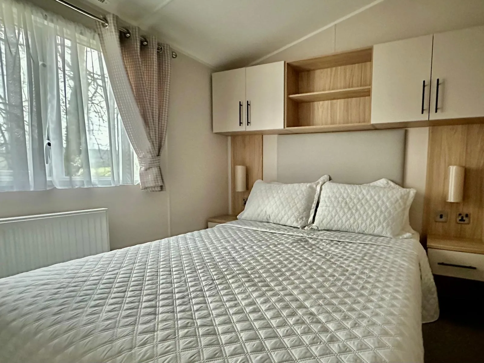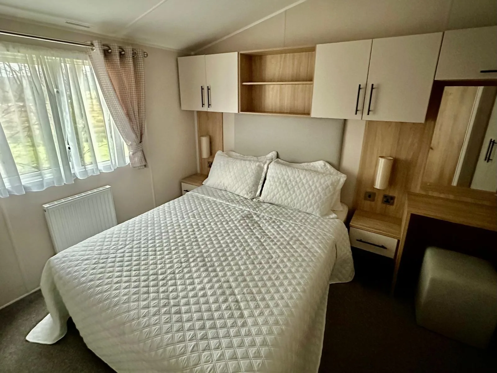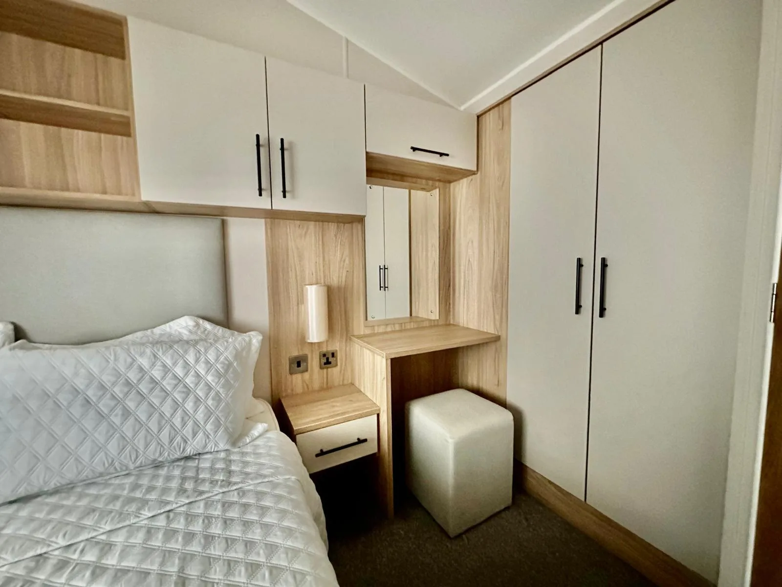 In the two-bedroom models, the main bedroom boasts a luxurious king-size bed with clever lift-up storage. You’ll also find a full-size wardrobe, integrated storage solutions, and a vanity unit with mirror — perfect for getting ready for a night out, complete with a convenient en-suite WC.