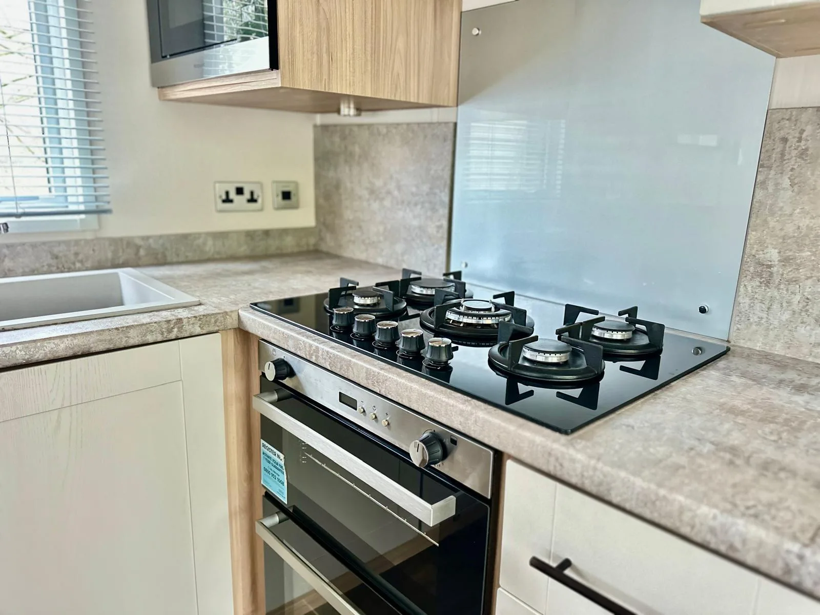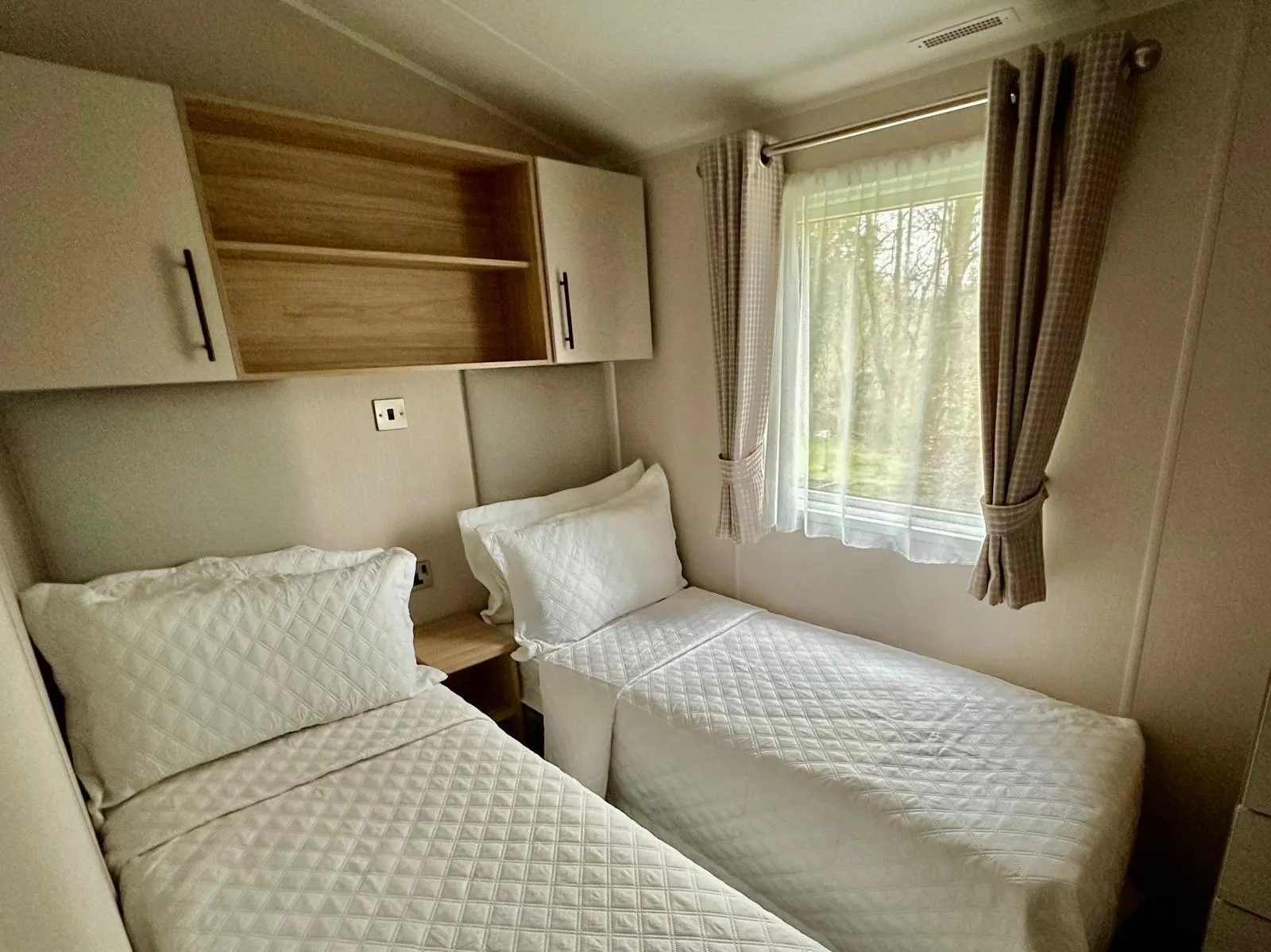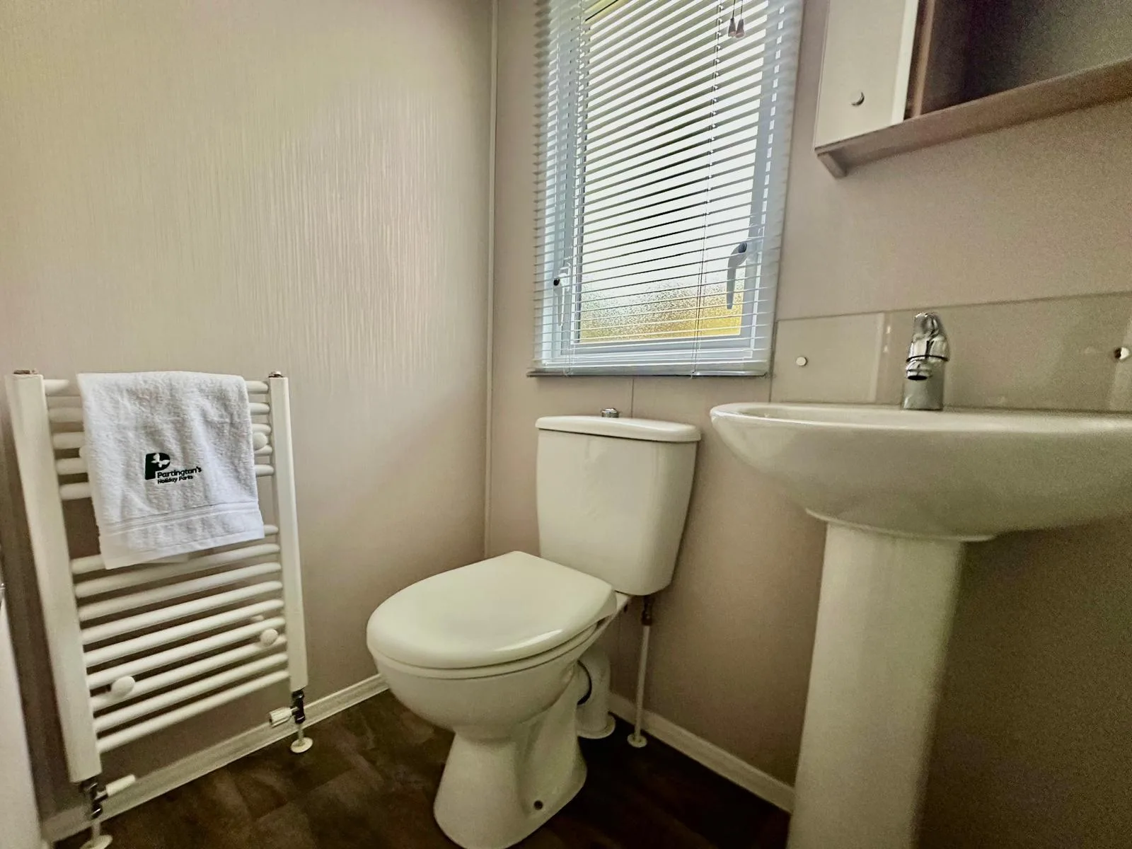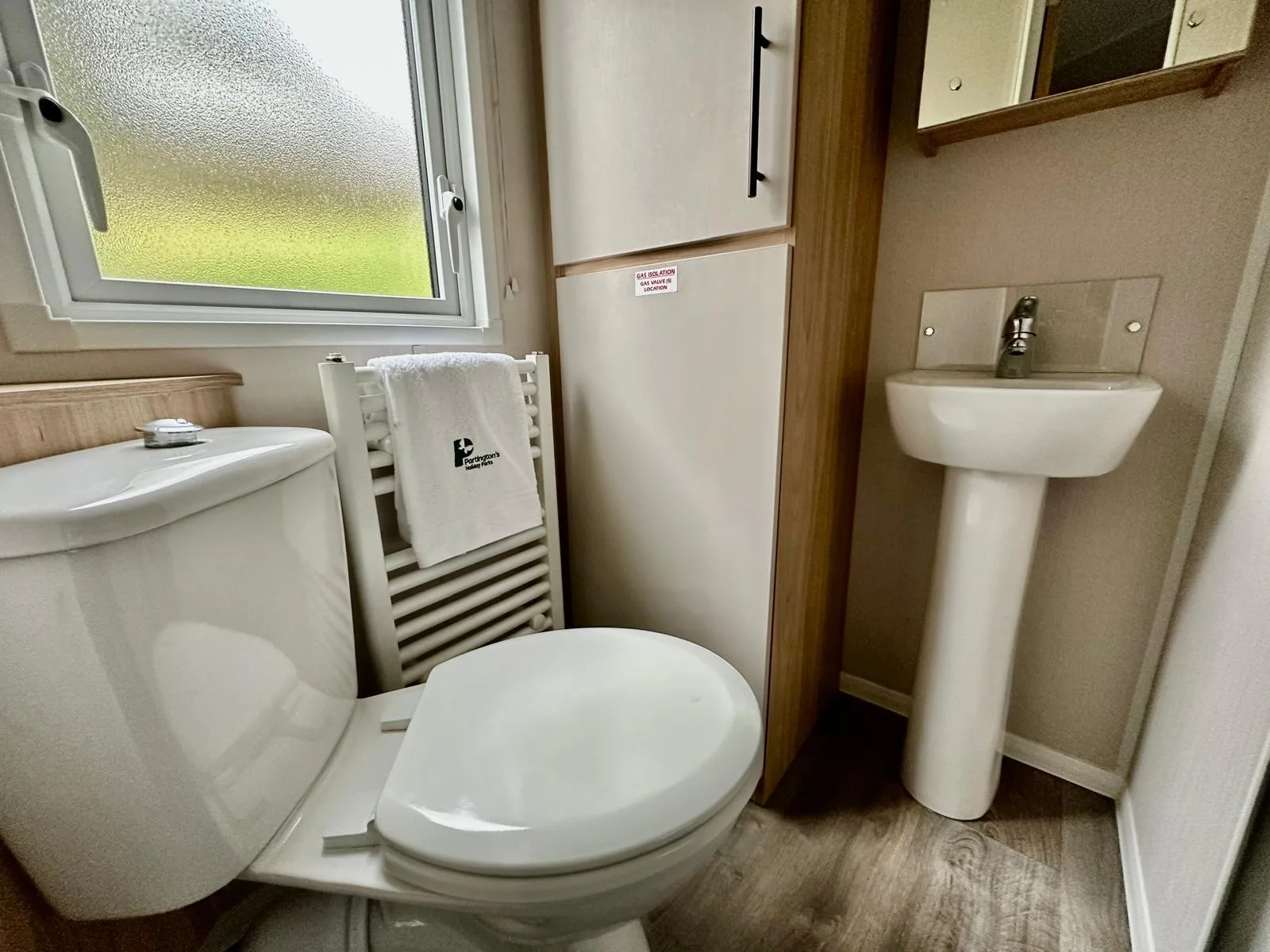 In the two-bedroom models, the main bedroom boasts a luxurious king-size bed with clever lift-up storage. You’ll also find a full-size wardrobe, integrated storage solutions, and a vanity unit with mirror — perfect for getting ready for a night out, complete with a convenient en-suite WC.