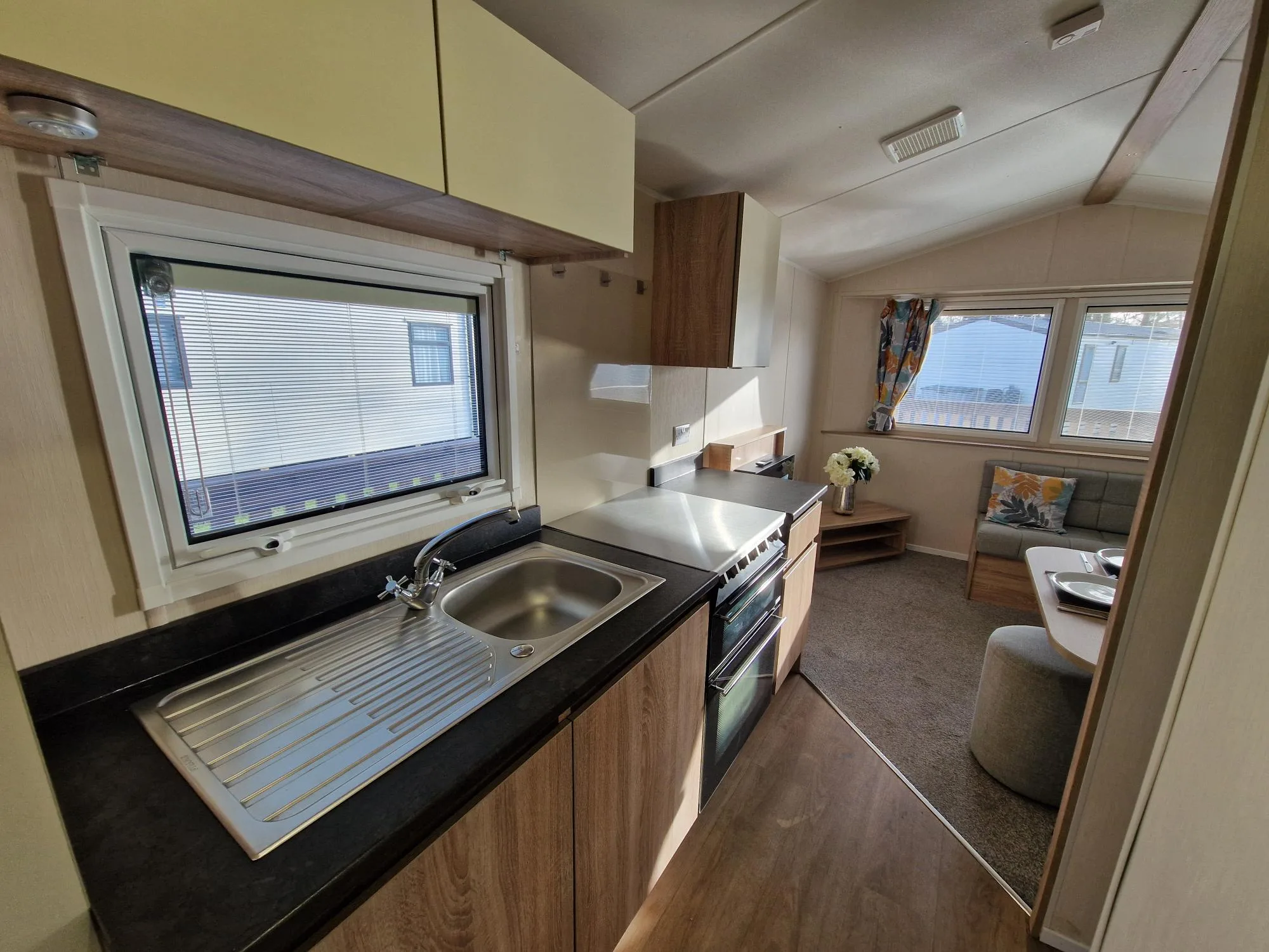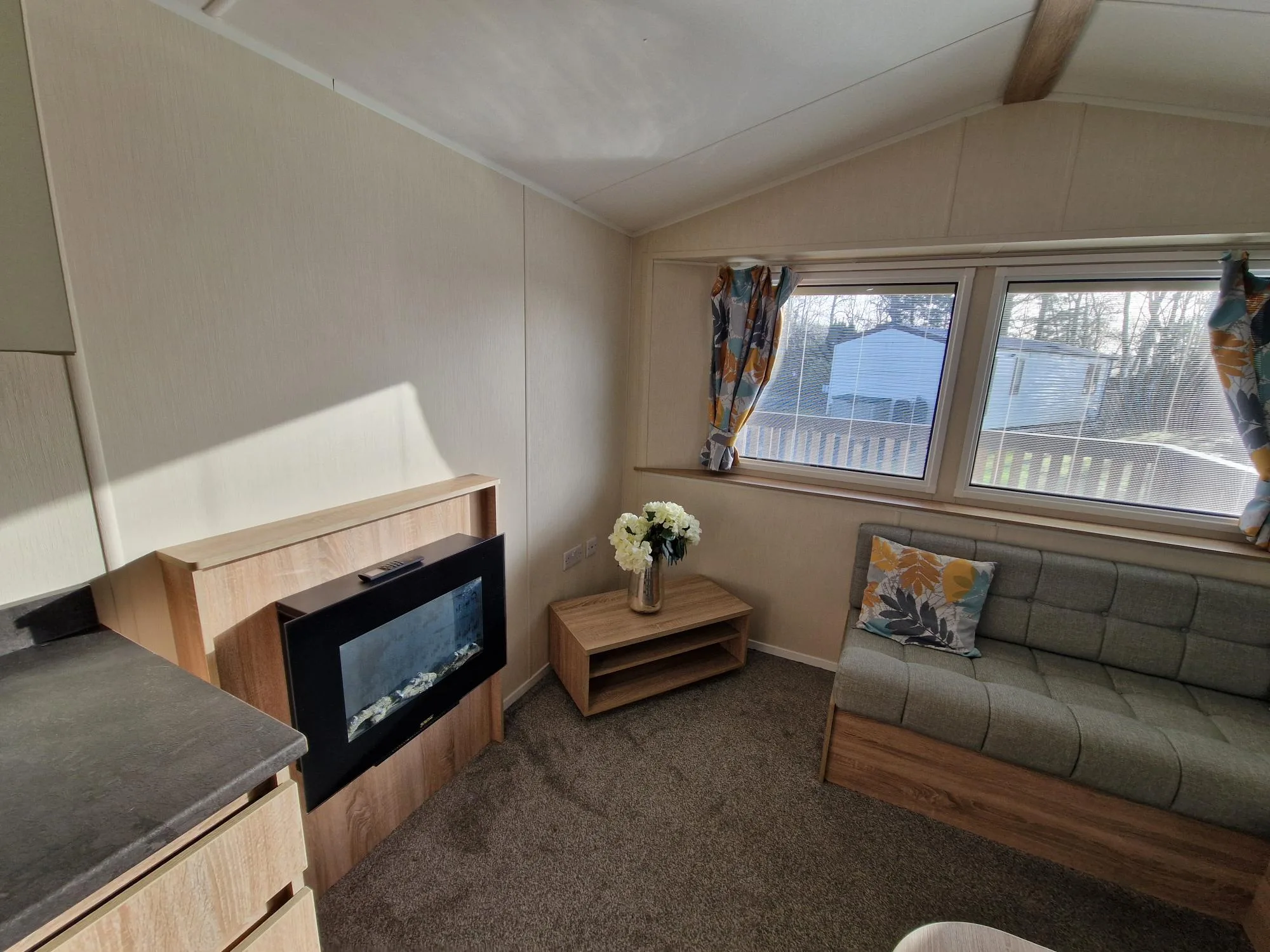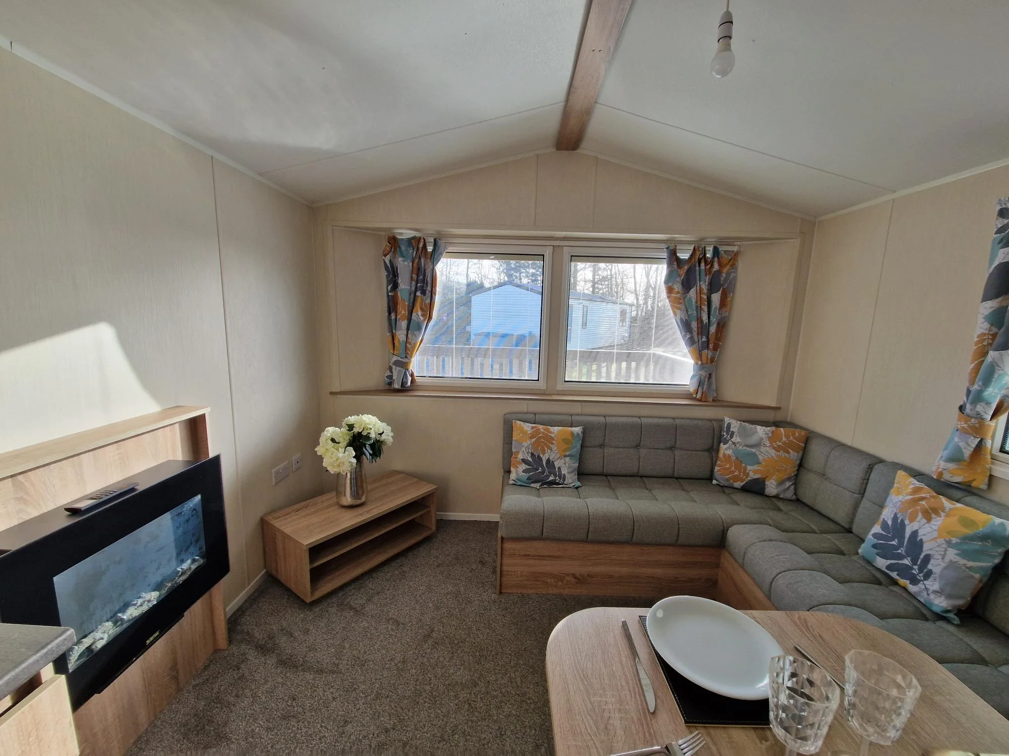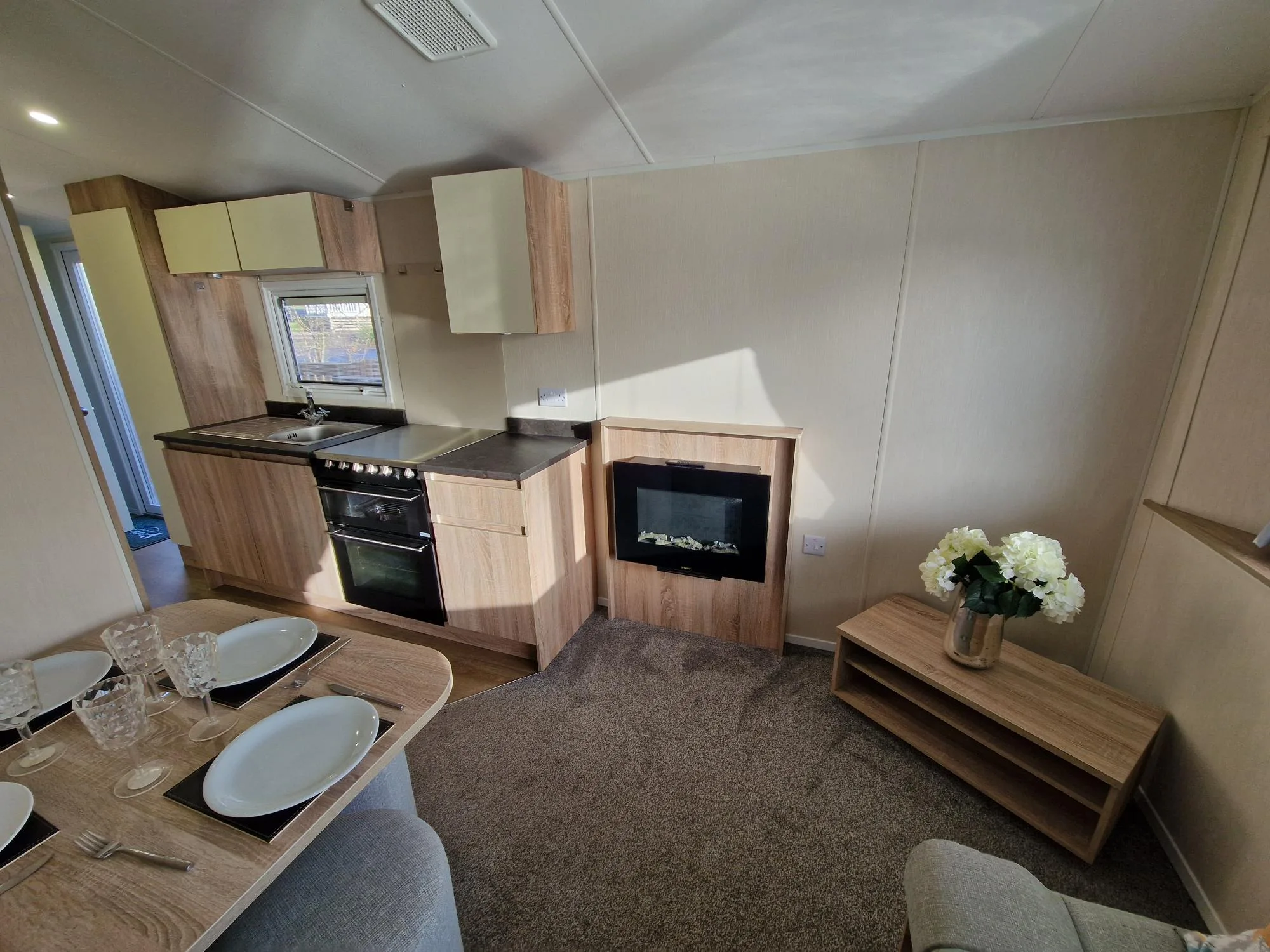 The open-plan living area is bright and inviting, featuring a cosy L-shaped sofa with an electric fire, free-standing TV unit, and a dining area with a 4-seater table. The galley-style kitchen is fully equipped with a gas cooker, hob, and plenty of storage, including space for a fridge/freezer and microwave.