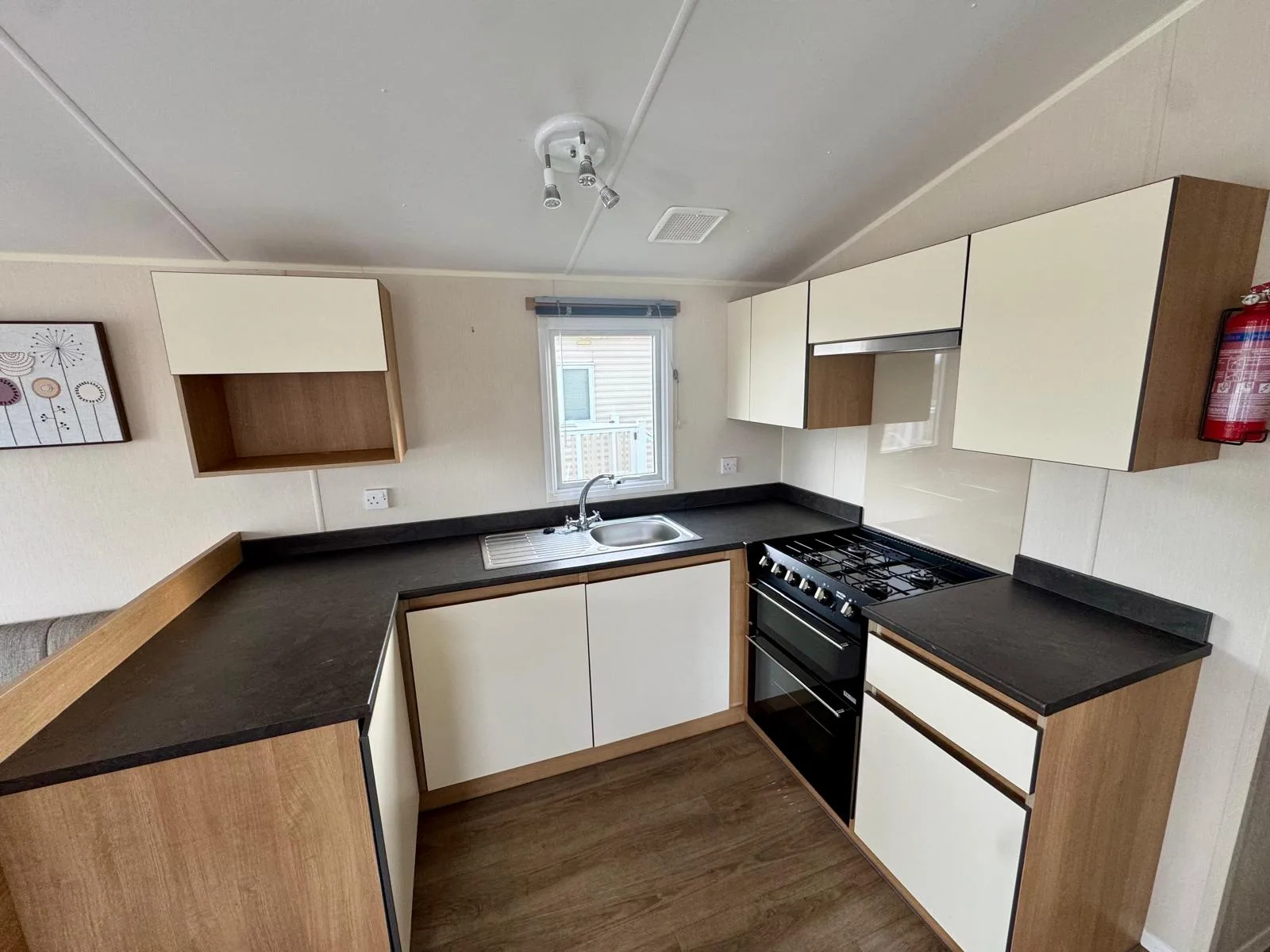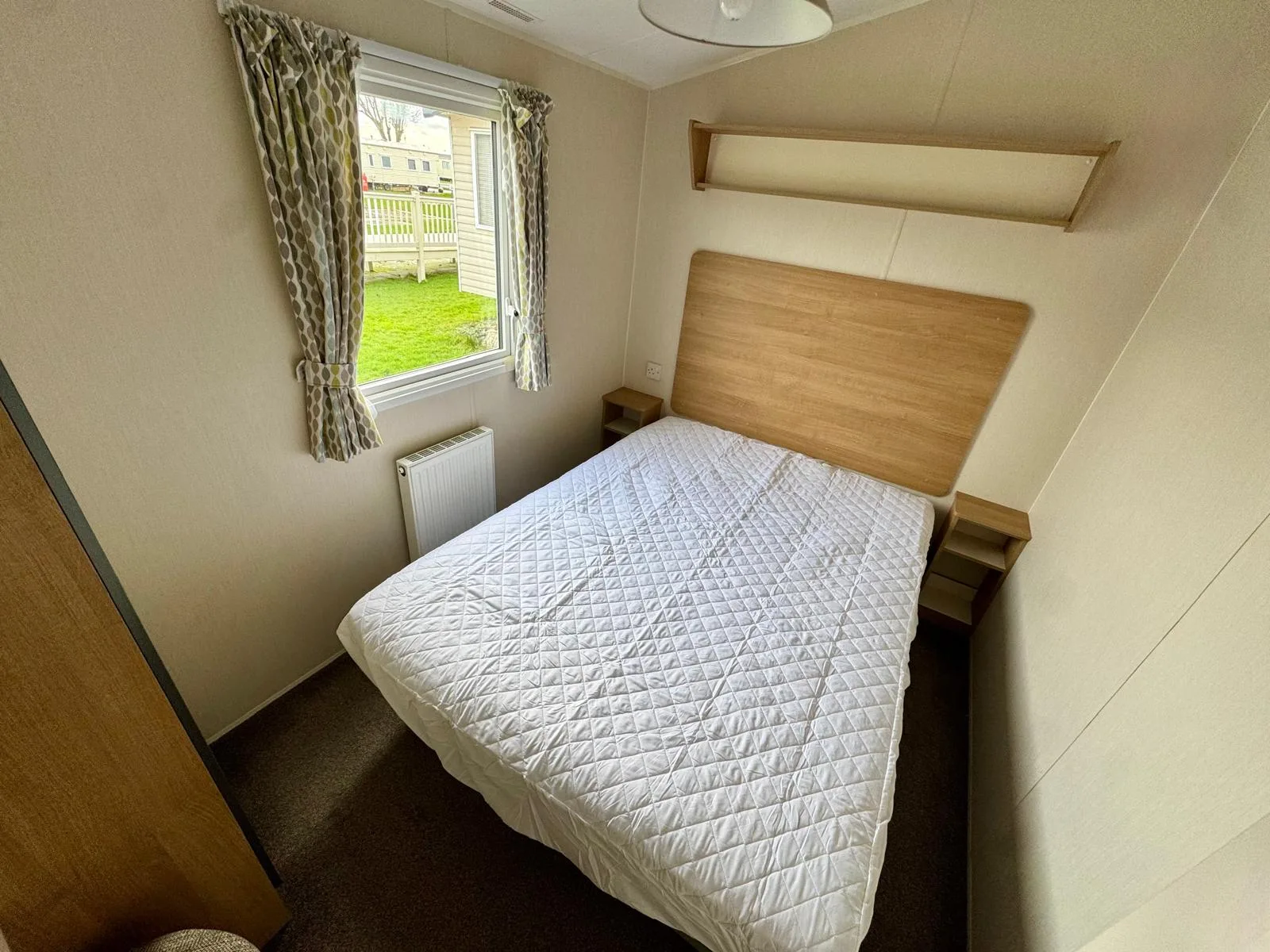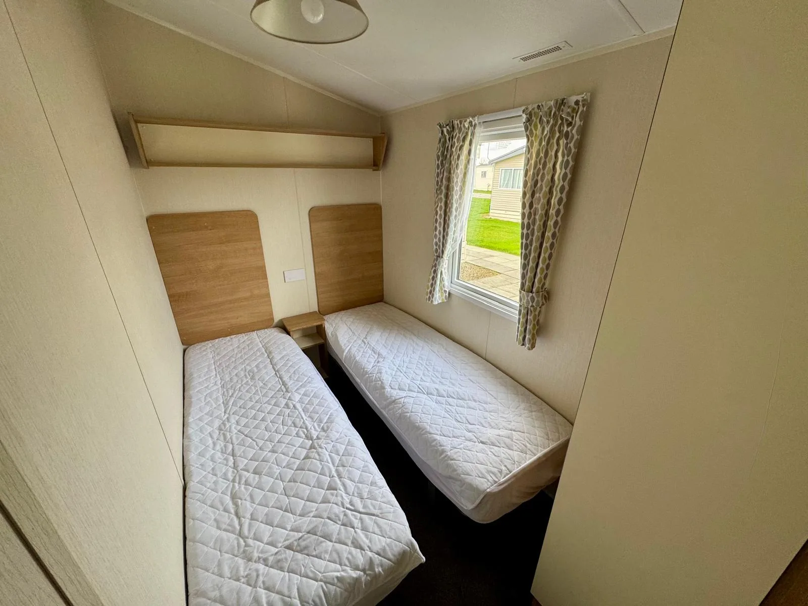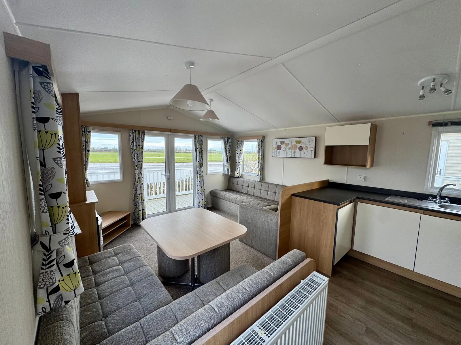 This open-plan static caravan is designed for comfort, featuring gas central heating and a bright, neutral interior that feels inviting and spacious. The wraparound sofa in the lounge offers plenty of room to relax, while the fully fitted kitchen is well-equipped with ample storage, perfect for family meals. The master bedroom is generously sized, with a bright and cosy twin room nearby. A convenient WC completes the layout, offering practical and comfortable living for all.