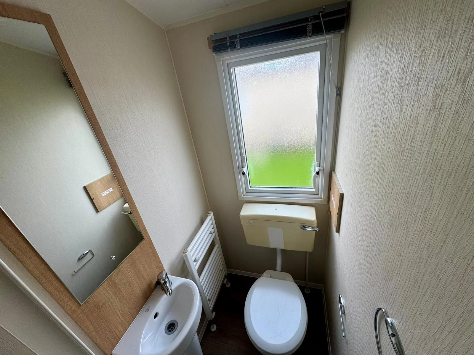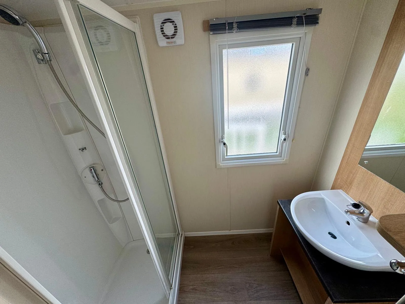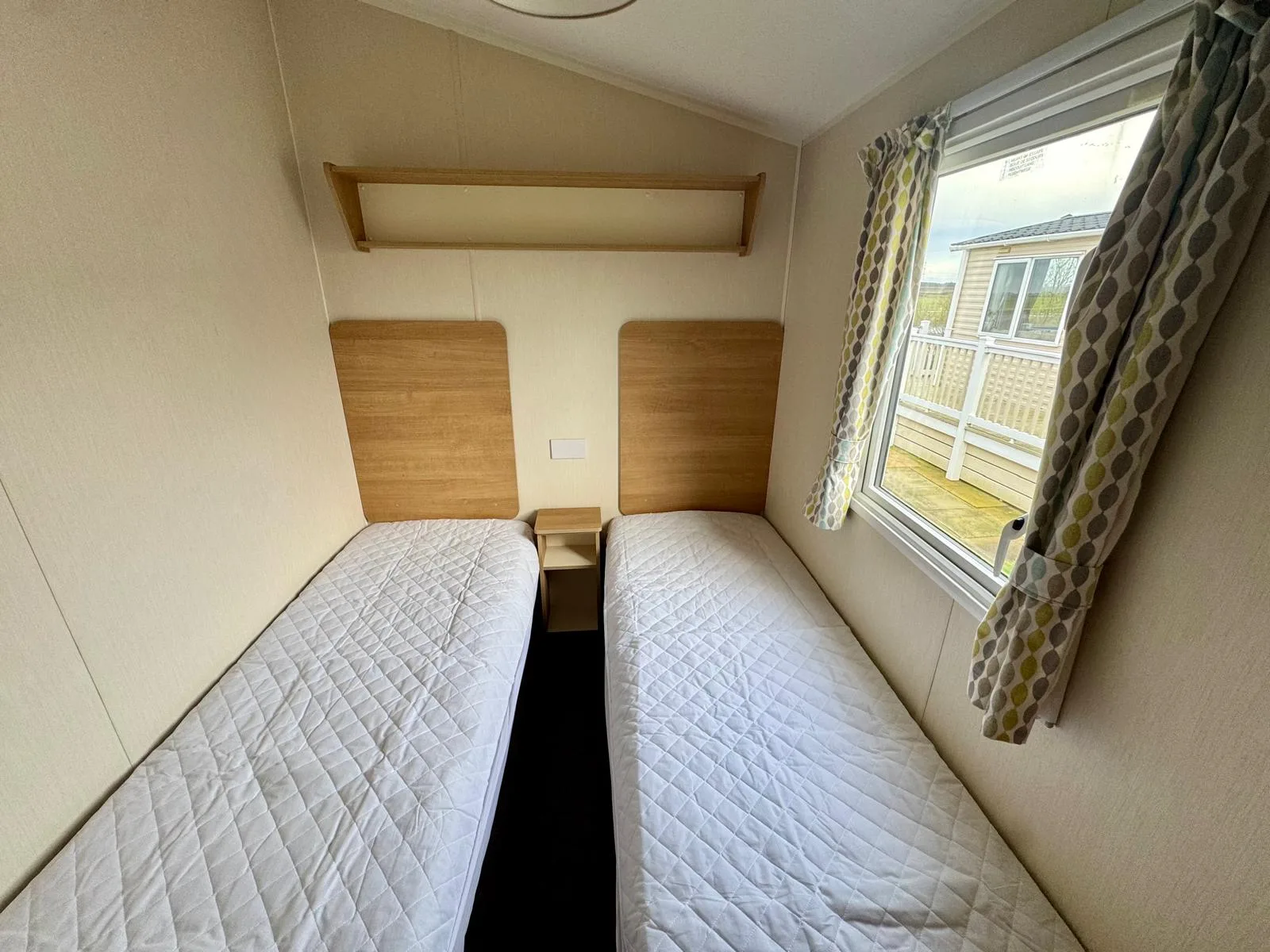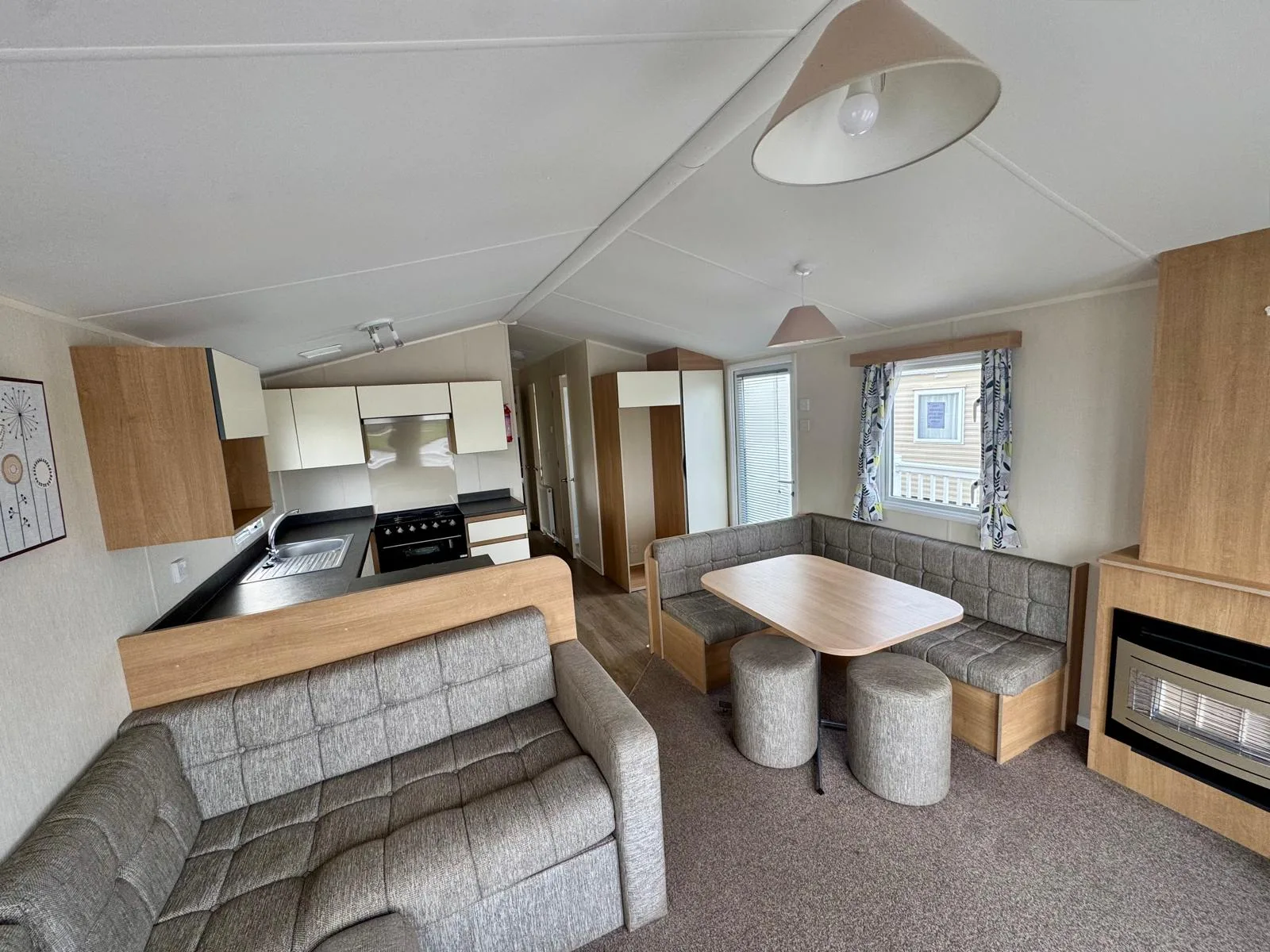 This open-plan static caravan is designed for comfort, featuring gas central heating and a bright, neutral interior that feels inviting and spacious. The wraparound sofa in the lounge offers plenty of room to relax, while the fully fitted kitchen is well-equipped with ample storage, perfect for family meals. The master bedroom is generously sized, with a bright and cosy twin room nearby. A convenient WC completes the layout, offering practical and comfortable living for all.