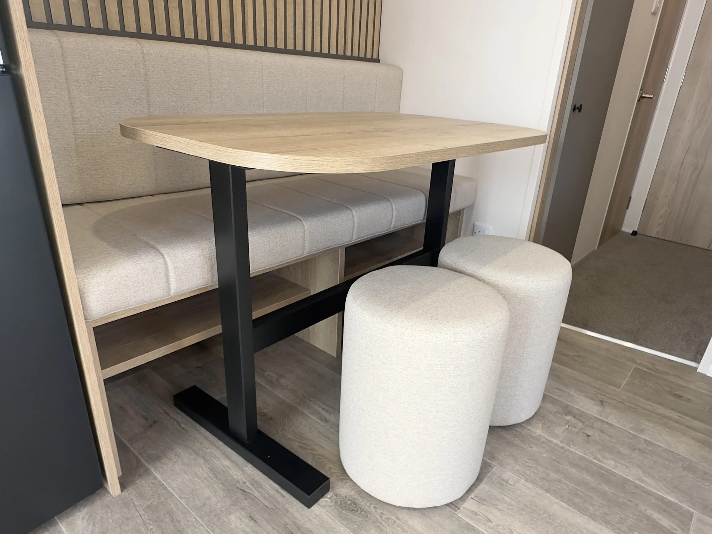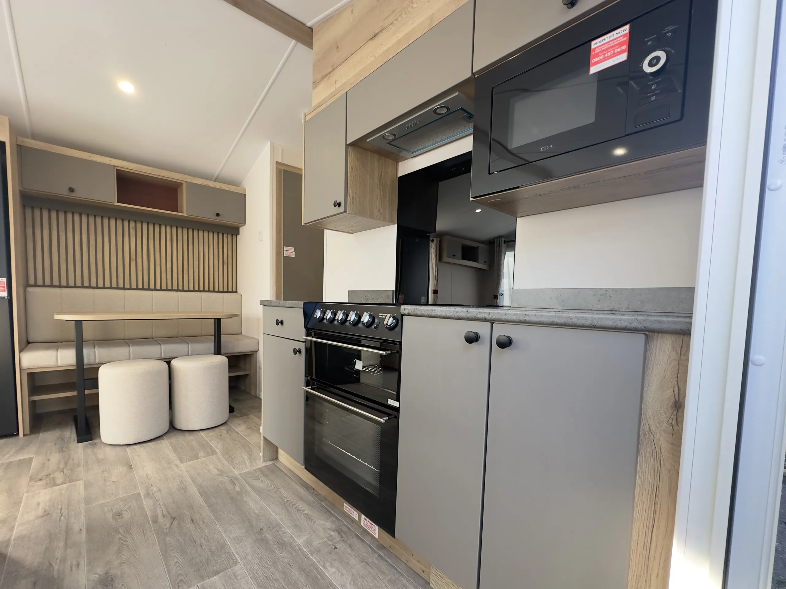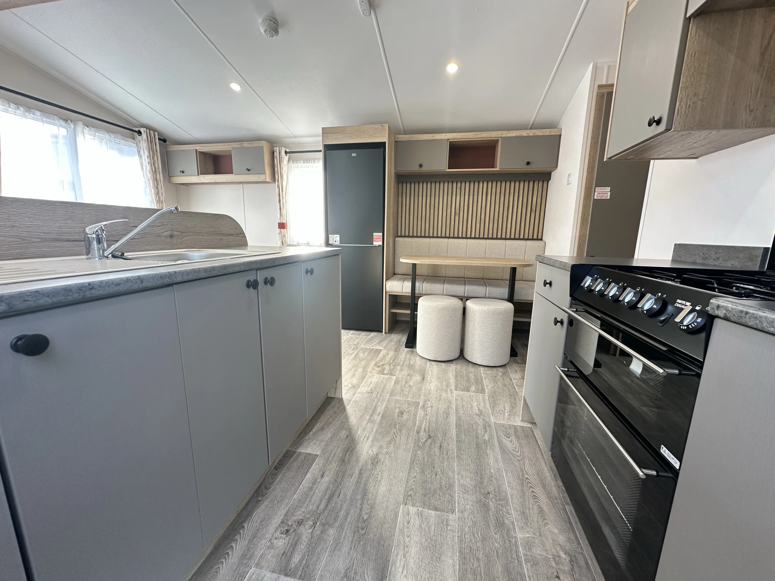 Perfectly positioned by the entrance, the Rio’s kitchen keeps everything within easy reach, while the open-plan layout connects the dinette and lounge so you’re always part of the action. Finished with soft grey cabinets, oak-effect worktops, a sleek black splash back, and stylish feature paneling, it blends practicality with modern style.