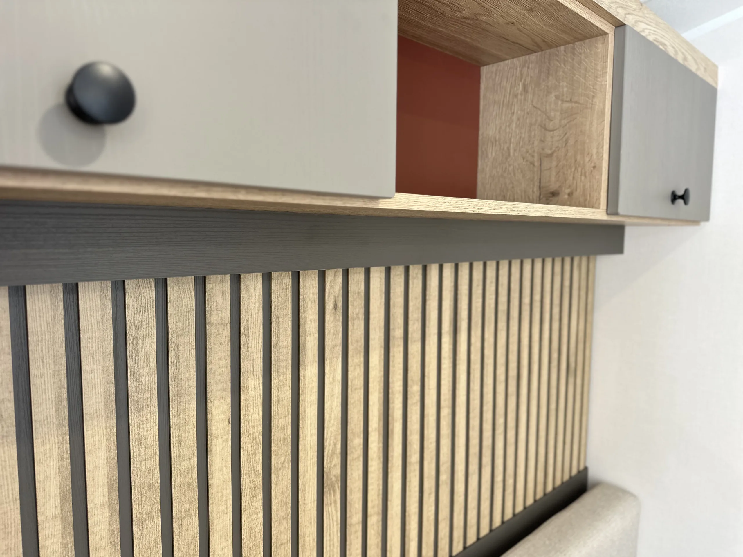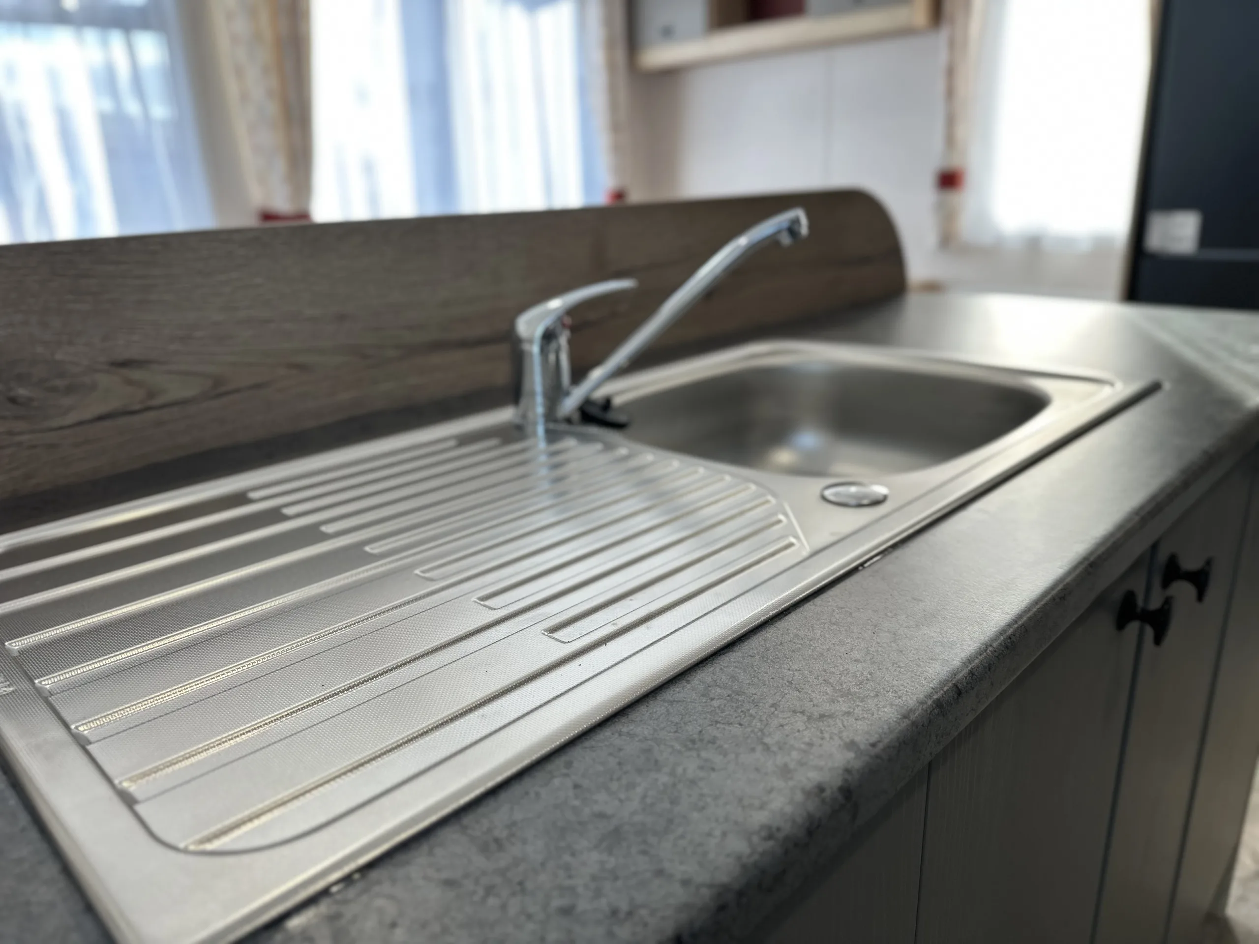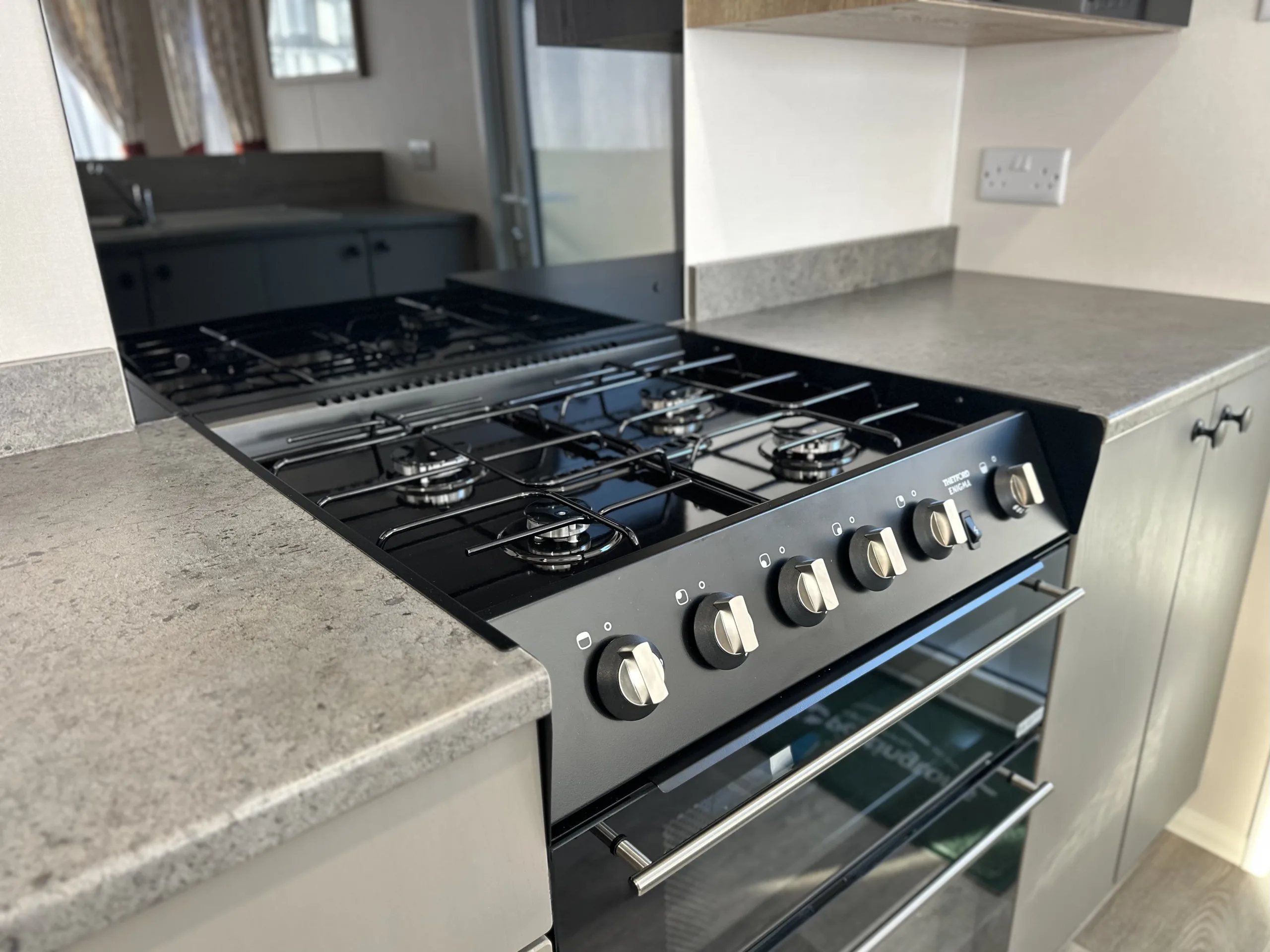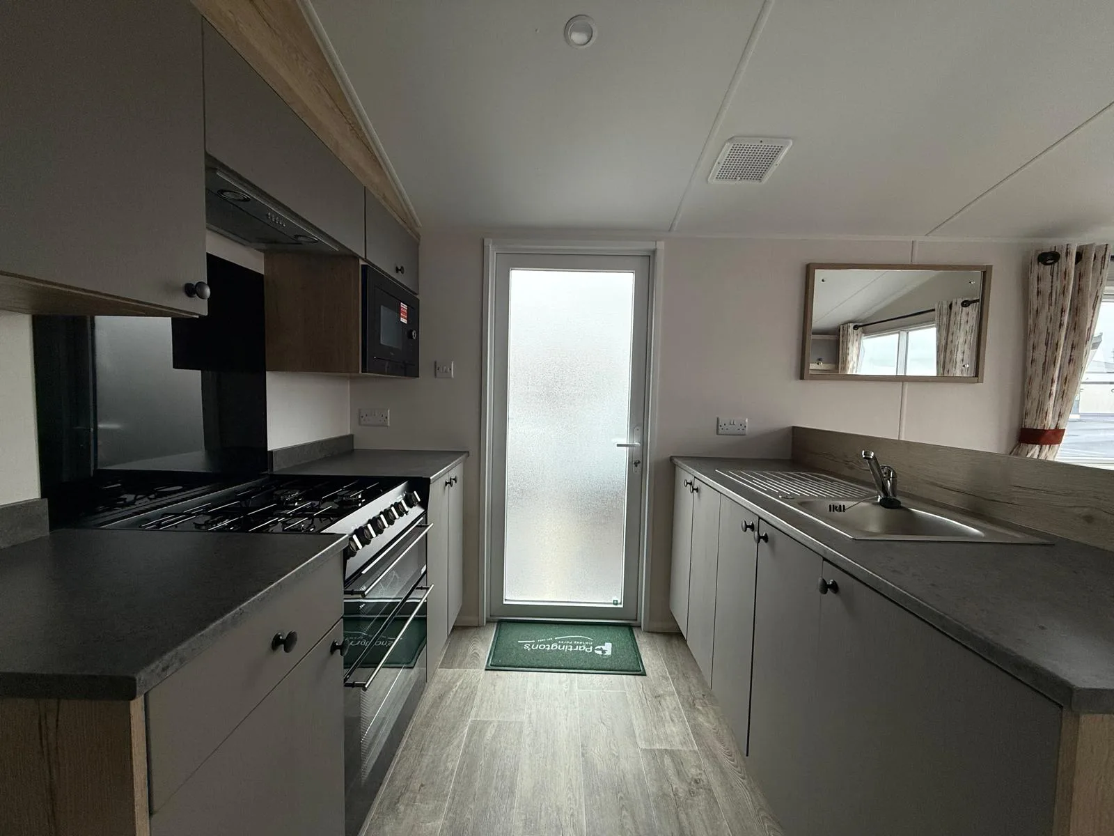 Perfectly positioned by the entrance, the Rio’s kitchen keeps everything within easy reach, while the open-plan layout connects the dinette and lounge so you’re always part of the action. Finished with soft grey cabinets, oak-effect worktops, a sleek black splash back, and stylish feature paneling, it blends practicality with modern style.