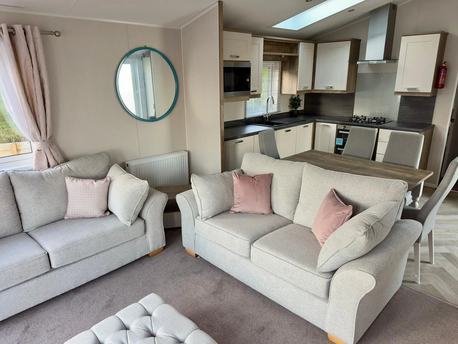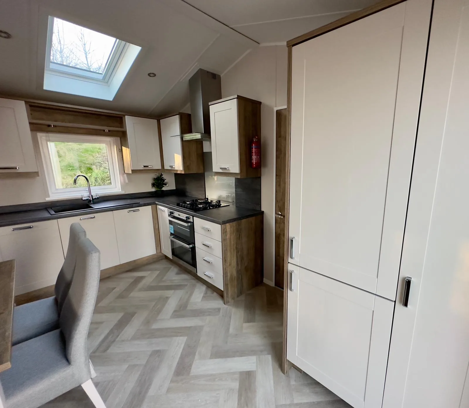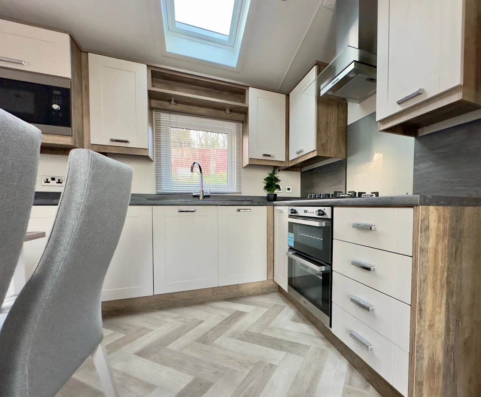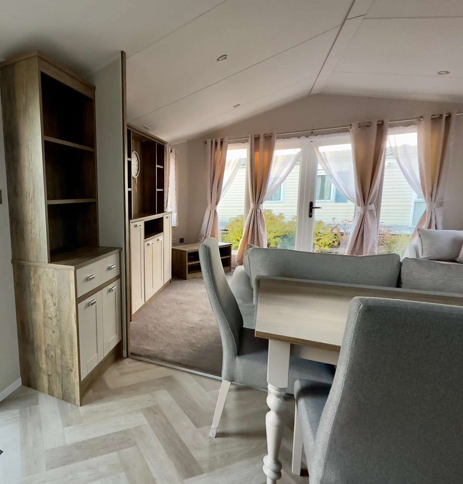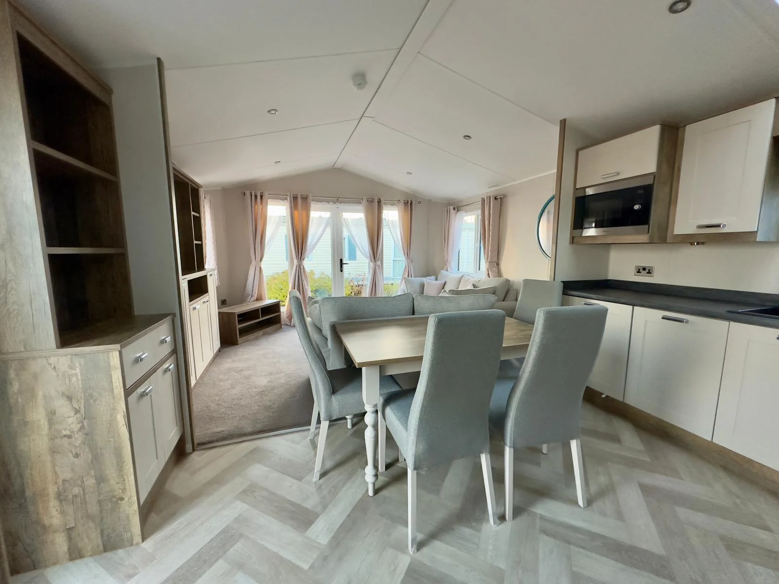 The Willerby Sheraton is contemporary, spacious and the ideal place to unwind with family and friends. You’ll love the heritage feel with the feature oak wood effect throughout. Lounge includes comfy two seater sofas with matching large footstool, modern fitted units and double patio doors. Leading to fully fitted kitchen with modern integrated appliances, plenty of workspace and storage. Freestanding dining table plus four upholstered chairs.