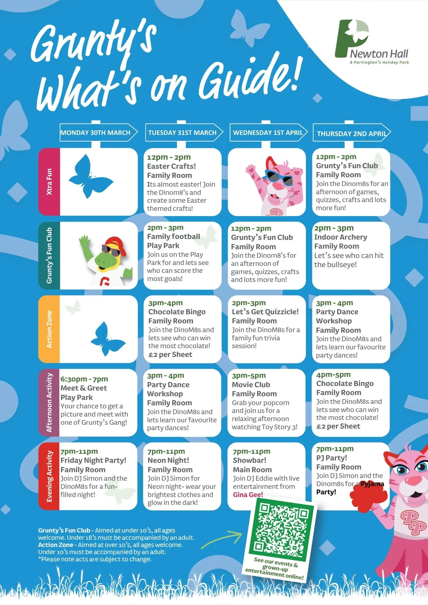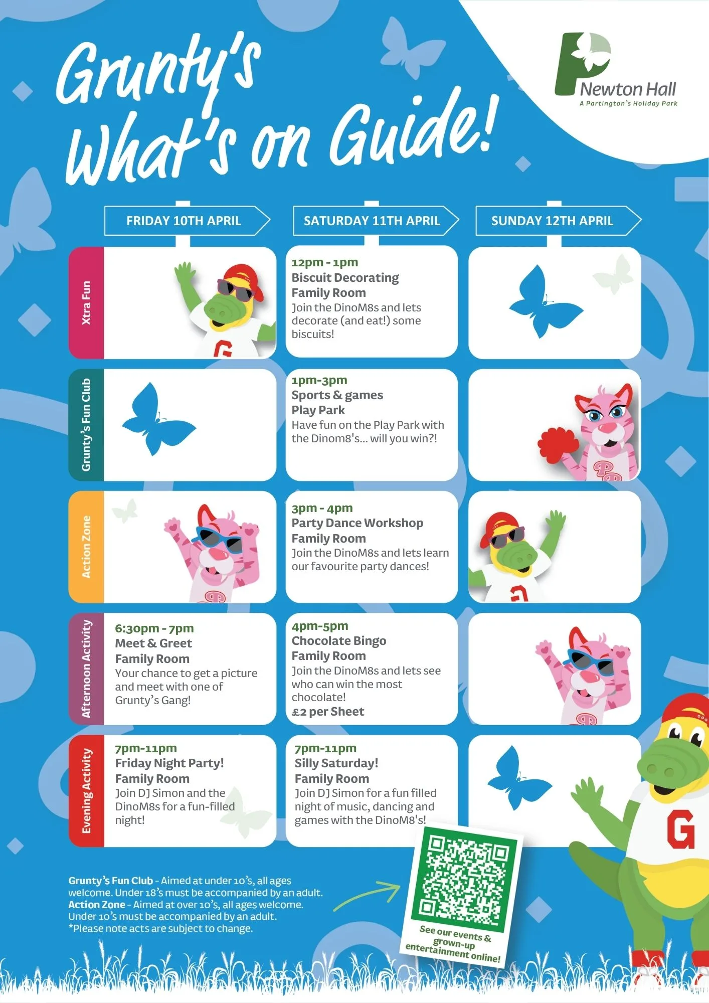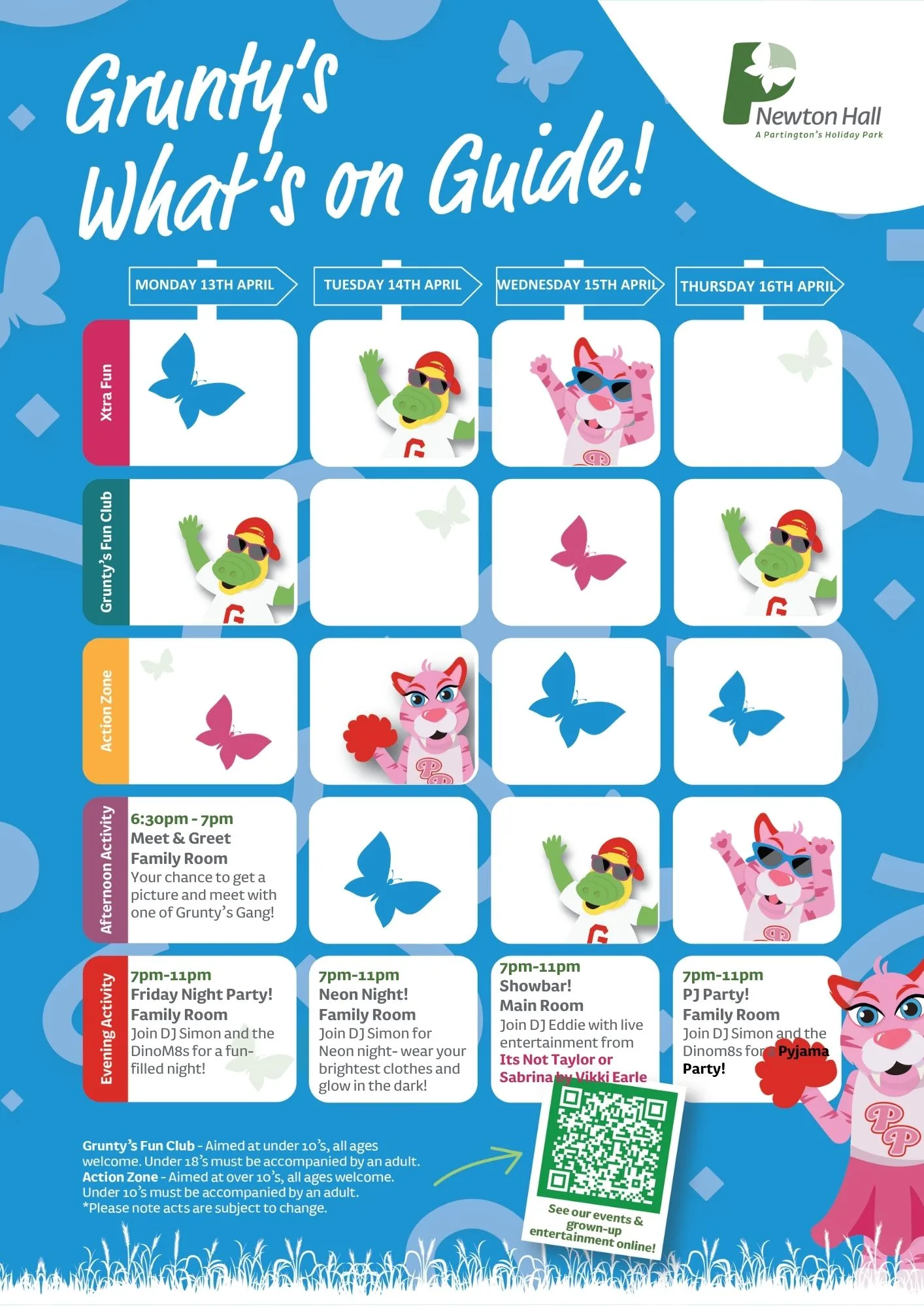 Join us at Newton Hall Holiday Park this April for a packed programme of entertainment and activities! From family fun to evening shows, there’s something for everyone to enjoy during your Partington’s stay.