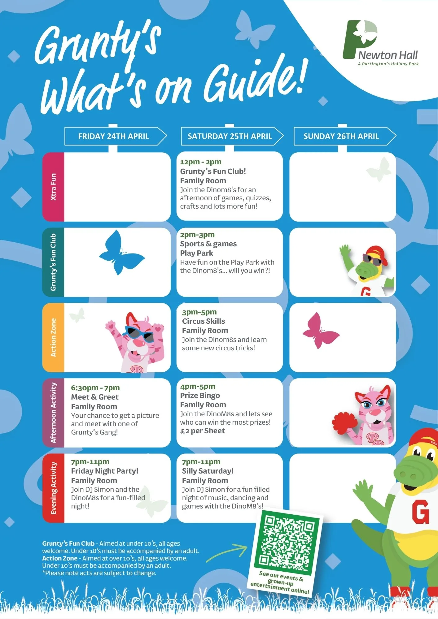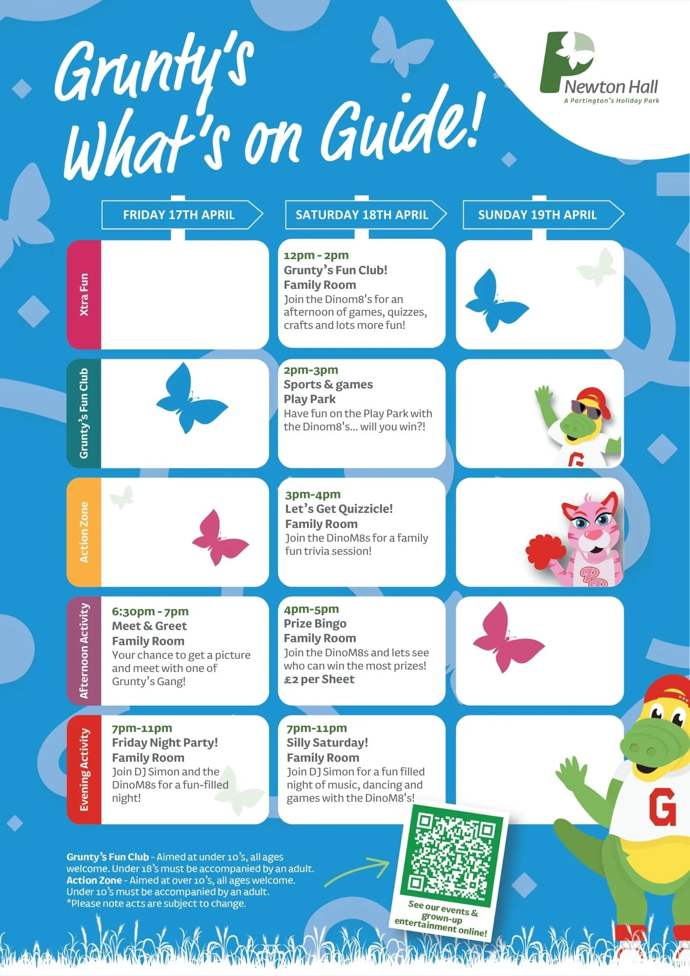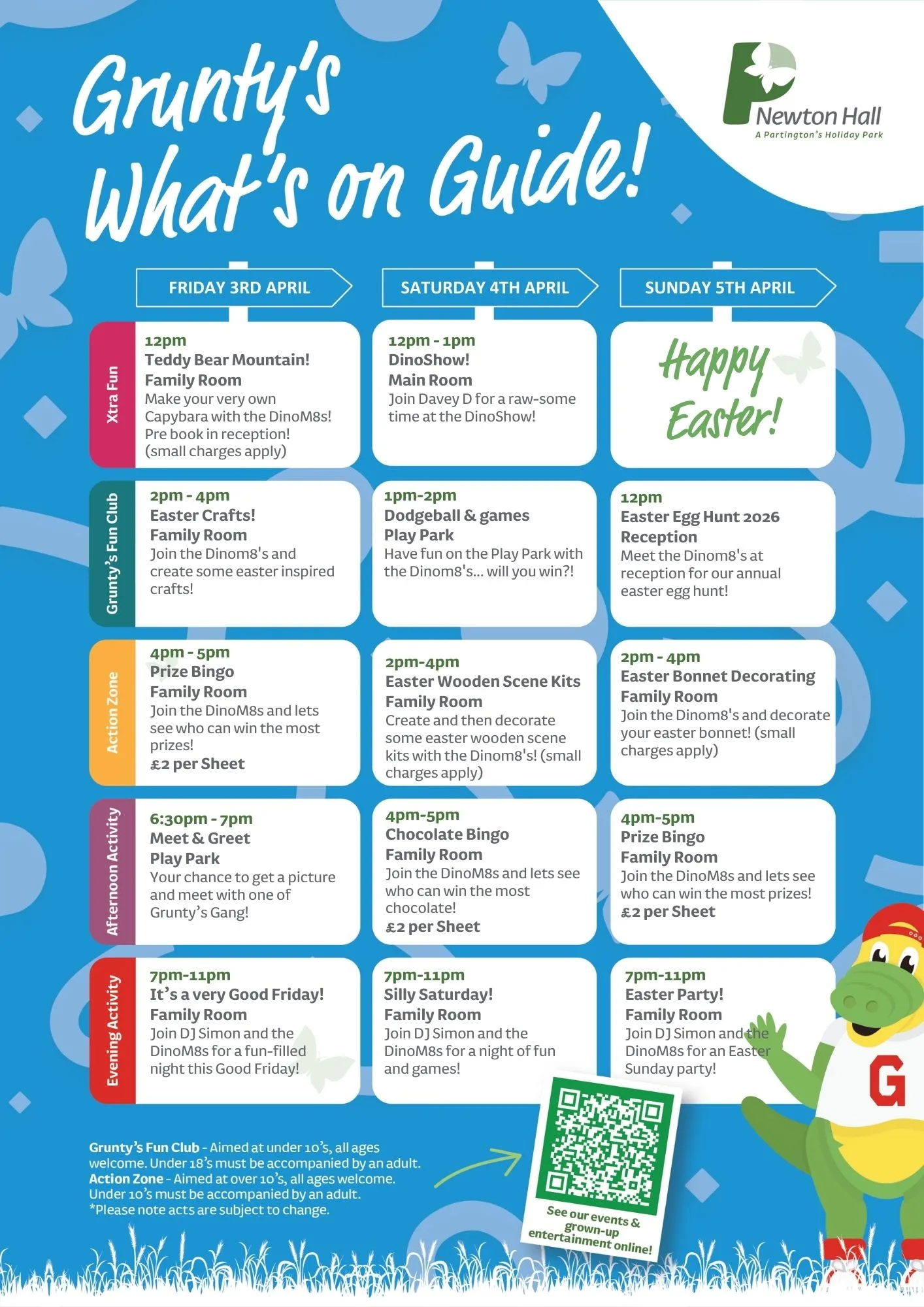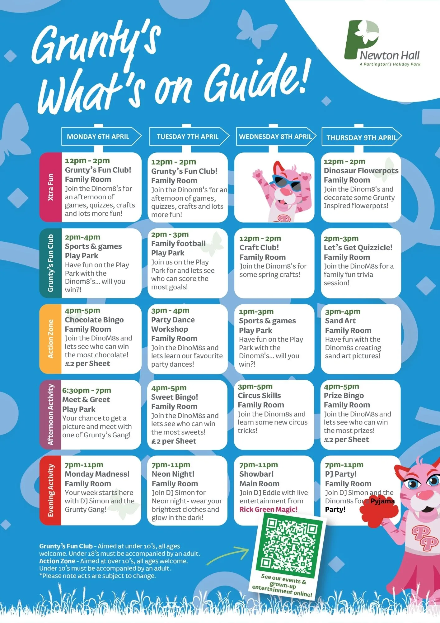Join us at Newton Hall Holiday Park this April for a packed programme of entertainment and activities! From family fun to evening shows, there’s something for everyone to enjoy during your Partington’s stay.