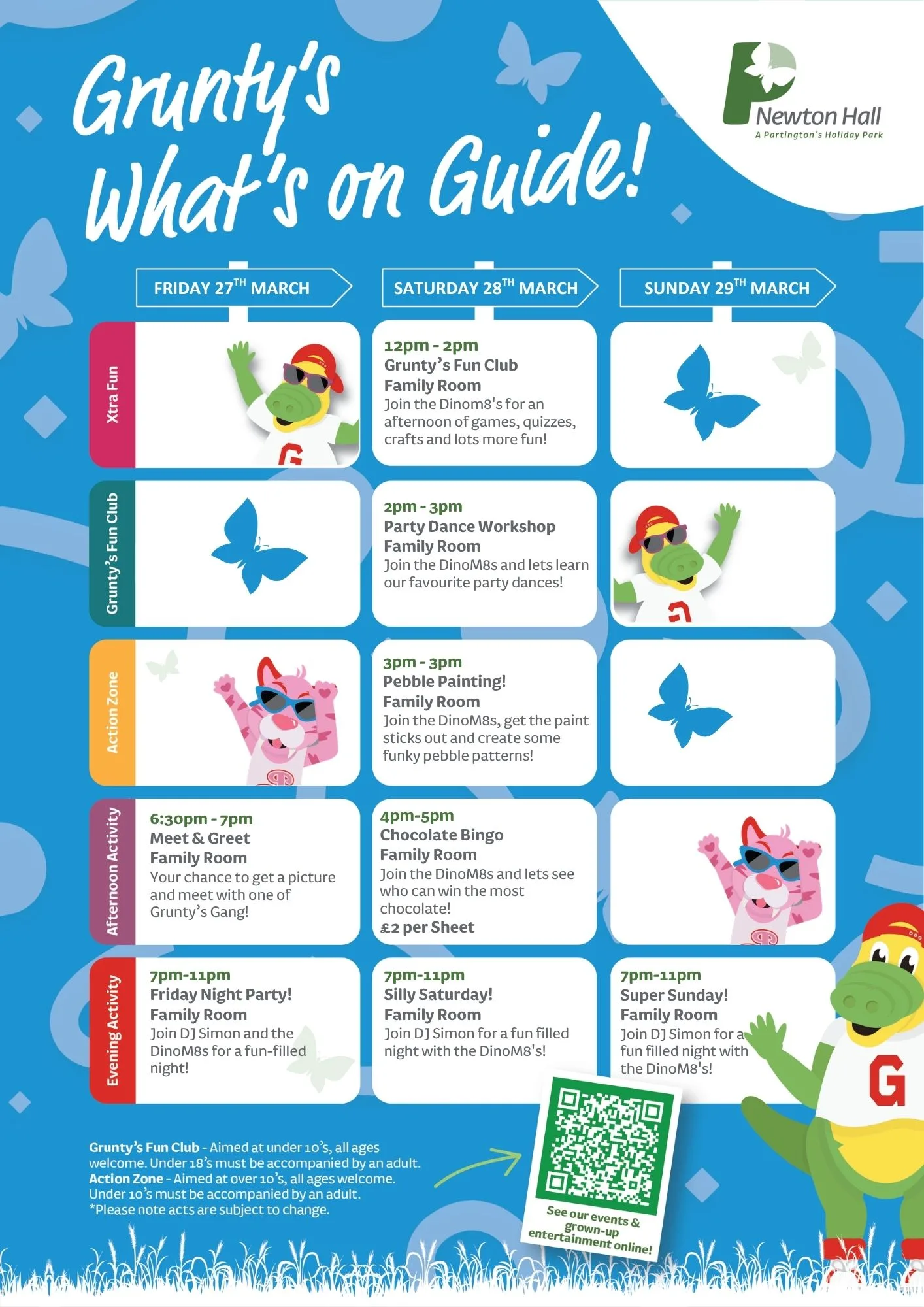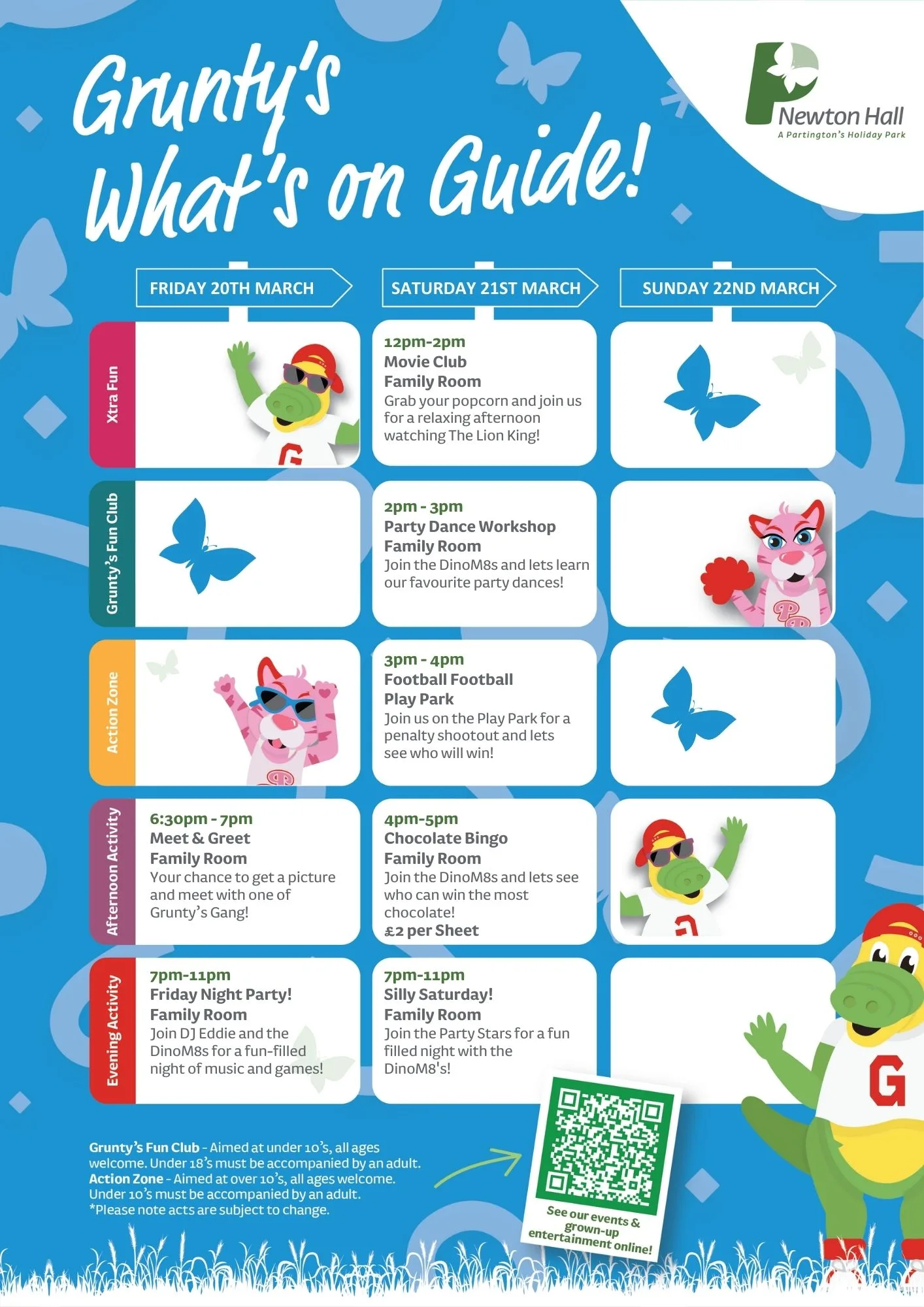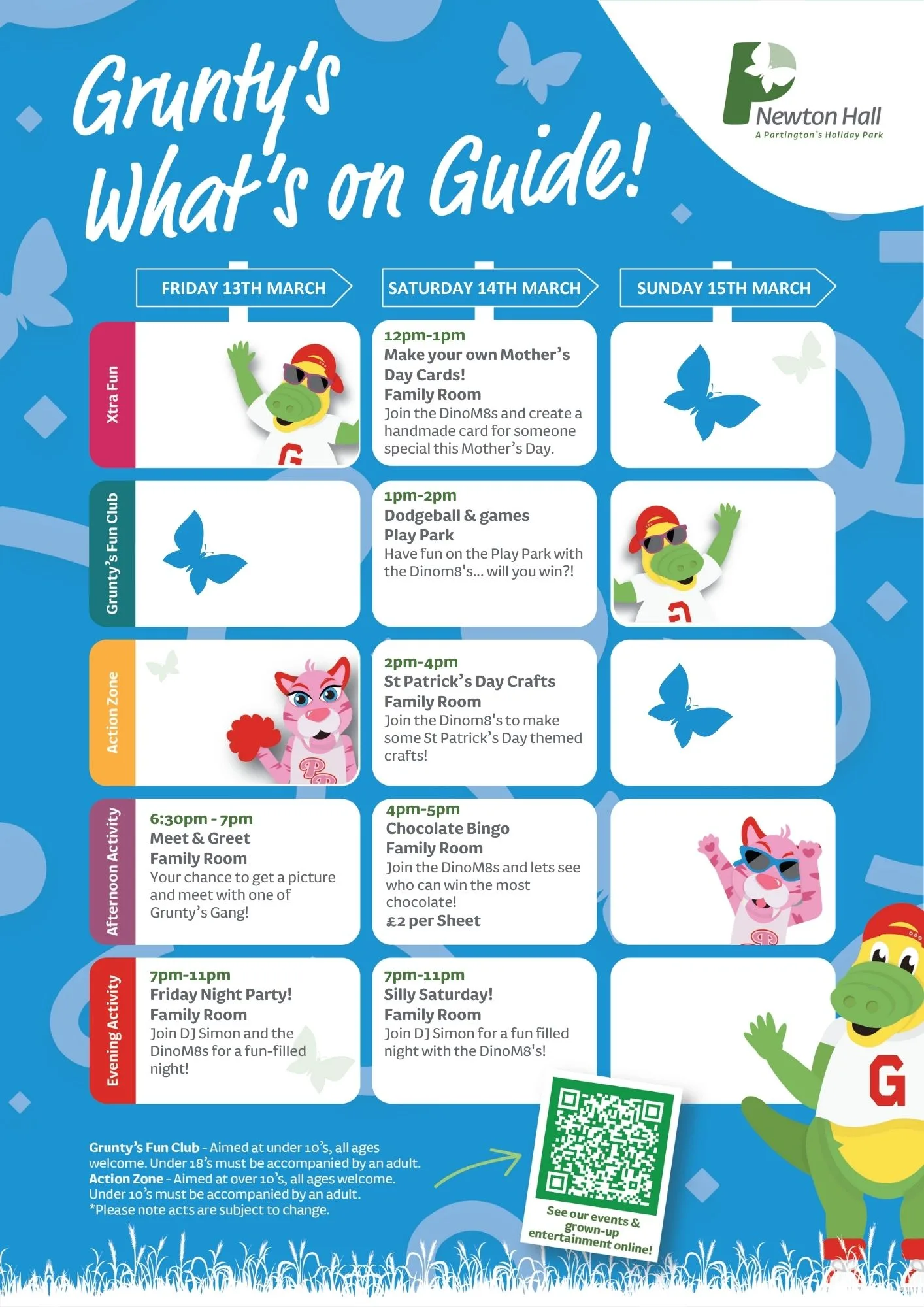 Join us at Newton Hall Holiday Park this March for a packed programme of entertainment and activities! From family fun to evening shows, there’s something for everyone to enjoy during your Partington’s stay.